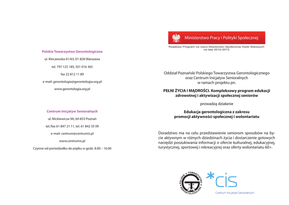 Ministerstwo Pracy i Polityki Społecznej Polskie Towarzystwo Gerontologiczne Rządowy Program na rzecz Aktywności Społecznej Osób Starszych na lata 2012-2013 ul. Kleczewska 61/63, 01-826 Warszawa tel. 797 125 185, 501 016 365 fax 22 812 11 89 e-mail: [email protected] www.gerontologia.org.pl Oddział Poznański Polskiego Towarzystwa Gerontologicznego oraz Centrum Inicjatyw Senioralnych w ramach projektu pn. PEŁNI ŻYCIA I MĄDROŚCI. Kompleksowy program edukacji zdrowotnej i aktywizacji społecznej seniorów prowadzą działanie Centrum Inicjatyw Senioralnych ul. Mickiewicza 9A, 60-833 Poznań Edukacja gerontologiczna z zakresu promocji aktywności społecznej i wolontariatu tel./fax 61 847 21 11, tel. 61 842 35 09 e-mail: [email protected] www.centrumis.pl Czynne od poniedziałku do piątku w godz. 8.00 – 16.00 Doradztwo ma na celu przedstawienie seniorom sposobów na bycie aktywnym w różnych dziedzinach życia i dostarczenie gotowych narzędzi poszukiwania informacji o ofercie kulturalnej, edukacyjnej, turystycznej, sportowej i rekreacyjnej oraz oferty wolontariatu 60+. Aktywność społeczna osób starszych Źródła informacji o edukacyjnej i kulturalnej ofercie dla seniorów w Poznaniu: • Punkt Informacji 50+: na stronie www.centrumis.pl, osobiście w siedzibie CentrumIS na ul. Mickiewicza 9A lub telefonicznie 61 842 35 09 • Newsletter CentrumIS – zapisać się można na stronie www.centrumis.pl, wysyłany w każdy piątek • Rubryka „CentrumIS i Głos Wielkopolski polecają” w środowym dodatku 50+ w Głosie Wielkopolskim • „Czerwony Portfelik Senior” (dwumiesięcznik), www.czerwonyportfelik.pl, wydanie papierowe dostępne jest w CentrumIS, klubach seniora, organizacjach pozarządowych i in. • Ulotka zawierająca miesięczny program wydarzeń – przygotowywana na początku każdego miesiąca, dostępna w siedzibie CentrumIS i za pośrednictwem wolontariuszy informacyjnych oraz Centrum Informacji Miejskiej • Miejsca Przyjazne Seniorom – certyfikowane przez CentrumIS miejsca, takie jak kawiarnie, kina, firmy szkoleniowe i rekreacyjne, które poprzez ofertę w postaci dedykowanych wydarzeń czy zniżek, stają się przyjazne seniorom. Lista miejsc jest dostępna za pośrednictwem CentrumIS • „Tytka Seniora” – koperta z informacjami o ofercie edukacyjnej i kulturalnej dostępna w Miejscach Przyjaznych Seniorom i w Centrum Informacji Miejskiej Wolontariat seniorów Wolontariusz to każda osoba, która dobrowolnie, ochotniczo i nieodpłatnie wykonuje świadczenia na rzecz organizacji, instytucji lub osób indywidualnych wykraczających poza więzi koleżeńsko-rodzinne. Zasoby wolontariusza 60+ to zdobyte w ciągu życia doświadczenie i wiedza, wolny czas i odpowiedzialna postawa. Dla samego wolontariusza praca wolontaryjna to doskonały sposób na własny rozwój, zajęcie dające osobistą satysfakcję i poczucie bycia potrzebnym. Najważniejsze pytania, na które powinien odpowiedzieć sobie przyszły wolontariusz to: Czy mam czas? Ile mam wolnego czasu? Co chciałbym/chciałabym robić? Na początku warto rozejrzeć się, czy jest ktoś w najbliższym otoczeniu, w bloku lub dzielnicy, kto potrzebuje pomocy. Jest szansa, że w Twojej dzielnicy działa np. bank czasu, do którego warto się zapisać. Do wolontariatu należy się przygotować. Przynależność do organizacji daje wolontariuszowi wsparcie w postaci szkolenia wstępnego, pomocy w organizacji jego działań, daje możliwość wymiany spostrzeżeń z bardziej doświadczonymi wolontariuszami. W Poznaniu działa wiele organizacji pozarządowych, w których można wykonywać pracę na rzecz różnych środowisk i osób potrzebujących. Przykładowe zadania wolontariusza: prace biurowe, pomoc przy projektach, wsparcie akcji i organizacji imprez, pomoc w promocji, wolontariat kompetencji, pomoc bezpośrednia skierowana do dzieci i młodzieży, dorosłych i rodzin i wiele innych. CentrumIS w ramach projektu Poznański Wolontariat 50+ prowadzi pośrednictwo wolontariatu – znaleźć tu można oferty organizacji pozarządowych dla wolontariuszy 60+. Zapraszamy do czytania informacji w zakładce „Poznański Wolontariat 50+” dostępnej na stronie www.centrumis.pl. Aktywność fizyczna osób starszych Regularna aktywność fizyczna jest jednym z warunków dobrego starzenia się. Ruch zapobiega wielu chorobom, pomaga podnieść i zachować sprawność i niezależność. Nigdy nie jest za późno na zmianę trybu życia i istnieje wiele rodzajów aktywności, takich jak taniec, tai chi czy piesza turystyka, które bezpiecznie i z powodzeniem podjąć mogą osoby starsze. U osób niewytrenowanych rozpoczęcie ćwiczeń powinno być poprzedzone badaniem lekarskim i wykonaniem próby wysiłkowej. Sportem szczególnie zalecanym seniorom ze względu na brak przeciwwskazań do jego uprawiania jest Nordic Walking. Jest to technika chodzenia ze specjalnymi kijami, pozwalająca zaangażować do wysiłku wiele grup mięśniowych, przy jednoczesnym odciążeniu stawów. Poznanie prawidłowej techniki wymaga przeszkolenia przez wykwalifikowanego instruktora. Informacje na temat miejsc, w których odbywają się zajęcia rekreacyjne zaprojektowane specjalnie dla seniorów znajdują się na stronie www.centrumis.pl w Punkcie Informacji 50+ w zakładce „Aktywność fizyczna”. Kompleksowa opieka nad osobą w wieku podeszłym i osobą chorą uwzględnia indywidualne i wielozakresowe potrzeby, w tym fizyczne, psychiczne, społeczne i duchowe zarówno osoby chorej, jak i jej opiekuna. Wsparcia w trudnej sytuacji choroby potrzebują obie strony, aby opieka nad osobą starszą sprawowana była z poszanowaniem ich godności. Źródłem wiedzy i wsparcia dla rodzin osób starszych i przewlekle chorych mogą być bezpośrednio pracownicy hospicjów i oddziałów paliatywnych lub pośrednio kadra wspierająca dwa ważne portale: • Serwis poświęcony opiece nad nieuleczalnie chorym w domu www.opiekawdomu.info