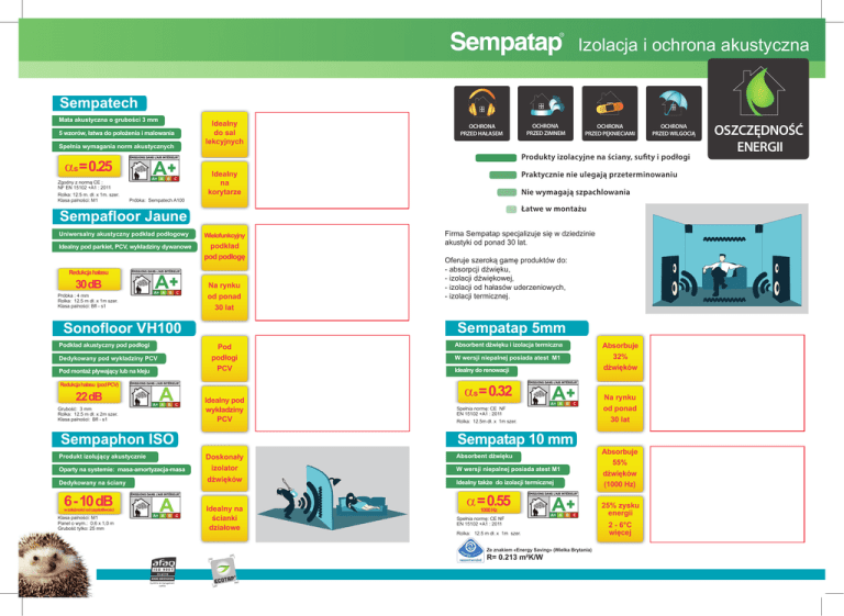 Izolacja i ochrona akustyczna Sempatech Mata akustyczna o grubości 3 mm 5 wzorów, łatwa do położenia i malowania Spełnia wymagania norm akustycznych OCHRONA PRZED HAŁASEM Próbka: Sempatech A100 Idealny na korytarze Nie wymagają szpachlowania Łatwe w montażu Uniwersalny akustyczny podkład podłogowy Wielofunkcyjny Idealny pod parkiet, PCV, wykładziny dywanowe podkład pod podłogę Redukcja hałasu 30 dB Próbka : 4 mm Rolka: 12.5 m dł. x 1m szer. Klasa palności: Bfl - s1 Na rynku od ponad 30 lat Podkład akustyczny pod podłogi Dedykowany pod wykładziny PCV Pod montaż pływający lub na kleju Pod podłogi PCV Redukcja hałasu (pod PCV) 22 dB Grubość: 3 mm Rolka: 12.5 m dł. x 2m szer. Klasa palności: Bfl - s1 Idealny pod wykładziny PCV Oparty na systemie: masa-amortyzacja-masa 6 - 10 dB Klasa palności: M1 Panel o wym.: 0,6 x 1,0 m Grubość tylko: 25 mm Oferuje szeroką gamę produktów do: - absorpcji dźwięku, - izolacji dźwiękowej, - izolacji od hałasów uderzeniowych, - izolacji termicznej. Absorbent dźwięku i izolacja termiczna W wersji niepalnej posiada atest M1 Idealny do renowacji αs = 0.32 Spełnia normę: CE NF EN 15102 +A1 : 2011 Rolka: 12.5m dł. x 1m szer. Sempatap 10 mm Sempaphon ISO Produkt izolujący akustycznie Firma Sempatap specjalizuje się w dziedzinie akustyki od ponad 30 lat. Sempatap 5mm Sonofloor VH100 w zależności od częstotliwości OCHRONA PRZED PĘKNIECIAMI OCHRONA PRZED WILGOCIĄ Praktycznie nie ulegają przeterminowaniu Sempafloor Jaune Dedykowany na ściany OCHRONA PRZED ZIMNEM Produkty izolacyjne na ściany, sufity i podłogi αs = 0.25 Zgodny z normą CE : NF EN 15102 +A1 : 2011 Rolka: 12.5 m. dł. x 1m. szer. Klasa palności: M1 Idealny do sal lekcyjnych Doskonały izolator dźwięków Idealny na ścianki działowe Absorbent dźwięku W wersji niepalnej posiada atest M1 Idealny także do izolacji termicznej α = 0.55 1000 Hz Spełnia normę: CE NF EN 15102 +A1 : 2011 Rolka: 12.5 m dł. x 1m szer. Ze znakiem «Energy Saving» (Wielka Brytania) R= 0.213 m²K/W Absorbuje 32% dźwięków Na rynku od ponad 30 lat Absorbuje 55% dźwięków (1000 Hz) 25% zysku energii 2 - 6°C więcej OSZCZĘDNOŚĆ ENERGII
