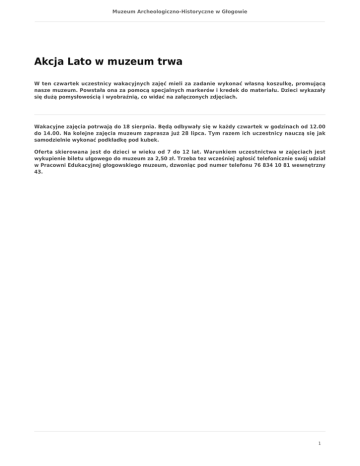 Muzeum Archeologiczno-Historyczne w Głogowie Akcja Lato w muzeum trwa W ten czwartek uczestnicy wakacyjnych zajęć mieli za zadanie wykonać własną koszulkę, promującą nasze muzeum. Powstała ona za pomocą specjalnych markerów i kredek do materiału. Dzieci wykazały się dużą pomysłowością i wyobraźnią, co widać na załączonych zdjęciach. Wakacyjne zajęcia potrwają do 18 sierpnia. Będą odbywały się w każdy czwartek w godzinach od 12.00 do 14.00. Na kolejne zajęcia muzeum zaprasza już 28 lipca. Tym razem ich uczestnicy nauczą się jak samodzielnie wykonać podkładkę pod kubek. Oferta skierowana jest do dzieci w wieku od 7 do 12 lat. Warunkiem uczestnictwa w zajęciach jest wykupienie biletu ulgowego do muzeum za 2,50 zł. Trzeba tez wcześniej zgłosić telefonicznie swój udział w Pracowni Edukacyjnej głogowskiego muzeum, dzwoniąc pod numer telefonu 76 834 10 81 wewnętrzny 43. 1