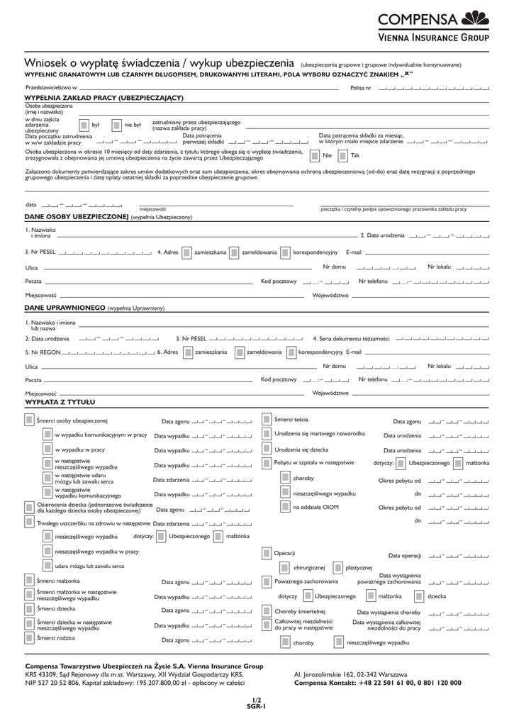 Wniosek o wypłatę świadczenia / wykup ubezpieczenia (ubezpieczenia grupowe i grupowe indywidualnie kontynuowane) WYPE¸NIĆ GRANATOWYM LUB CZARNYM D¸UGOPISEM, DRUKOWANYMI LITERAMI, POLA WYBORU OZNACZYĆ ZNAKIEM „ ” Przedstawicielstwo w Polisa nr WYPE¸NIA ZAK¸AD PRACY (UBEZPIECZAJĄCY) Osoba ubezpieczona (imię i nazwisko) w dniu zajścia zdarzenia by∏ ubezpieczony Data początku zatrudnienia w w/w zak∏adzie pracy nie by∏ zatrudniony przez ubezpieczającego (nazwa zak∏adu pracy) Data potrącenia pierwszej sk∏adki Data potrącenia sk∏adki za miesiąc, w którym mia∏o miejsce zdarzenie Osoba ubezpieczona w okresie 10 miesięcy od daty zdarzenia, z tytułu którego ubiega się o wypłatę świadczenia, zrezygnowała z obejmowania jej umową ubezpieczenia na życie zawartą przez Ubezpieczającego Nie Tak Załączono dokumenty potwierdzające zakres umów dodatkowych oraz sum ubezpieczenia, okres obejmowania ochroną ubezpieczeniową (od-do) oraz datę rezygnacji z poprzedniego grupowego ubezpieczenia i datę opłaty ostatniej składki za poprzednie ubezpieczenie grupowe. data miejscowość pieczątka i czytelny podpis upoważnionego pracownika zak∏adu pracy DANE OSOBY UBEZPIECZONEJ (wype∏nia Ubezpieczony) 1. Nazwisko i imiona 2. Data urodzenia 3. Nr PESEL 4. Adres zamieszkania zameldowania E-mail korespondencyjny Nr domu Ulica Nr lokalu Nr telefonu Kod pocztowy Poczta Województwo Miejscowość DANE UPRAWNIONEGO (wype∏nia Uprawniony) 1. Nazwisko i imiona lub nazwa 2. Data urodzenia 3. Nr PESEL 6. Adres 5. Nr REGON 4. Seria dokumentu tożsamości zamieszkania korespondencyjny E-mail zameldowania Nr domu Ulica Nr lokalu Kod pocztowy Poczta Nr telefonu Województwo Miejscowość WYP¸ATA Z TYTU¸U Śmierci osoby ubezpieczonej Śmierci teścia Data zgonu w wypadku komunikacyjnym w pracy Data wypadku w wypadku w pracy Data wypadku Data zgonu Urodzenia się martwego noworodka Urodzenia się dziecka w następstwie Data wypadku nieszczęśliwego wypadku w następstwie udaru Data zdarzenia mózgu lub zawa∏u serca w następstwie Data wypadku wypadku komunikacyjnego Osierocenia dziecka (jednorazowe świadczenie Data zgonu dla każdego dziecka osoby ubezpieczonej) Data urodzenia Data urodzenia Pobytu w szpitalu w następstwie dotyczy: choroby Ubezpieczonego Okres pobytu od nieszczęśliwego wypadku do na oddziale OIOM Okres pobytu od do Trwa∏ego uszczerbku na zdrowiu w następstwie Data zdarzenia nieszczęśliwego wypadku dotyczy: Ubezpieczonego małżonka nieszczęśliwego wypadku w pracy Operacji udaru mózgu lub zawa∏u serca Śmierci ma∏żonka Śmierci ma∏żonka w następstwie nieszczęśliwego wypadku Śmierci dziecka Śmierci dziecka w następstwie nieszczęśliwego wypadku Śmierci rodzica Data operacji chirurgicznej plastycznej Data wystąpienia poważnego zachorowania Poważnego zachorowania Data zgonu dotyczy Data wypadku Data zgonu Ubezpieczonego Choroby śmiertelnej Ca∏kowitej niezdolności do pracy w następstwie Data wypadku Data zgonu choroby Compensa Towarzystwo Ubezpieczeń na Życie S.A. Vienna Insurance Group KRS 43309, Sąd Rejonowy dla m.st. Warszawy, XII Wydział Gospodarczy KRS, NIP 527 20 52 806, Kapitał zakładowy: 195.207.800,00 zł - opłacony w całości 1/2 SGR-1 małżonka dziecka Data wystąpienia choroby Data wystąpienia ca∏kowitej niezdolności do pracy nieszczęśliwego wypadku Al. Jerozolimskie 162, 02-342 Warszawa Compensa Kontakt: +48 22 501 61 00, 0 801 120 000 małżonka Całkowitego / trwa∏ego inwalidztwa Osiągnięcia przez osobę ubezpieczoną wieku emerytalnego nr rachunku Wykupu ubezpieczenia nr rachunku z funduszem kapita∏owym Data wypadku w następstwie nieszczęśliwego wypadku w wyniku wypadku w pracy % lub w wyniku wypadku komunikacyjnego dotyczy Ubezpieczonego z wp∏at zł pracownika Inne małżonka Ciężkiej trwa∏ej utraty zdrowia w następstwie nieszczęśliwego wypadku Trwa∏ej utraty zdrowia w następstwie nieszczęśliwego wypadku Data wypadku Data wypadku OŚWIADCZENIE UPRAWNIONEGO (UWAGA!: ZAWSZE NALEŻY WYPEŁNIĆ W PRZYPADKU ROSZCZENIA Z TYTUŁU ŚMIERCI, ŚMIERCI NW LUB INNYCH NASTĘPSTW NW) Wszystkie dodatkowe informacje i dane mogą zostać uzupełnione pisemnym oświadczeniem Uprawnionego do niniejszego wniosku Miejsce, data i godzina wypadku / śmierci Przyczyna i okoliczności Adres placówki medycznej, która udzieliła pierwszej pomocy Adres placówki medycznej, w której leczy się / leczyła Osoba ubezpieczona Czy na miejsce zdarzenia była wezwana Policja? Jeżeli tak, proszę podać dokładny adres posterunku Policji Adres Prokuratury / Sądu Rodzaj urazu i opis doznanego uszczerbku na zdrowiu (nie dotyczy roszczeń z tytułu śmierci) Czy zakończono leczenie i rehabilitację? (nie dotyczy roszczeń z tytułu śmierci) tak, data zakończenia nie, data przewidywanego zakończenia ZA¸ĄCZONO DOKUMENTY kopia skróconego odpisu aktu zgonu wynik badania histopatologicznego kopia karty statystycznej z przyczyną zgonu wypis z dowodu osobistego (druk GWDO) kopia skróconego odpisu aktu urodzenia kopia karty leczenia szpitalnego zaświadczenie lekarskie (orzeczenie zgonu) kopie dokumentacji medycznej (1. pomoc, przychodnia, historia choroby ze szpitala) kopia raportu policyjnego (w przypadku nieszczęśliwego wypadku) kopia protoko∏u BHP (w przypadku nieszczęśliwego wypadku) SPOSÓB REALIZACJI WYP¸ATY (wype∏nia Uprawniony) Imię i nazwisko w∏aściciela/-li rachunku bankowego Nazwa banku przelew na rachunek nr data miejscowość czytelny podpis uprawnionego, składającego wniosek * W przypadku gdy właścicielem rachunku nie jest Uprawniony należy podpisać poniższe oświadczenie. Oświadczam, że podany powyżej numer rachunku bankowego nie należy do mnie. Oświadczam, że przekazanie kwoty świadczenia na tenże rachunek bankowy jest spełnieniem zobowiązania Towarzystwa z tytułu świadczenia w wynikającego z w/w umowy ubezpieczenia i z tego tytułu nie będę zgłasza