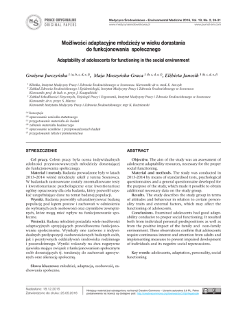 Medycyna Środowiskowa - Environmental Medicine 2016, Vol. 19, No. 2, 24-31 www.journal-em.com www.medycynasrodowiskowa.pl Możliwości adaptacyjne młodzieży w wieku dorastania do funkcjonowania społecznego Adaptability of adolescents for functioning in the social environment Grażyna Jurczyńska 1 (a, b, c, d, e, f), Maja Muszyńska-Graca 1 (b, c, d, e, f), Elżbieta Janosik 3 (b, c, d, e, f) 1 2 3 Klinika, Instytut Medycyny Pracy i Zdrowia Środowiskowego w Sosnowcu. Kierownik: dr n. med. E. Anczyk Zakład Zdrowia Środowiskowego i Epidemiologii, Instytut Medycyny Pracy i Zdrowia Środowiskowego w Sosnowcu Kierownik: prof. dr hab. n. przyr. J. Kwapuliński Zakład Szkodliwości Fizycznych, Fizjologii Pracy i Ergonomii, Instytut Medycyny Pracy i Zdrowia Środowiskowego w Sosnowcu Kierownik: dr n. przyr. S. Marzec Kierownik Instytutu Medycyny Pracy i Zdrowia Środowiskowego: mgr K. Kuźniewski koncepcja opracowanie wniosku statutowego (c) przygotowanie materiału do badań (d) zebranie materiału badawczego (e) opracowanie wyników z przeprowadzonych badań (f) przygotowanie tekstu i piśmiennictwa (a) (b) STRESZCZENIE Cel pracy. Celem pracy była ocena indywidualnych zdolności przystosowawczych młodzieży dorastającej do funkcjonowania społecznego. Materiał i metody. Badania prowadzone były w latach 2013–2014 wśród młodzieży szkół z terenu Sosnowca. W badaniach zastosowane zostały znormalizowane testy i kwestionariusze psychologiczne oraz kwestionariusz ogólny opracowany dla celu badania, który pozwolił uzyskać uzupełniające dane na temat badanej populacji. Wyniki. Badania pozwoliły scharakteryzować badaną populację pod kątem postaw i zachowań w odniesieniu do wybranych cech osobowości oraz czynników zewnętrznych, które mogą mieć wpływ na funkcjonowanie społeczne. Wnioski. Badana młodzież posiadała wiele możliwości adaptacyjnych sprzyjających prawidłowemu funkcjonowaniu społecznemu. Wynikały one zarówno z indywidualnych predyspozycji osobowościowych badanych osób, jak i pozytywnych oddziaływań środowiska rodzinnego i pozarodzinnego. Wyniki wskazały na dwa negatywne zjawiska mające związek z funkcjonowaniem społecznym osób dorastających tj. tendencję do zachowań agresywnych oraz alienację społeczną. Słowa kluczowe: młodzież, adaptacja, osobowość, zachowania społeczne. Nadesłano: 18.12.2015 Zatwierdzono do druku: 25.05.2016 ABSTRACT Objective. The aim of the study was an assessment of adolescent adaptability resources, necessary for the proper social functioning. Material and methods. The study was conducted in 2013-2014 by means of standardised tests, psychological questionnaires and a general questionnaire developed for the purpose of the study, which made it possible to obtain additional necessary data on the study group. Results. The study describes the study group in terms of attitudes and behaviour in relation to certain personality traits and external factors, which may affect the functioning of adolescents. Conclusions. Examined adolescents had good adaptability conducive to proper social functioning. It resulted both from individual personal predispositions as well as from the positive impact of the family and non-family environment. These observations confirm that adolescents require continuous interest and attention from adults and implementing measures to prevent impaired development of individuals and its negative social repercussions. Key words: adolescents, adaptation, personality, social functioning Niniejszy materiał jest udostępniony na licencji Creative Commons – Uznanie autorstwa 3.0 PL. Pełne postanowienia tej licencji są dostępne pod: http://creativecommons.org/licenses/by/3.0/pl/legalcode Medycyna Środowiskowa - Environmental Medicine 2016, Vol. 19, No. 1 25 Grażyna Jurczyńska, Maja Muszyńska-Graca, Elżbieta Janosik: Możliwości adaptacyjne młodzieży w wieku dorastania do funkcjonowania społecznego WSTęp Współczesna młodzież to populacja dorastająca w okresie wielu przeobrażeń cywilizacyjnych dotyczących różnych dziedzin życia człowieka. Zmiany te z jednej strony stwarzają wiele możliwości rozwoju, z drugiej zaś wymagają ciągłego przystosowywania się i radzenia sobie z napotykanymi trudnościami [1–4]. Własny potencjał osobowościowy i zdrowotny stanowi podłoże ogólnego rozwoju jednostki, również w sferze społecznej [5, 6]. Dojrzewanie społeczne jest procesem złożonym i indywidualnie zróżnicowanym, pozostającym w ścisłej zależności z rozwojem emocjonalnym [7, 8]. Im więcej możliwości przystosowawczych posiada jednostka, tym łatwiej jest jej funkcjonować w otaczającej rzeczywistości [9–15]. Zdolności adaptacyjne w psychologii rozumiane są jako kompetencje społeczne czyli złożone umiejętności warunkujące efektywność radzenia sobie w różnych sytuacjach społecznych. Składają się na nie między innymi: zdolność komunikowania się, umiejętność nawiązywania i podtrzymywania pozytywnych relacji interpersonalnych, zdolność osiągania własnych celów przy respektowaniu potrzeb i oczekiwań otoczenia. Kompetencje społeczne można uznać za spójny, funkcjonalny, wykorzystywany w praktyce, uwarunkowany osobowościowo zasób wiedzy i doświadczenia oraz umiejętności, które umożliwiają jednostce podejmowanie i rozwijanie twórczych relacji z innymi osobami, a także aktywne współuczestniczenie w życiu różnych grup społecznych [16–18]. Zdolności adaptacyjne kształtują się w oparciu o kontakty społeczne i indywidualne predyspozycje uwarunkowane genetycznie i biologicznie oraz wpływy środowiskowe, wynikające głównie z funkcjonowania jednostki w rodzinie, a także środowisku pozarodzinnym [19-23]. W przypadku młodzieży uczącej się istotne znaczenie w tym zakresie odgrywają środowisko szkolne oraz pozaszkolne grupy rówieśnicze. Deficyt własnych zasobów osobowościowych, nieprawidłowe oddzia