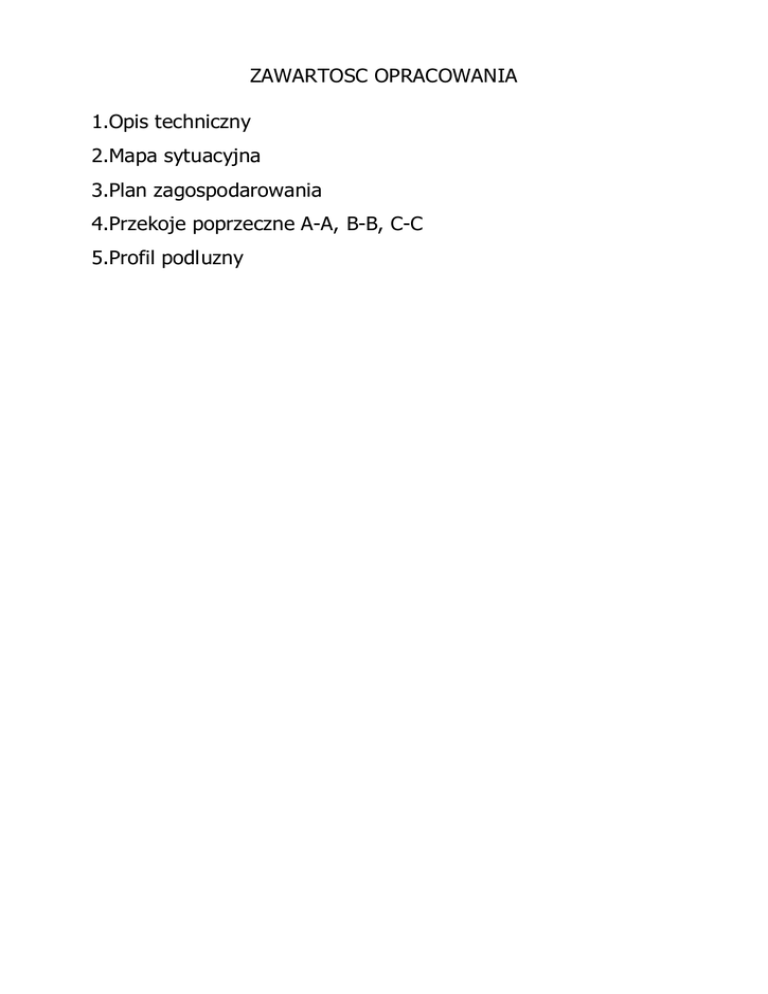 ZAWARTOSC OPRACOWANIA 1.Opis techniczny 2.Mapa sytuacyjna 3.Plan zagospodarowania 4.Przekoje poprzeczne A-A, B-B, C-C 5.Profil podluzny 1.OPIS TECHNICZNY 1.1.Podst aw a opr acow ania 1.1.1 1.1.2 1.1.3 1.1.4 1.1.5 Rozporzadzenie MTiGM w sprawie warunków technicznych jakim powinny odpowiadac drogi publiczne i ich usytuowanie (Dz.U. nr 43 poz.430 z 1999r) Ustawa z dnia 21.05.1985r „o drogach publicznych” (Dz.U. nr 19 poz.115 z 2007r z pózn.zm.) Ustawa z dnia 7.07.1984r – „Prawo budowlane” (Dz.U. nr 89 z 1984r z pózn.zm.) Mapa sytuacyjno-wysokosciowa w skali 1:500 Inwentaryzacja urzadzen wykonana przez projektanta 1.2.Zakr es opr acow ania Zakres opracowania obejmuje remont drogi gminnej – lacznika miedzy ul.Mila i Lakowa w m.Krzanowice. 1.3.Opis st anu ist niej acego Szerokosc drogi gminnej wewnetrznej w liniach rozgraniczajacych wynosi 3,50-4,0 m. W sladzie remontowanej drogi gminnej zlokalizowane sa siec kanalizacji sanitarnej, wodociagowa, a odcinkowo równiez kanalizacja deszczowa. W pasie drogowym przedmiotowego odcinka nie wystepuje zadrzewienie. 1.4.Opis st anu pr oj ekt ow anego Parametry projektowe drogi: a)predkosc projektowa 30km/h b)szerokosc jezdni 2,80m. c)luki – dostosowane do warunków terenowych Po wykonaniu robót zwiazanych z remontem drogi nalezy wykonac pobocza z kruszywa lamanego o gr.10cm na szer. do 0,50m. Roboty ziemne polegac beda na wykonaniu koryta w istniejacym podlozu. Nadmiar urobku zostanie wywieziony na wysypisko. Roboty ziemne wykonywac mechanicznie, a w miejscach wystepowania istniejacego uzbrojenia prowadzic recznie. 1.5.Konst r ukcj a naw ier zchni a)drogi wzdluz posesji 16 -warstwa scieralna z betonu asfaltowego AC 11S gr.4cm -warstwa wiazaca z betonu asfaltowego AC 11W gr.4cm -warstwa górna podbudowy z kruszywa lamanego bazaltowego lub granitowego 0/31,5mm gr.8cm -warstwa dolna podbudowy z kruszywa lamanego bazaltowego lub granitowego 0/63 mm gr.15cm -warstwa odsaczajaca z kruszywa naturalnego – piasku gr.10cm -lewostronne okraweznikowanie b)drogi (odc. od konca pos.16 do konca obrysu budynku przy pos.10) -warstwa scieralna z betonu asfaltowego AC 11S gr.4cm -warstwa wiazaca z betonu asfaltowego AC 11W gr.4cm -warstwa górna podbudowy z kruszywa lamanego bazaltowego lub granitowego 0/31,5mm gr.8cm -warstwa dolna podbudowy z kruszywa lamanego bazaltowego lub granitowego 0/63 mm gr.15cm -warstwa odsaczajaca z kruszywa naturalnego – piasku gr.10cm -bez okraweznikowania c)drogi (od konca budynku przy pos.10 do konca zakresu robót) -warstwa górna podbudowy z kruszywa lamanego bazaltowego lub granitowego 0/31,5mm gr.8cm -warstwa dolna podbudowy z kruszywa lamanego bazaltowego lub granitowego 0/63 mm gr.15cm -warstwa odsaczajaca z kruszywa naturalnego – piasku gr.10cm -bez okraweznikowania d)pobocze -material kamienny – kruszywo lamane gr.10cm 1.6.Dane inf or m uj ace czy dzial ka lub t er en, na kt ór ym j est pr oj ekt ow any obiekt budow l any sa w pisane do r ej est r u zabyt ków or az czy podlegaj a ochr onie na podst aw ie m iej scow ego planu zagospodar ow ania popr zecznego. Nie dotyczy 1.7.W pl yw eksploat acj i gór niczej na dzial ke lub t er en zam ier zenia budow lanego. Nie dotyczy 1.8.Zielen Nie projektuje sie zmian w zagospodarowaniu zieleni. Teren bezposrednio sasiadujace z planowanymi robotami remontowymi zostana pokryte warstwa humusu z obsianiem trawa. 1.9 Ur zadzenia obce W pasie drogowym drogi gminnej wystepuja siec kanalizacji sanitarnej, wodociag, a odcinkowo równiez kanalizacja deszczowa. 1.10 Odw odnienie Woda deszczowa i rozstopowa odprowadzana bedzie z terenu remontowanej drogi na pobocze gruntowe. Dotychczasowe odwodnienie pasa drogowego drogi gminnej pozostanie jako powierzchniowe. Wody opadowe beda kierowane przez spadki podluzny i poprzeczny drogi w warstwy gruntów rodzimych, gdzie nastapi ich infiltracja w podloze. 1.11 I nf or m acj e dodat kow e Do budowy nalezy uzyc materialy posiadajace stosowne aprobaty techniczne oraz swiadectwa dopuszczenia do stosowania w budownictwie drogowym. Projektowane rozwiazania pokazano na rysunku przekroju poprzecznego. Podbudowe wykonac i zagescic zgodnie z PN-S-02205 (Roboty ziemne. Drogi samochodowe. Wymagania i badania). 1.12 Or ganizacj a r uchu Niniejsze opracowanie nie obejmuje wykonania projektu organizacji ruchu na czas robót. 1.13 Robot y pr zygot ow aw cze Przed rozpoczeciem robót nalezy: -zapoznac sie z plansza zbiorcza uzbrojenia terenu -przeprowadzic kontrole aparatem POLTRANS celem wyznaczenia ewentualnym kolizji z niezinwentaryzowanym uzbrojenie mnym terenu -zlecic jednostce wykonawstwa geodezyjnego oznakowanie punktów osnowy geodezyjnej celem zabezpieczenia przed zniszczeniem w czasie robót -wytyczyc oraz w sposób trwaly i widoczny oznakowac w terenie lokalizacje projektowanych obiektów. Prace te powinny zostac wykonane przez sluzby geodezyjne -teren budowy zabezpieczyc przed osobami postronnymi oraz widocznie oznakowac -powiadomic wlascicieli istniejacego uzbrojenia terenu i wlascicieli dzialek o terminie rozpoczecia robót -oznakowac teren prac w pasie drogowym Robot y nalezy w ykonyw ac zgodnie z obow iazuj acym i nor m am i i pr zepisam i or az szt uka budow lana. Projektant: mgr inz.Piotr Malorny ......................................