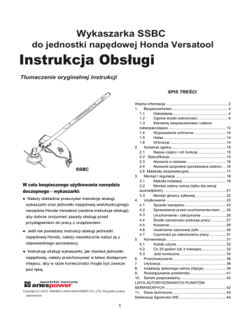 Wykaszarka SSBC do jednostki napędowej Honda Versatool Instrukcja Obsługi Tłumaczenie oryginalnej instrukcji SPIS TREŚCI W celu bezpiecznego użytkowania narzędzia doczepnego – wykaszarki: ● Należy dokładnie przeczytać instrukcję obsługi wykaszarki oraz jednostki napędowej wielofunkcyjnego narzędzia Honda Versatool (osobna instrukcja obsługi), aby dobrze zrozumieć zasady obsługi przed przystąpieniem do pracy z urządzeniem. ● Jeśli nie posiadasz instrukcji obsługi jednostki napędowej Honda, należy niezwłocznie nabyć ją u odpowiedniego sprzedawcy. ● Instrukcję obsługi wykaszarki, jak również jednostki napędowej, należy przechowywać w łatwo dostępnym miejscu, aby w razie konieczności mogła być zawsze pod ręką. Copyright (C) 2012 NINGBO LIHAO MACHINERY CO.,LTD. Wszystkie prawa zastrzeżone 1 Ważne informacje .......................................................... 2 1. Bezpieczeństwo ..................................................... 4 1.1 Ostrzeżenia .................................................... 4 1.2 Ogólne środki ostrożności ............................ 6 1.3 Elementy bezpieczeństwa i osłona zabezpieczająca ...................................................... 13 1.4 Wyposażenie ochronne .............................. 14 1.5 Hałas .......................................................... 14 1.6 Wibracje .................................................... 14 2. Schemat ogólny ................................................... 15 2.1 Nazwy części i ich funkcje .......................... 15 2.2 Specyfikacja ..................................................... 15 2.3 Akcesoria w zestawie ..................................... 16 2.4 Akcesoria opcjonalne (sprzedawane osobno) ... 16 2.6 Materiały eksploatacyjne................................... 17 3. Montaż i regulacja ............................................... 18 3.1 Metoda instalacji ......................................... 18 3.2 Montaż osłony ostrza (tylko dla wersji australijskich) ........................................................... 21 3.3 Montaż głowicy żyłkowej............................. 22 4. Użytkowanie ........................................................ 23 4.1 Sposób transportu ...................................... 23 4.2 Sprawdzenie przed uruchomomie-niem ..... 25 4.3 Uruchomienie i zatrzymanie ....................... 26 4.4 Środki ostrożności podczas pracy .............. 27 4.5 Koszenie ..................................................... 29 4.6 Uwalnianie nylonowej żyłki ......................... 30 4.7 Czynności po zakończeniu pracy ............... 31 5. Konserwacja ........................................................ 31 5.1 Każde użycie .............................................. 32 5.2 Co 20 godzin lub 3 miesiące....................... 32 5.3 Jeśli konieczne ........................................... 33 6. Przechowywanie .................................................. 36 7. Utylizacja ............................................................. 38 8. Instalacja żelaznego ostrza (Opcja)..................... 39 9. Rozwiązywanie problemów ................................. 41 10. Serwis posprzedażny........................................... 42 LISTA AUTORYZOWANYCH PUNKTÓW SERWISOWYCH ......................................................... 42 11. Dane techniczne .................................................. 43 Deklaracja Zgodności WE ............................................ 44 Ważne informacje Przeznaczenie Produkt ten (zwany dalej narzędziem doczepnym) jest przeznaczony do zamocowania do jednostki napędowej (sprzedawanej osobno) w celu ścinania trawy, chwastów i krzewów. Wykaszarka jest przymocowywana do naszej autoryzowanej jednostki napędowej. Nie wolno używać wykaszarki w żadnym innym celu lub w jakikolwiek inny sposób. Jednostka napędowa (sprzedawana osobno) Narzędzie doczepne Wykaszarka Seria narzędzi (sprzedawanych osobno) Narzędzie (ten produkt) Informacje ogólne ● Wykaszarka jest standardowo wyposażona w nylonową żyłkę tnącą. Jest również możliwe zastosowanie nylonowej żyłki tnącej przymocowanej do żelaznego ostrza (w opcji). ● Gdy stosujesz żelazne ostrze (opcjonalnie), używaj oryginalnego zestawu ostrza (przeznaczonego do użytkowania na terenie Australii) lub oryginalnych części. Zanim rozpoczniesz użytkowanie ostrza przeznaczonego na rynek australijski, dokładnie i ze zrozumieniem zapoznaj się z instrukcją zestawu tego ostrza. ● Wyrażenie „elementy tnące” jest w niniejszej instrukcji obsługi terminem ogólnym, oznaczającym komponenty takie jak nylonowa żyłka tnąca lub żelazne ostrza (w opcji). W opisie treści charakterystycznych dla żelaznego ostrza (w opcji), wyrażenie „ostrze żelazne (w opcji)” jest używane w celu identyfikacji. ● W celu zapoznania się z informacjami dotyczącymi obsługi jednostki napędowej należy odnieść się do dołączonej do niej instrukcji obsługi. ● Podczas obsługi wykaszarki należy przestrzegać wszystkich przepisów bezpieczeństwa, obowiązujących w miejscu użytkowania urządzenia. Wykaszarka została zaprojektowana i wyprodukowana zgodnie z obowiązującymi w kraju zakupu standardami, co w rezultacie oznacza, że sposób użytkowania jest dostosowany tylko do przepisów obowiązujących w kraju, gdzie urządzenie zostało zakupione. Wykaszarka nie będzie spełniała wymogów i standardów mających moc prawną w innych krajach. Nie należy eksportować lub odsprzedawać urządzenia do jakiegokolwiek innego kraju, niż ten będący krajem przeznaczenia, ze względu na różnice językowe. 2 ● Przed przystąpieniem do obsługi i użytkowania wykaszarki oraz jednostki napędowej, należy dokładnie i z pełnym zrozumieniem zapoznać się z treścią dołączonych do nich instrukcji obsługi. Osobom niezaznajomionym z instrukcją obsługi wykaszarki, nie wolno obsł