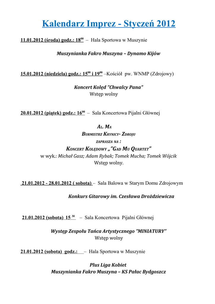 Kalendarz Imprez - Styczeń 2012 11.01.2012 (środa) godz.: 1800 – Hala Sportowa w Muszynie Muszynianka Fakro Muszyna – Dynamo Kijów 15.01.2012 (niedziela) godz.: 1500 i 1900 –Kościół pw. WNMP (Zdrojowy) Koncert Kolęd ”Chwalcy Pana” Wstęp wolny 20.01.2012 (piątek) godz.: 1600 – Sala Koncertowa Pijalni Głównej AL. MA BURMISTRZ KRYNICY- ZDROJU ZAPRASZA NA : KONCERT KOLĘDOWY „”GAD MU QUARTET” w wyk.: Michał Gasz; Adam Rybak; Tomek Mucha; Tomek Wójcik Wstęp wolny. 21.01.2012 - 28.01.2012 ( sobota) – Sala Balowa w Starym Domu Zdrojowym Konkurs Gitarowy im. Czesława Drożdziewicza 21.01.2012 (sobota) 15 30 – Sala Koncertowa Pijalni Głównej Występ Zespołu Tańca Artystycznego ”MINIATURY” Wstęp wolny 21.01.2012 (sobota) godz.: – Hala Sportowa w Muszynie Plus Liga Kobiet Muszynianka Fakro Muszyna – KS Pałac Bydgoszcz 21.01.2012 (sobota) godz.: 1845 – Kino Cyfrowe w budynku Centrum Kultury (ul. Piłsudskiego 19) ZACZAROWANA WYSPA Premiera sezonu 2011/2012 Transmisja przedstawienia z The Metropolitan Opera w Nowym Jorku na żywo w jakości HD Wstęp 50,00 zł 21.01.2012 (sobota) godz. 20 00 – Karczma Regionalna (ul. Czarny Potok 26A) Towarzystwo Upowszechniania Tradycji i Kultury Łemków z Krynicy-Zdroju Zaprasza na MAŁANKĘ Do tańca zagra zespół ”NADIJA” Wstęp 130zł/os 01.01.2012 - 22.01.2012 (niedziela) – BWA - Galeria Sztuki „SIEDLISKO” (ul. Piłsudskiego 19) GRAŻYNA PETRYSZAK Wystawa malarstwa ”MOJE ZAUROCZENIE…” WYSTAWA SZOPEK BOŻONARODZENIOWYCH WYKONANYCH PRZEZ DZIECI Z CZYRNEJ Wstęp wolny. Galeria otwarta codziennie w godz. 10.30 - 20.30 28.01.2012 (sobota) godz.: 1900 – Sala Balowa w Starym Domu Zdrojowym Stowarzyszenie Na Rzecz Osób Niepełnosprawnych „Przystań” Oraz Burmistrz Krynicy-Zdroju Zapraszają na: II WALENTYNKOWY BAL CHARYTATYWNY Wstęp 150zł/os Wieczory z Góralem Łąckim - godz.: 1900 - 2200 Restauracja „Jaworzyna” * środa * piątek * czwartek ul. Piłsudskiego 24 D.W. „Jagiellonka” Wstęp wolny Muzyka na żywo, koncerty – godz.: 1900 * piątek * sobota * niedziela Pensjonat Małopolanka ( Bulwary Dietla 13) Koncerty Orkiestry Zdrojowej w Pijalni Głównej • środa, czwartek - godz. 15.30 - 17.30 • piątek - godz. 11.00 - 12.00 • sobota, niedziela - 10.00 - 12.00 Repertuar Kina: Przygoda Tintina 3D - 13 - 19 stycznia 2012 godz. 12:00 i 16:00 Dziennik zakrapiany rumem - 13 - 19 stycznia 2012 godz. 13:45 Sherlock Holmes: Gra Cieni – 6-19 Styczeń 2012 godz. 1800 , 2030 AEROBIK – FITNESS MOSiR Krynica- Zdrój (hala lodowiska) Każdy poniedziałek, wtorek, środa i czwartek, godz.: 1900 - 2000 DANCEAEROBIK, SPORTAEROBIK, AFROAEROBIK, TANIEC BRZUCHA, ZUMBA, LATUNGA, TAE-BO, PILATES, FLEXI BAR, HANTLE, PIŁKI, OBCIĄŻNIKI, GUMY THERA BAND, STEP dod. informacje pod numerem tel. 608 501 871 lub 501 329 130 Pijalnia Główna czynna codziennie w godz. 630 do 1800 Pijalnia Jan-Józef czynna codziennie w godz. 1000 do 1300 Pijalnia Mieczysław czynna codziennie w godz. 1000 do 1730 Wystawa Fotograficzna w Pijalni Głównej organizowana przez Krynickie Towarzystwo Fotograficzne Tytuł: „Sądecczyzna na skrzyżowaniu kultur” Autorzy: członkowie Krynickiego Towarzystwa Fotograficznego