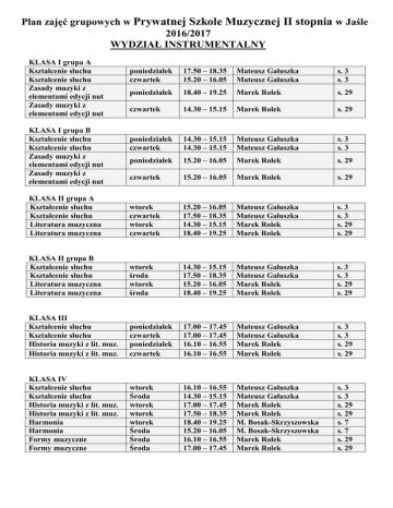 Plan zajęć grupowych w Prywatnej Szkole Muzycznej II stopnia w Jaśle 2016/2017 WYDZIAŁ INSTRUMENTALNY KLASA I grupa A Kształcenie słuchu Kształcenie słuchu Zasady muzyki z elementami edycji nut Zasady muzyki z elementami edycji nut poniedziałek czwartek 17.50 – 18.35 15.20 – 16.05 Mateusz Gałuszka Mateusz Gałuszka s. 3 s. 3 poniedziałek 18.40 – 19.25 Marek Rolek s. 29 czwartek 14.30 – 15.15 Marek Rolek s. 29 poniedziałek czwartek 14.30 – 15.15 14.30 – 15.15 Mateusz Gałuszka Mateusz Gałuszka s. 3 s. 3 poniedziałek 15.20 – 16.05 Marek Rolek s. 29 czwartek 15.20 – 16.05 Marek Rolek s. 29 KLASA II grupa A Kształcenie słuchu Kształcenie słuchu Literatura muzyczna Literatura muzyczna wtorek czwartek wtorek czwartek 15.20 – 16.05 17.50 – 18.35 14.30 – 15.15 18.40 – 19.25 Mateusz Gałuszka Mateusz Gałuszka Marek Rolek Marek Rolek s. 3 s. 3 s. 29 s. 29 KLASA II grupa B Kształcenie słuchu Kształcenie słuchu Literatura muzyczna Literatura muzyczna wtorek środa wtorek środa 14.30 – 15.15 17.50 – 18.35 15.20 – 16.05 18.40 – 19.25 Mateusz Gałuszka Mateusz Gałuszka Marek Rolek Marek Rolek s. 3 s. 3 s. 29 s. 29 KLASA III Kształcenie słuchu Kształcenie słuchu Historia muzyki z lit. muz. Historia muzyki z lit. muz. poniedziałek czwartek poniedziałek czwartek 17.00 – 17.45 17.00 – 17.45 16.10 – 16.55 16.10 – 16.55 Mateusz Gałuszka Mateusz Gałuszka Marek Rolek Marek Rolek s. 3 s. 3 s. 29 s. 29 KLASA IV Kształcenie słuchu Kształcenie słuchu Historia muzyki z lit. muz. Historia muzyki z lit. muz. Harmonia Harmonia Formy muzyczne Formy muzyczne wtorek Środa wtorek wtorek wtorek Środa Środa Środa 16.10 – 16.55 14.30 – 15.15 17.00 – 17.45 17.50 – 18.35 18.40 – 19.25 15.20 – 16.05 16.10 – 16.55 17.00 – 17.45 Mateusz Gałuszka Mateusz Gałuszka Marek Rolek Marek Rolek M. Bosak-Skrzyszowska M. Bosak-Skrzyszowska Marek Rolek Marek Rolek s. 3 s. 3 s. 29 s. 29 s. 7 s. 7 s. 29 s. 29 KLASA I grupa B Kształcenie słuchu Kształcenie słuchu Zasady muzyki z elementami edycji nut Zasady muzyki z elementami edycji nut KLASA V Kształcenie słuchu Kształcenie słuchu Historia muzyki z lit. muz. Historia muzyki z lit. muz. Harmonia Harmonia Formy muzyczne Formy muzyczne poniedziałek Środa poniedziałek poniedziałek Środa czwartek czwartek czwartek 18.40 – 19.25 16.10 – 16.55 17.00 – 17.45 17.50 – 18.35 17.00 – 17.45 18.40 – 19.25 17.00 – 17.45 17.50 – 18.35 M. Bosak-Skrzyszowska M. Bosak-Skrzyszowska Marek Rolek Marek Rolek M. Bosak-Skrzyszowska M. Bosak-Skrzyszowska Marek Rolek Marek Rolek s. 7 s. 7 s. 29 s. 29 s. 7 s. 7 s. 29 s. 29 ZESPOŁY Orkiestra smyczkowa Orkiestra smyczkowa Orkiestra smyczkowa Orkiestra dęta Orkiestra dęta Chór Chór Chór Środa Środa Środa Piątek Piątek Środa Środa Środa 15.20 – 16.05 16.10 – 16.55 17.00 – 17.45 16.30 – 17.15 17.20 – 18.05 15.20 – 16.05 16.10 – 16.55 17.00 – 17.45 Mateusz Gałuszka Mateusz Gałuszka Mateusz Gałuszka Tadeusz Wróbel Tadeusz Wróbel Monika Twarduś Monika Twarduś Monika Twarduś aula aula aula aula aula aula aula aula Plan zajęć grupowych w Prywatnej Szkole Muzycznej II stopnia w Jaśle 2016/2017 WYDZIAŁ WOKALNY KLASA I Kształcenie słuchu gr. A Kształcenie słuchu gr. A Kształcenie słuchu gr. B Kształcenie słuchu gr. B Historia muzyki z lit. muz. Historia muzyki z lit. muz. Zasady muzyki z el. edycji nut gr. A Zasady muzyki z el. edycji nut gr. A Zasady muzyki z el. edycji nut gr. B Zasady muzyki z el. edycji nut gr. B Zespół wokalny Zespół wokalny Dykcja i recytacja KLASA II Kształcenie słuchu Kształcenie słuchu Historia muzyki z lit. muz. Historia muzyki z lit. muz. Dykcja i recytacja Dykcja i recytacja Zespół wokalny Zespół wokalny Chór Chór Chór Czytanie nut głosem Czytanie nut głosem poniedziałek czwartek poniedziałek czwartek poniedziałek czwartek 17.50 – 18.35 15.20 – 16.05 14.30 – 15.15 14.30 – 15.15 16.10 – 16.55 16.10 – 16.55 Mateusz Gałuszka Mateusz Gałuszka Mateusz Gałuszka Mateusz Gałuszka Marek Rolek Marek Rolek s. 3 s. 3 s. 3 s. 3 s. 29 s. 29 poniedziałek 18.40 – 19.25 Marek Rolek s. 29 czwartek 14.30 – 15.15 Marek Rolek s. 29 poniedziałek 15.20 – 16.05 Marek Rolek s. 29 czwartek 15.20 – 16.05 Marek Rolek s. 29 Kornelia Wojnarowska Kornelia Wojnarowska Kornelia Wojnarowska wtorek czwartek wtorek wtorek wtorek wtorek 14.30 – 15.15 17.50 – 18.35 17.00 – 17.45 17.50 – 18.35 15.20 – 16.05 16.10 – 16.55 Mateusz Gałuszka Mateusz Gałuszka Marek Rolek Marek Rolek Kornelia Wojnarowska Kornelia Wojnarowska s. 3 s. 3 s. 29 s. 29 Środa Środa Środa 15.20 – 16.05 16.10 – 16.55 17.00 – 17.45 Monika Twarduś Monika Twarduś Monika Twarduś Kornelia Wojnarowska Kornelia Wojnarowska aula aula aula