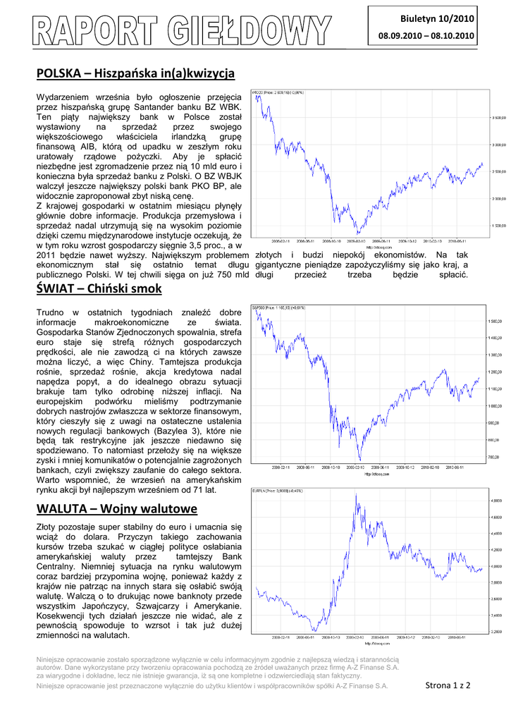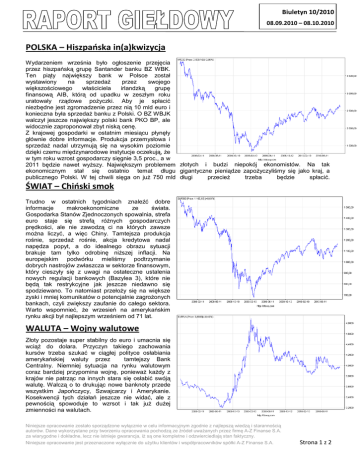Biuletyn 10/2010 08.09.2010 – 08.10.2010 POLSKA – Hiszpańska in(a)kwizycja Wydarzeniem września było ogłoszenie przejęcia przez hiszpańską grupę Santander banku BZ WBK. Ten piąty największy bank w Polsce został wystawiony na sprzedaŜ przez swojego większościowego właściciela irlandzką grupę finansową AIB, którą od upadku w zeszłym roku uratowały rządowe poŜyczki. Aby je spłacić niezbędne jest zgromadzenie przez nią 10 mld euro i konieczna była sprzedaŜ banku z Polski. O BZ WBJK walczył jeszcze największy polski bank PKO BP, ale widocznie zaproponował zbyt niską cenę. Z krajowej gospodarki w ostatnim miesiącu płynęły głównie dobre informacje. Produkcja przemysłowa i sprzedaŜ nadal utrzymują się na wysokim poziomie dzięki czemu międzynarodowe instytucje oczekują, Ŝe w tym roku wzrost gospodarczy sięgnie 3,5 proc., a w 2011 będzie nawet wyŜszy. Największym problemem złotych i budzi niepokój ekonomistów. Na tak ekonomicznym stał się ostatnio temat długu gigantyczne pieniądze zapoŜyczyliśmy się jako kraj, a przecieŜ trzeba będzie spłacić. publicznego Polski. W tej chwili sięga on juŜ 750 mld długi ŚWIAT – Chiński smok Trudno w ostatnich tygodniach znaleźć dobre informacje makroekonomiczne ze świata. Gospodarka Stanów Zjednoczonych spowalnia, strefa euro staje się strefą róŜnych gospodarczych prędkości, ale nie zawodzą ci na których zawsze moŜna liczyć, a więc Chiny. Tamtejsza produkcja rośnie, sprzedaŜ rośnie, akcja kredytowa nadal napędza popyt, a do idealnego obrazu sytuacji brakuje tam tylko odrobinę niŜszej inflacji. Na europejskim podwórku mieliśmy podtrzymanie dobrych nastrojów zwłaszcza w sektorze finansowym, który cieszyły się z uwagi na ostateczne ustalenia nowych regulacji bankowych (Bazylea 3), które nie będą tak restrykcyjne jak jeszcze niedawno się spodziewano. To natomiast przełoŜy się na większe zyski i mniej komunikatów o potencjalnie zagroŜonych bankach, czyli zwiększy zaufanie do całego sektora. Warto wspomnieć, Ŝe wrzesień na amerykańskim rynku akcji był najlepszym wrześniem od 71 lat. WALUTA – Wojny walutowe Złoty pozostaje super stabilny do euro i umacnia się wciąŜ do dolara. Przyczyn takiego zachowania kursów trzeba szukać w ciągłej polityce osłabiania amerykańskiej waluty przez tamtejszy Bank Centralny. Niemniej sytuacja na rynku walutowym coraz bardziej przypomina wojnę, poniewaŜ kaŜdy z krajów nie patrząc na innych stara się osłabić swóją walutę. Walczą o to drukując nowe banknoty przede wszystkim Japończycy, Szwajcarzy i Amerykanie. Kosekwencji tych działań jeszcze nie widać, ale z pewnością spowoduje to wzrsot i tak juŜ duŜej zmienności na walutach. Niniejsze opracowanie zostało sporządzone wyłącznie w celu informacyjnym zgodnie z najlepszą wiedzą i starannością autorów. Dane wykorzystane przy tworzeniu opracowania pochodzą ze źródeł uwaŜanych przez firmę A-Z Finanse S.A. za wiarygodne i dokładne, lecz nie istnieje gwarancja, iŜ są one kompletne i odzwierciedlają stan faktyczny. Niniejsze opracowanie jest przeznaczone wyłącznie do uŜytku klientów i współpracowników spółki A-Z Finanse S.A. Strona 1 z 2 INWESTYCJE – Przesądy, zabobony, przysłowia nadal w cene Wrzesień od wielu lat cieszy się na rynkach złą sławą. Nie bez powodu. Statystycznie jest to najgorszy miesiąc do inwestycji w akcje, bo licząc na przestrzeni kilkudziesięciu lat średnia stopa zwrotu z tego miesiąca jest ujemna. W 2010 było jednak inaczej. Tegoroczny wrzesień był najlepszy od 71 lat, czyli od 1939 roku. Statystyka zawiodła? Nic z tych rzeczy. Po prostu ludzie lubą schematy i przyzwyczajenia. Dlatego teŜ uwaŜa się październik za miesiąc krachów, a grudzień za czas wzrostów z uwagi na tzw. „Rajd Św. Mikołaja”. W styczniu musi być efekt stycznia, więc wzrosty wynikające z nowych inwestycji ponoworocznych, a w kwietniu rynki osiągają maksima. To wszystko to giełdowe przysłowia i przesądy, które są równie prawdziwe jak pogodowe „w marcu jak w garncu”. Często moŜna jednak spotkać osoby przekonane o prawdziwości powyŜszych tez. Takie ocieranie się o magię nie daje Ŝadnych konstruktywnych przesłanek do inwestycji, a odsuwa nas od racjonalnych powodów podjęcia decyzji. Poza tym często daje teŜ wygodną wymówkę, Ŝe to „rynek jest głupi”, bo przecieŜ powinien zachować się inaczej. W Perspektywicznym Portfelu na nowy kwartał mamy niewielkie zmiany. Całkowicie rezygnujemy juŜ z krajowych funduszy obligacyjnych, poniewaŜ uwaŜamy, Ŝe potencjał wzrostu został tam juŜ wyczerpany. Zmniejszamy teŜ zaangaŜowanie w akcje i powiększamy udział gotówki. Wynika to po pierwsze z osiągnięcia przez rynki nowych rekordów na indeksach po półrocznej przerwie, które postrzegamy jako okazję do realizacji zysków. Po drugie liczymy na wzrost zmienności na rynkach i moŜliwości tańszych zakupów za kilka miesięcy. (Perspektywiczny Portfel jest przygotowywany dla lokat klienta o umiarkowanym podejściu do ryzyka akceptującym 8 proc. spadek kapitału oraz oczekującego zysku 12 proc. rocznie.) TOP FUNDUSZY A-Z z oferty Aegon Stopa zwrotu 1 rok 3 lata 18,41% -18,82% 8,67% 26,45% Rodzaj funduszu Nazwa (Waluta) Akcji polskich PienięŜny Obligacji zagranicznych Zagraniczny (EUR) Surowcowy (USD) Surowcowy (EUR) UniKorona Akcje (PLN) Idea Premium (PLN) BieŜ. rok 12,66% 5,73% AEGON Alfa (PLN) -3,25% -6,86% 27,70% Schroder BRIC (EUR) BlackRock World Gold (USD) BlackRock World Mining (EUR) 9,46% 27,33% 15,61% 21,97% 29,84% 34,77% -13,32% 27,76% -18,20% Na początku nowego kwartału jak zawsze prezentujemy nowy portfel na kolejne trzy miesiące. Podsumowanie okresu lipiecwrzesień i prezentowanego tam rozkładu funduszy wygląda bardzo optymistycznie, poniewaŜ nasze inwestycje zarobiły 5,59 proc. Naszym celem jest 3 proc. zysku kwartalnie, a więc w ostatnic
