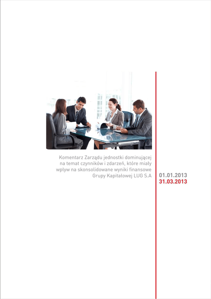 Raport Grupy Kapitałowej LUG S.A. za 1Q’2013 Raport Grupy Kapitałowej LUG S.A. za 1Q’2013 Niniejszy raport prezentuje wybrane dane bilansu oraz rachunku zysków i strat, przepływy pieniężne i wskaźniki Grupy Kapitałowej LUG S.A., tj. skonsolidowane wyniki Grupy Kapitałowej LUG S.A., jednostkowe wyniki spółki dominującej – LUG S.A. oraz jej podmiotu zależnego – spółki LUG Light Factory Sp. z o.o. Ponieważ dnia 01.08.2008 roku LUG Light Factory Sp. z o.o. przejęła działalność operacyjną (projektowanie, produkcja i sprzedaż opraw oraz rozwiązań oświetleniowych) oraz działalność z zakresu badań i rozwoju, Zarząd Emitenta przekazuje w niniejszym raporcie również jednostkowe dane tej spółki. Zgodnie ze zmianami zasad rachunkowości wdrożonymi w Grupie Kapitałowej LUG S.A. w 2011 roku1, w niniejszym raporcie przedstawiono wyniki sporządzone wg MSR/MSSF. Tło makroekonomiczne Wykres 1 Prognoza PKB Według szacunków Instytutu Badań nad Gospodarką Rynkową tempo wzrostu produktu krajowego brutto (PKB) w 2013 r. wyniesie 1,4 proc., a zatem będzie niższe niż w 2012 roku. Zdecydowanie słabsza koniunktura będzie charakteryzowała I połowę roku, gdy wzrost PKP będzie utrzymywał się na poziomie ok.0,5 proc. Na przestrzeni III i IV kwartału prognozowane jest wyraźne ożywienie gospodarcze, które pobudzi tempo wzrostu PKB do 1,9 proc. w III kwartale oraz 2,3 proc. w IV kwartale. Źródło: GUS, IBnGR Wykres 2 Ogólny klimat koniunktury w budownictwie Na koniec marca 2013 roku ogólny klimat koniunktury w budownictwie kształtował się na poziomie -26proc. 12% firm sygnalizowało poprawę koniunktury w stosunku do poprzedniego miesiąca, natomiast 38 proc. deklarowało pogorszenie koniunktury. Źródło: GUS 1 Zmiana zasad rachunkowości i przejście na MSR/MSSF nastąpiło na podstawie uchwały nr 3 Nadzwyczajnego Walnego Zgromadzenia LUG S.A. z dnia 09.02.2011r. w związku z rozpoczęciem procesu przejścia na rynek regulowany i złożeniem prospektu emisyjnego w Komisji Nadzoru Finansowego. Na wniosek Emitenta w dniu 07.06.2011r. Komisja Nadzoru Finansowego zawiesiła postępowanie w sprawie o zatwierdzenie prospektu emisyjnego Emitenta w związku z zamiarem ubiegania się o dopuszczenie do obrotu na rynku regulowanym akcji serii A, B, C LUG. Raport Grupy Kapitałowej LUG S.A. za 1Q’2013 Wykres 3 Produkcja budowlano - montażowa W okresie styczeń - marzec 2013 roku produkcja budowlano – montażowa był aż o 15,1% niższa niż w analogicznym okresie ub. roku. W marcu 2013 roku produkcja ,budowlano - montażowa ogółem zrealizowana w Polsce odnotowała spadek r/r o ok. 18,5%, jednocześnie była wyższa o 20,9% niż w lutym 2013 roku. Dynamika produkcji budowlanej pogorszyła się w następujących segmentach: budowle sportowe i rekreacyjne (-29%r/r), budownictwo drogowe (-35,8%r/r), budynków handlowo-usługowych (-19,8%r/r), obiekty użyteczności publicznej (-5,5%r/r), budynki przemysłowe i magazynowe (-5,7%r/r), budynki biurowe (-11,6 r/r). Wyniki finansowe Grupy Kapitałowej LUG S.A. w I kwartale 2013 roku Mimo słabych odczytów wskaźników gospodarczych, Grupa Kapitałowa LUG S.A. wykorzystała sprzyjające okoliczności, jakie wystąpiły na rynkach zagranicznych i zrealizowała w I kwartale 2013 roku przychody ze sprzedaży na poziomie 22 245,06 tys. zł, co oznacza wzrost r/r o 15,81 proc. Wzrost przychodów rok do roku oraz zwiększanie całkowitego udziału w rynku to zasługa dynamicznych wzrostów na rynkach zagranicznych – przychody z exportu r/r wzrosły o 37,03 proc. Rynek krajowy wygenerował na poziomie przychodów niewielkie spadki w wysokości -1,27 proc. r/r. Na wielkość sprzedaży w kraju negatywie wpływały warunki pogodowe i przedłużająca się zima, która spowodowała opóźnienia w realizacji wielu inwestycji. Zarząd Emitenta spodziewa się poprawy wyników sprzedaży realizowanej w Polsce w II połowie roku. Natomiast działania Grupy Kapitałowej LUG S.A. nastawione będą na rozbudowę asortymentu w zakresie rozwiązań energooszczędnych oraz wsparcie działań realizowanych przez branże oświetleniową w kierunku promocji efektywnych energetycznie opraw LED. Wzrost sprzedaży na rynkach zagranicznych r/r o ponad 3 mln zł jest wypadkową kilku czynników, w tym m.in. symptomów ożywienia płynących z rynków zagranicznych oraz realizacji dostaw, które uległy przesunięciu w ostatnich miesiącach 2012 roku. Portfel potencjalnych zamówień na najbliższe miesiące pozwala zachować optymizm i oczekiwać dodatniej dynamiki przychodów z exportu w kolejnych miesiącach 2013 roku. Źródło: GUS Raport Grupy Kapitałowej LUG S.A. za 1Q’2013 Wykres 4 Dynamika skonsolidowanych przychodów ze sprzedaży w I kwartale – porównanie lat 2012 i 2013 (tys. zł) Źródło: Emitent Zysk z działalności operacyjnej w I kwartale 2013 roku wyniósł 659,61 tys. zł co oznacza wzrost o 31,31 proc. w stosunku do 502,33 tys. zł w analogicznym okresie przed rokiem. Uwzględniając amortyzację, która była niższa o blisko 10 proc. r/r, EBITDA wyniósł w I kwartale 2013 roku 1 438,66 tys. zł w stosunku do 1 365,23 tys. zł rok wcześniej. Dzięki osiągniętej poprawie efektywności Grupa Kapitałowa LUG S.A. wypracowała zysk na sprzedaży brutto w wysokości 6 812,56 proc., co oznacza wzrost o 18,11 proc. r/r. Jeszcze większy wzrost, bo aż o 50,69 proc. odnotowano na poziomie zysku na sprzedaży netto, który wyniósł w I kwartale roku 564,91 tys. zł. W ten sposób Grupa Kapitałowa LUG S.A. poprawiła rentowność na sprzedaży netto o ponad 30,12 proc. r/r. Zysk z działalności gospodarczej i jednocześnie, w wyniku braku dalszych obciążeń, zysk netto wyniósł 326,84 tys. zł i był wyższy o 8,28 proc. od wyniku w I kwartale 2012 roku (301,86 tys. zł). Na poziom zysku z działalności gospodarczej ujemnie wpłynęły koszty finansowe, w tym różnice kursowe związane z wyceną kredytów