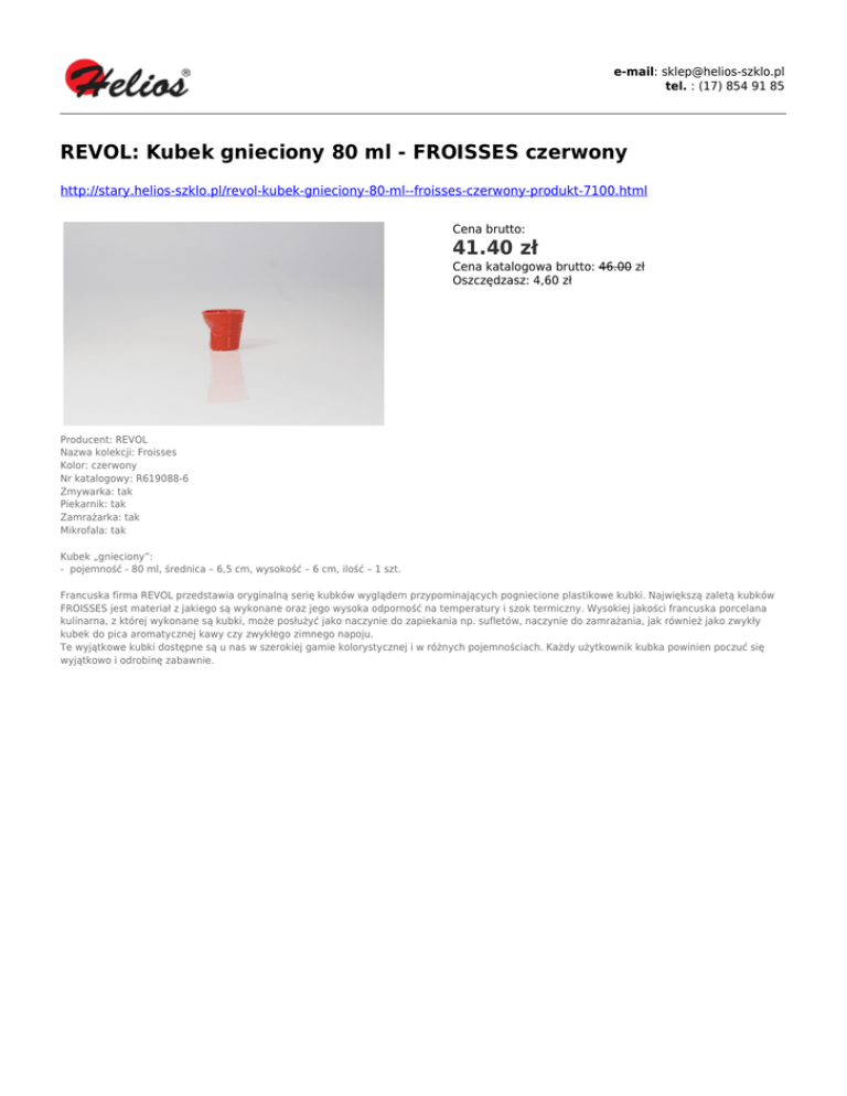 e-mail: [email protected] tel. : (17) 854 91 85 REVOL: Kubek gnieciony 80 ml - FROISSES czerwony http://stary.helios-szklo.pl/revol-kubek-gnieciony-80-ml--froisses-czerwony-produkt-7100.html Cena brutto: 41.40 zł Cena katalogowa brutto: 46.00 zł Oszczędzasz: 4,60 zł Producent: REVOL Nazwa kolekcji: Froisses Kolor: czerwony Nr katalogowy: R619088-6 Zmywarka: tak Piekarnik: tak Zamrażarka: tak Mikrofala: tak Kubek „gnieciony”: - pojemność - 80 ml, średnica – 6,5 cm, wysokość – 6 cm, ilość – 1 szt. Francuska firma REVOL przedstawia oryginalną serię kubków wyglądem przypominających pogniecione plastikowe kubki. Największą zaletą kubków FROISSES jest materiał z jakiego są wykonane oraz jego wysoka odporność na temperatury i szok termiczny. Wysokiej jakości francuska porcelana kulinarna, z której wykonane są kubki, może posłużyć jako naczynie do zapiekania np. sufletów, naczynie do zamrażania, jak również jako zwykły kubek do pica aromatycznej kawy czy zwykłego zimnego napoju. Te wyjątkowe kubki dostępne są u nas w szerokiej gamie kolorystycznej i w różnych pojemnościach. Każdy użytkownik kubka powinien poczuć się wyjątkowo i odrobinę zabawnie.