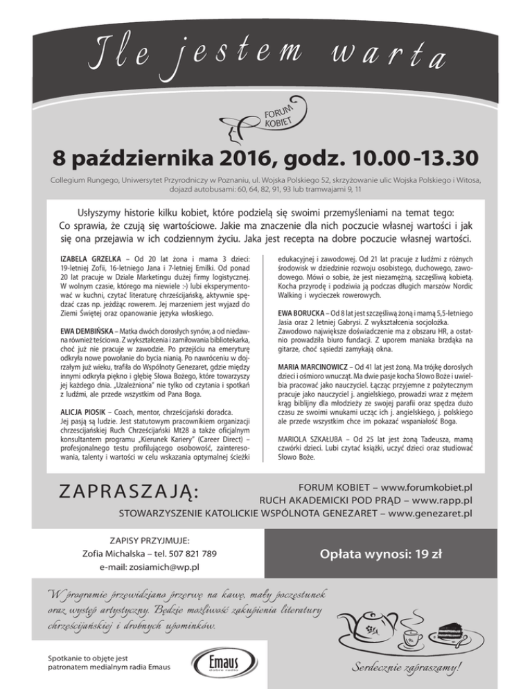 Ile jestem warta 8 października 2016, godz. 10.00-13.30 Collegium Rungego, Uniwersytet Przyrodniczy w Poznaniu, ul. Wojska Polskiego 52, skrzyżowanie ulic Wojska Polskiego i Witosa, dojazd autobusami: 60, 64, 82, 91, 93 lub tramwajami 9, 11 Usłyszymy historie kilku kobiet, które podzielą się swoimi przemyśleniami na temat tego: Co sprawia, że czują się wartościowe. Jakie ma znaczenie dla nich poczucie własnej wartości i jak się ona przejawia w ich codziennym życiu. Jaka jest recepta na dobre poczucie własnej wartości. IZABELA GRZELKA – Od 20 lat żona i mama 3 dzieci: 19-letniej Zofii, 16-letniego Jana i 7-letniej Emilki. Od ponad 20 lat pracuje w Dziale Marketingu dużej firmy logistycznej. W wolnym czasie, którego ma niewiele :-) lubi eksperymentować w kuchni, czytać literaturę chrześcijańską, aktywnie spędzać czas np. jeżdżąc rowerem. Jej marzeniem jest wyjazd do Ziemi Świętej oraz opanowanie języka włoskiego. EWA DEMBIŃSKA – Matka dwóch dorosłych synów, a od niedawna również teściowa. Z wykształcenia i zamiłowania bibliotekarka, choć już nie pracuje w zawodzie. Po przejściu na emeryturę odkryła nowe powołanie do bycia nianią. Po nawróceniu w dojrzałym już wieku, trafiła do Wspólnoty Genezaret, gdzie między innymi odkryła piękno i głębię Słowa Bożego, które towarzyszy jej każdego dnia. „Uzależniona” nie tylko od czytania i spotkań z ludźmi, ale przede wszystkim od Pana Boga. ALICJA PIOSIK – Coach, mentor, chrześcijański doradca. Jej pasją są ludzie. Jest statutowym pracownikiem organizacji chrzescijańskiej Ruch Chrześcijański Mt28 a także oficjalnym konsultantem programu „Kierunek Kariery” (Career Direct) – profesjonalnego testu profilującego osobowość, zainteresowania, talenty i wartości w celu wskazania optymalnej ścieżki edukacyjnej i zawodowej. Od 21 lat pracuje z ludźmi z różnych środowisk w dziedzinie rozwoju osobistego, duchowego, zawodowego. Mówi o sobie, że jest niezamężną, szczęśliwą kobietą. Kocha przyrodę i podziwia ją podczas długich marszów Nordic Walking i wycieczek rowerowych. EWA BORUCKA – Od 8 lat jest szczęśliwą żoną i mamą 5,5-letniego Jasia oraz 2 letniej Gabrysi. Z wykształcenia socjolożka. Zawodowo największe doświadczenie ma z obszaru HR, a ostatnio prowadziła biuro fundacji. Z uporem maniaka brzdąka na gitarze, choć sąsiedzi zamykają okna. MARIA MARCINOWICZ – Od 41 lat jest żoną. Ma trójkę dorosłych dzieci i ośmioro wnucząt. Ma dwie pasje kocha Słowo Boże i uwielbia pracować jako nauczyciel. Łącząc przyjemne z pożytecznym pracuje jako nauczyciel j. angielskiego, prowadzi wraz z mężem krąg biblijny dla młodzieży ze swojej parafii oraz spędza dużo czasu ze swoimi wnukami ucząc ich j. angielskiego, j. polskiego ale przede wszystkim chce im pokazać wspaniałość Boga. MARIOLA SZKAŁUBA – Od 25 lat jest żoną Tadeusza, mamą czwórki dzieci. Lubi czytać książki, uczyć dzieci oraz studiować Słowo Boże. ZAPRASZA JĄ: FORUM KOBIET – www.forumkobiet.pl RUCH AKADEMICKI POD PRĄD – www.rapp.pl STOWARZYSZENIE KATOLICKIE WSPÓLNOTA GENEZARET – www.genezaret.pl ZAPISY PRZYJMUJE: Zofia Michalska – tel. 507 821 789 e-mail: [email protected] Opłata wynosi: 19 zł W programie przewidziano przerwę na kawę, mały poczęstunek oraz występ artystyczny. Będzie możliwość zakupienia literatury chrześcijańskiej i drobnych upominków. Spotkanie to objęte jest patronatem medialnym radia Emaus Serdecznie zapraszamy!
