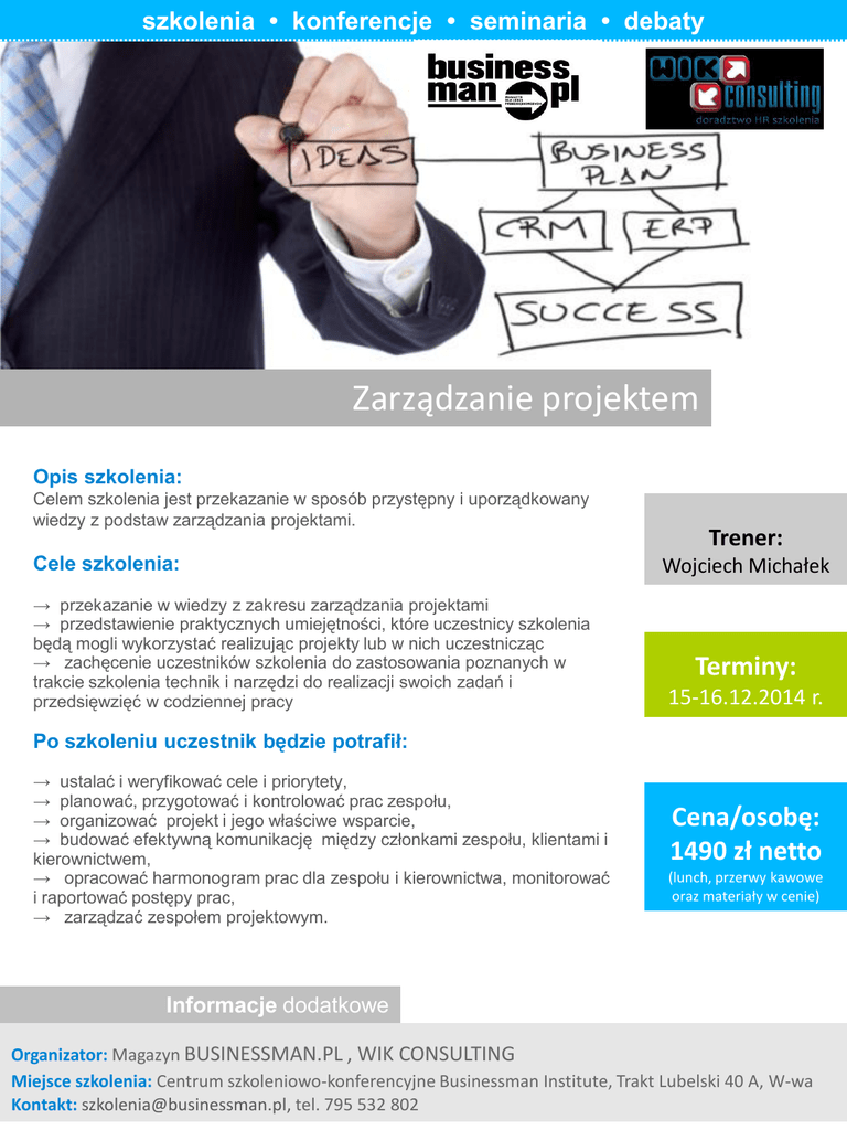 szkolenia • konferencje • seminaria • debaty Zarządzanie projektem Opis szkolenia: Celem szkolenia jest przekazanie w sposób przystępny i uporządkowany wiedzy z podstaw zarządzania projektami. Cele szkolenia: → przekazanie w wiedzy z zakresu zarządzania projektami → przedstawienie praktycznych umiejętności, które uczestnicy szkolenia będą mogli wykorzystać realizując projekty lub w nich uczestnicząc → zachęcenie uczestników szkolenia do zastosowania poznanych w trakcie szkolenia technik i narzędzi do realizacji swoich zadań i przedsięwzięć w codziennej pracy Trener: Wojciech Michałek Terminy: 15-16.12.2014 r. Po szkoleniu uczestnik będzie potrafił: → ustalać i weryfikować cele i priorytety, → planować, przygotować i kontrolować prac zespołu, → organizować projekt i jego właściwe wsparcie, → budować efektywną komunikację między członkami zespołu, klientami i kierownictwem, → opracować harmonogram prac dla zespołu i kierownictwa, monitorować i raportować postępy prac, → zarządzać zespołem projektowym. Cena/osobę: 1490 zł netto (lunch, przerwy kawowe oraz materiały w cenie) Informacje dodatkowe Organizator: Magazyn BUSINESSMAN.PL , WIK CONSULTING Miejsce szkolenia: Centrum szkoleniowo-konferencyjne Businessman Institute, Trakt Lubelski 40 A, W-wa Kontakt: [email protected], tel. 795 532 802 szkolenia • konferencje • seminaria • debaty Zarządzanie projektem Profil uczestnika: → obecni i przyszli kierownicy projektów , → uczestnicy zespołów realizujących projekty w organizacjach, → menedżerowie zaangażowani w proces wsparcia i nadzoru kierownika projektu. Program szkolenia: 1. Wprowadzenie do zarządzania projektami: → definicje, → przegląd podstawowych standardów zarządzania projektami, → rodzaje projektów - podziały i przykłady, → cechy charakterystyczne projektów , → ograniczenia projektu - czas, zakres, budżet, jakość, zasoby, → cele i obszary zarządzania projektami. 2. Zarządzanie projektem – procesy projektu, model fazowy projektu. 3. Analiza projektu: → analiza środowiska i udziałowców , → otoczenie projektu. 4. Cele projektu z uwzględnieniem grup interesariuszy projektu, definiowanie celów SMART. 5. Formuła realizacyjna projektu. 6. Uzasadnienie biznesowe projektu. 7. Organizacja projektu: → zespół zarządzania projektem , → matryca odpowiedzialności , → komitet sterujący: Przewodniczący, Główny Dostawca, Główny Użytkownik, Kierownik Projektu, → kierownik zespołu wykonawczego i Zespół wykonawczy, → nadzór i wsparcie, → projekt w środowisku Klient-Dostawca. Informacje dodatkowe Organizator: Magazyn BUSINESSMAN.PL , WIK CONSULTING Miejsce szkolenia: Centrum szkoleniowo-konferencyjne Businessman Institute, Trakt Lubelski 40 A, W-wa Kontakt: [email protected], tel. 795 532 811 szkolenia • konferencje • seminaria • debaty Zarządzanie projektem Program szkolenia 8. Planowanie działań i zasobów – harmonogram: → zasoby projektu – rodzaje, → struktura podziału prac – WBS, → metoda ścieżki krytycznej, → wykres Gantta, → uwzględnianie czynności zarządczych i zarządzania ryzykiem w planie i harmonogramie. 9. Monitorowanie projektu: → kamienie milowe, → analiza trendu kamieni milowych, → raportowanie. 10. Zamykanie projektu: → weryfikacja projektu, → akceptacja klienta, → przeniesienie doświadczeń na kolejne projekty. Metody szkoleniowe: → → → → → ćwiczenia w małych grupach, ćwiczenia indywidualne, analizy przypadków, dyskusja moderowana, wymiana doświadczeń uczestników. Informacje dodatkowe Organizator: Magazyn BUSINESSMAN.PL , WIK CONSULTING Miejsce szkolenia: Centrum szkoleniowo-konferencyjne Businessman Institute, Trakt Lubelski 40 A, W-wa Kontakt: [email protected], tel. 795 532 811