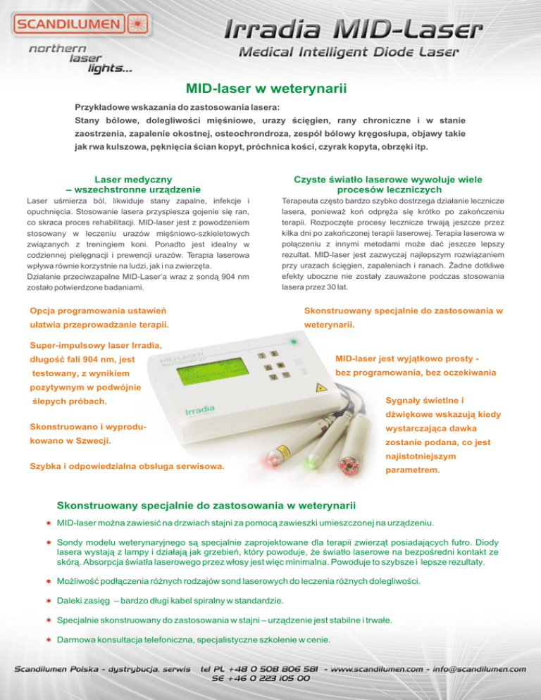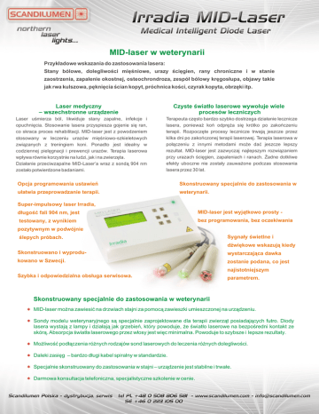 MID-laser w weterynarii Przyk³adowe wskazania do zastosowania lasera: Stany bólowe, dolegliwoœci miêœniowe, urazy œciêgien, rany chroniczne i w stanie zaostrzenia, zapalenie okostnej, osteochrondroza, zespó³ bólowy krêgos³upa, objawy takie jak rwa kulszowa, pêkniêcia œcian kopyt, próchnica koœci, czyrak kopyta, obrzêki itp. Laser medyczny – wszechstronne urz¹dzenie Laser uœmierza ból, likwiduje stany zapalne, infekcje i opuchniêcia. Stosowanie lasera przyspiesza gojenie siê ran, co skraca proces rehabilitacji. MID-laser jest z powodzeniem stosowany w leczeniu urazów miêœniowo-szkieletowych zwi¹zanych z treningiem koni. Ponadto jest idealny w codziennej pielêgnacji i prewencji urazów. Terapia laserowa wp³ywa równie korzystnie na ludzi, jak i na zwierzêta. Dzia³anie przeciwzapalne MID-Laser’a wraz z sond¹ 904 nm zosta³o potwierdzone badaniami. Czyste œwiat³o laserowe wywo³uje wiele procesów leczniczych Terapeuta czêsto bardzo szybko dostrzega dzia³anie lecznicze lasera, poniewa¿ koñ odprê¿a siê krótko po zakoñczeniu terapii. Rozpoczête procesy lecznicze trwaj¹ jeszcze przez kilka dni po zakoñczonej terapii laserowej. Terapia laserowa w po³¹czeniu z innymi metodami mo¿e daæ jeszcze lepszy rezultat. MID-laser jest zazwyczaj najlepszym rozwi¹zaniem przy urazach œciêgien, zapaleniach i ranach. ¯adne dotkliwe efekty uboczne nie zosta³y zauwa¿one podczas stosowania lasera przez 30 lat. Opcja programowania ustawieñ Skonstruowany specjalnie do zastosowania w u³atwia przeprowadzanie terapii. weterynarii. Super-impulsowy laser Irradia, d³ugoœæ fali 904 nm, jest MID-laser jest wyj¹tkowo prosty - testowany, z wynikiem bez programowania, bez oczekiwania pozytywnym w podwójnie œlepych próbach. Sygna³y œwietlne i dŸwiêkowe wskazuj¹ kiedy Skonstruowano i wyprodu- wystarczaj¹ca dawka kowano w Szwecji. zostanie podana, co jest najistotniejszym Szybka i odpowiedzialna obs³uga serwisowa. parametrem. Skonstruowany specjalnie do zastosowania w weterynarii MID-laser mo¿na zawiesiæ na drzwiach stajni za pomoc¹ zawieszki umieszczonej na urz¹dzeniu. Sondy modelu weterynaryjnego s¹ specjalnie zaprojektowane dla terapii zwierz¹t posiadaj¹cych futro. Diody lasera wystaj¹ z lampy i dzia³aj¹ jak grzebieñ, który powoduje, ¿e œwiat³o laserowe na bezpoœredni kontakt ze skór¹. Absorpcja œwiat³a laserowego przez w³osy jest wiêc minimalna. Powoduje to szybsze i lepsze rezultaty. Mo¿liwoœæ pod³¹czenia ró¿nych rodzajów sond laserowych do leczenia ró¿nych dolegliwoœci. Daleki zasiêg – bardzo d³ugi kabel spiralny w standardzie. Specjalnie skonstruowany do zastosowania w stajni – urz¹dzenie jest stabilne i trwa³e. Darmowa konsultacja telefoniczna, specjalistyczne szkolenie w cenie. Dodatkowe informacje o sondach laserowych Wszystkie rodzaje przedstawionych laserów emituj¹ œwiat³o o w³aœciwoœciach biostymulacyjnych. Niemniej, badania oraz doœwiadczenia wskazuj¹ no to, ¿e pewne rodzaje laserów okazuj¹ siê skuteczniejsze do poszczególnych zastosowañ. Urz¹dzenie sk³ada siê z Jednostki Podstawowej oraz Sondy po³¹czonej specjalnym elastycznym spiralnym przewodem umo¿liwiaj¹cym pracê w ka¿dych warunkach. Wewn¹trz ka¿dej sondy znajduj¹ siê lasery. Oferujemy sondy z pojedynczym laserem oraz multisondy wyposa¿one w cztery lasery. Sondy s¹ zaprojektowane w taki sposób, aby umo¿liwiæ pracê na skórze zwierz¹t, nawet tam gdzie wystêpuje ow³osienie. Wszelkie specyfikacje mocy wyjœciowej promienia dotycz¹ œredniej mocy wyjœciowej, a nie maksymalnej chwilowej! D³ugoœæ fali 904 nm, laser GaAs, super-impulsowa, multisonda lub sonda pojedyncza Najlepszy laser do leczenia problemów z poruszaniem siê – œwiat³o tego lasera wnika g³êbiej ni¿ jakiekolwiek inne. Jest to nasz ulubiony laser, g³ównie ze wzglêdu na doskona³e rezultaty, jakie osi¹gaj¹ nasi klienci od wielu lat. 904 ró¿ni sê od innych laserów tym, ¿e zawsze jest super-impulsowy. Emituje bardzo intensywne impulsy niewidocznego œwiat³a. Moc szczytowa najmocniejszej sondy siêga 80 W na diodê laserow¹. Daje to bardzo wysok¹ gêstoœæ mocy, która jest bardzo istotna dla osi¹gniêcia po¿¹danych rezultatów terapii. Laser 904 nm jest najskuteczniejszy w leczeniu problemów uk³adu ruchowego (np. zapalenie œciêgien, bóle miêœniowe, bóle stawów, opuchniêcia, zasinienia) i GaAs 904nm - Sondy z 4 diodami laserowymi wp³ywa korzystnie na kr¹¿enie krwi. Wed³ug naszych informacji laser GaAs 904 nm to jedyny laser, który ma tak o mocy 120 oraz 240 mW. samo silne dzia³anie przy wszystkich czêstotliwoœciach impulsowych. MID-Laser razem z sond¹ 904nm zosta³ do tej pory wyprodukowany w ponad 800 egzemplarzach i wyeksportowany do wielu krajów. Jest dostêpny w wersji multisondy, z czterema laserami, o mocy wyjœciowej 120 mW lub 240 mW, lub z pojedyncz¹ sond¹ o mocy wyjœciowej 60 mW. D³ugoœæ fali 808 nm, laser GaAlAs, tryb pracy ci¹g³y, impusowy Najskuteczniejszy w leczeniu zapaleñ lub problemów ze œciêgnami Sondy Irradia GaAlAs 250 - 900 mW Laser ten zosta³ doceniony w leczeniu chronicznych ran (np. venous varicose ulcer - ¿ylaki), zapalenia œciêgien i liszai. Emituje intensywne, ale niewidoczne œwiat³o w spektrum zbli¿onym do podczerwieni, d³ugoœæ fali 808 nm. Sonda ta mo¿e byæ równie¿ stosowana w akupunkturze laserowej i leczeniu ognisk zapalnych. Przy leczeniu szumu w uszach zaleca siê zastosowanie lasera o mocy co najmniej 450 mW. Laser 808 emituje œwiat³o ci¹g³e lub impulsowe z czêstotliwoœci¹ od 25 Hz do 5000 Hz. Lasery o dzia³aj¹ce w trybie ci¹g³ym, maj¹ mniejsz¹ moc wyjœciow¹, ni¿ te pracuj¹ce w trybie impulsowym. Laser 808 nm mo¿e byæ dostarczony z moc¹ wyjœciow¹ od 250 mW do 900 mW. Laser Indowy, d³ugoœæ fali 650 nm, 30mW, tryb pracy ci¹g³y, impulsowy Najskuteczniejszy w leczeniu ran oraz pielêgnacji skóry. Ten laser jest zazwyczaj stos