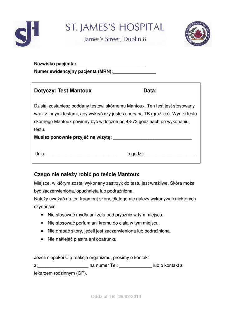 Nazwisko pacjenta: ___________________________ Numer ewidencyjny pacjenta (MRN):_________________ Dotyczy: Test Mantoux Data: Dzisiaj zostaniesz poddany testowi skórnemu Mantoux. Ten test jest stosowany wraz z innymi testami, aby wykry czy jeste chory na TB (gru lica). Wyniki testu skórnego Mantoux powinny by widoczne po 48-72 godzinach po wykonaniu testu. Musisz ponownie przyj na wizyt : _______________________________ dnia:____________________________ o godz.:_____________________ Czego nie nale y robi po te cie Mantoux Miejsce, w którym został wykonany zastrzyk do testu jest wra liwe. Skóra mo e by zaczerwieniona, opuchni ta lub podra niona. Nale y uwa a na ten fragment skóry, dlatego nie nale y wykonywa niektórych czynno ci: • Nie stosowa mydła ani elu pod prysznic w tym miejscu. • Nie stosowa perfum ani kremu do ciała w tym miejscu. • Nie drapa skóry, je eli jest zaczerwieniona lub podra niona. • Nie nakleja plastra ani opatrunku. Je eli niepokoi Ci reakcja organizmu, prosimy o kontakt z:____________________ na numer Tel: _____________ lub o kontakt z lekarzem rodzinnym (GP). Oddział TB 25/02/2014