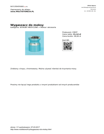Glinka Agency mail;[email protected] Zapraszamy do sklepu www.MULTISTORE24.PL Warszawa tel. +48 602 395 051 Wygaszacz do moksy kategoria: WYROBY MEDYCZNE > Moksa i akcesoria Producent: CMCP Cena netto: 21,14 zł Cena brutto: 26,00 zł Kod QR: Zrobiony z brązu, chromowany. Można używać również do trzymania moxy. Prosimy nie łączyć tego produktu z innymi produktami od innych producentów strona: 1/1 wydrukowano: 07-03-2017 http://www.multistore24.pl/wygaszacz-do-moksy.html