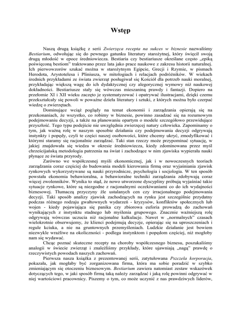 Wstęp Naszą drugą książkę z serii Zwierzęca recepta na sukces w biznesie nazwaliśmy Bestiarium, odwołując się do pewnego gatunku literatury starożytnej, który święcił swoją drugą młodość w epoce średniowiecza. Bestiaria czy bestiariusze określane często „epiką poświęconą bestiom” traktowano przez lata jako prace naukowe z zakresu historii naturalnej. Ich pierwowzorów szukać można w starożytnym Egipcie, Grecji i Rzymie, w pismach Herodota, Arystotelesa i Pliniusza, w mitologiach i relacjach podróżników. W wiekach średnich przykładami ze świata zwierząt posługiwał się Kościół dla potrzeb nauki moralnej, przykładając większą wagę do ich dydaktycznej czy alegorycznej wymowy niż naukowej dokładności. Bestiariusze stały się wówczas mieszaniną prawdy i fantazji. Dopiero na przełomie XI i XII wieku zaczęto je systematyzować i opatrywać ilustracjami, dzięki czemu przekształcały się powoli w poważne dzieła literatury i sztuki, z których można było czerpać wiedzę o zwierzętach. Dominujące wciąż poglądy na temat ekonomii i zarządzania opierają się na przekonaniach, że wszystko, co robimy w biznesie, powinno zasadzać się na rozumowym podejmowaniu decyzji, a także na planowaniu opartym o modele szczegółowo przewidujące przyszłość. Tego typu podejście nie uwzględnia zwierzęcej natury człowieka. Zapominamy o tym, jak ważną rolę w naszym sposobie działania czy podejmowania decyzji odgrywają instynkty i popędy, czyli te części naszej osobowości, które chcemy ukryć, zmodyfikować i którymi staramy się racjonalnie zarządzać. Taki stan rzeczy może przypominać sytuację, w jakiej znajdowała się wiedza w okresie średniowiecza, kiedy zdominowana przez myśl chrześcijańską metodologia patrzenia na świat i zachodzące w nim zjawiska wypierała nauki płynące ze świata przyrody. Zarówno we współczesnej myśli ekonomicznej, jak i w nowoczesnych teoriach zarządzania coraz częściej do budowania modeli kierowania firmą oraz wyjaśniania zjawisk rynkowych wykorzystywane są nauki przyrodnicze, psychologia i socjologia. W ten sposób powstała ekonomia behawioralna, a behawioralne techniki zarządzania zdobywają coraz więcej zwolenników. Wynika to stąd, że nowo utworzone dyscypliny próbują wyjaśniać takie sytuacje rynkowe, które są niezgodne z racjonalnymi oczekiwaniami co do ich wydajności biznesowej. Tłumaczą przyczyny źle ustalanych cen czy irracjonalnego podejmowania decyzji. Taki sposób analizy zjawisk zachodzących na rynku jest szczególnie przydatny podczas różnego rodzaju gwałtownych wydarzeń - kryzysów, konfliktów społecznych lub wojen - kiedy pojawiająca się panika czy zbiorowa euforia prowadzą do zachowań wynikających z instynktu stadnego lub myślenia grupowego. Znacznie ważniejszą rolę odgrywają wówczas uczucia niż racjonalne kalkulacje. Nawet w „normalnych” czasach wielokrotnie obserwujemy, że klienci podejmują decyzje, opierając się na uproszczeniach i regule kciuka, a nie na gruntownych przemyśleniach. Ludzkie działanie jest bowiem niezwykle wrażliwe na okoliczności - podlega instynktom i popędom częściej, niż mogłoby nam się wydawać. Chcąc poznać skuteczne recepty na choroby współczesnego biznesu, poszukaliśmy analogii w świecie zwierząt i znaleźliśmy przykłady, które ujawniają „nagą” prawdę o rzeczywistych powodach naszych zachowań. Pierwsza nasza książka z prezentowanej serii, zatytułowana Pszczela korporacja, pokazała, jak mogłaby być zorganizowana firma, która ma sobie poradzić w szybko zmieniającym się otoczeniu biznesowym. Bestiarium zawiera natomiast zestaw wskazówek dotyczących tego, w jaki sposób firmą taką należy zarządzać i jaką rolę powinni odgrywać w niej wartościowi pracownicy. Piszemy o tym, co może uczynić z nas prawdziwych liderów, jak szukać siły i przewagi w naszych zaletach, a także o tym, jak nie dać sobie wmówić, że skoro jesteśmy mniejsi, to nie mamy szans na zwycięstwo. Wskazujemy, w jaki sposób, uwalniając się od chęci kontrolowania przyszłości, możemy realizować duże projekty. Opisujemy, gdzie szukać w zespole synergii i jak docierać do podświadomości klientów i pracowników, żeby pomóc im w optymalny sposób osiągać cele, urzeczywistniając jednocześnie założenia biznesowe właścicieli firmy. Staramy się przedstawić cały złożony – racjonalny i nieracjonalny – sposób podejmowania decyzji. Chcemy również zwrócić uwagę na to, że etyczne działania we współczesnym biznesie mogą być skuteczne. Pokazując mechanizmy funkcjonujące w świecie przyrody oraz odnosząc je do zasad działania korporacji, takich jak RWE czy ........, podważamy dość powszechnie panujący wśród menedżerów pogląd, że w dobrze funkcjonującej maszynie, jaką jest firma, pracownicy powinni być tylko trybikami. Udowadniamy, że znacznie lepiej jest, gdy pracownicy traktowani są podmiotowo, bo dzięki temu w organizacjach uaktywniają się „zwierzęce” mechanizmy motywacji grupowej i siła pozytywnych związków interpersonalnych. Obserwujemy wówczas u pracowników rosnącą gotowość do brania udziału we wspólnym wysiłku, zaangażowanie w pracę i przedsiębiorczość. Każdy zespół działa autonomicznie, ale z myślą o korzyści całej firmy. Opisy zachowań różnych zwierząt: ssaków, ptaków czy owadów społecznych uświadamiają nam, skąd w zespole może brać się motywacja do osiągania wspólnych celów. Jest to motywacja poprzez wartości – zwierzęcy lider trzyma się blisko swoich podopiecznych i podejmuje decyzje dla dobra całego stada, a nie swoich partykularnych interesów. Każdy robi to, na czym się zna najlepiej. Nie ma złożonych struktur, wielopoziomowe hierarchie są tylko tam, gdzie jest to bezwzględnie konieczne. Przy jednoczesnej dyscyplinie i swobodzie działania zespół dąży do