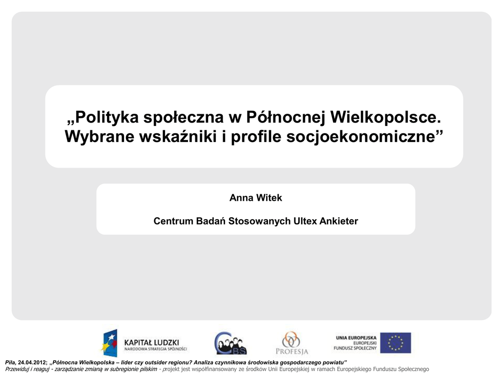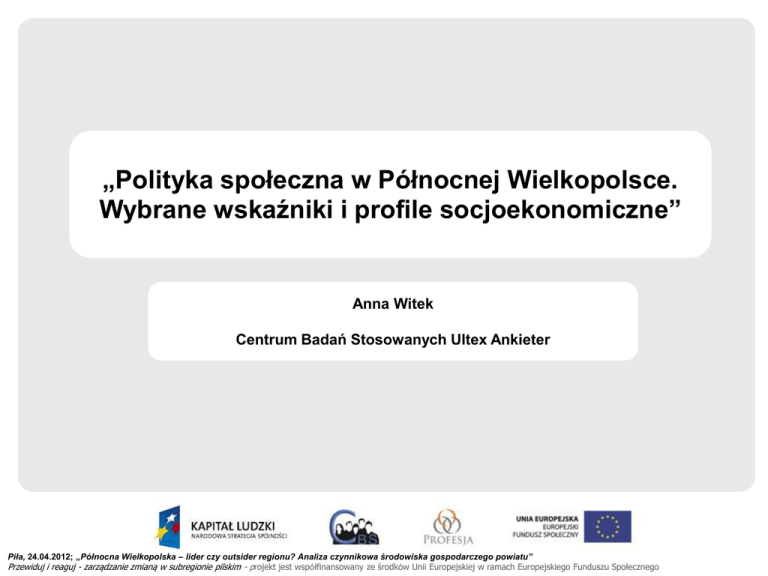 „Polityka społeczna w Północnej Wielkopolsce. Wybrane wskaźniki i profile socjoekonomiczne” Anna Witek Centrum Badań Stosowanych Ultex Ankieter Piła, 24.04.2012; „Północna Wielkopolska – lider czy outsider regionu? Analiza czynnikowa środowiska gospodarczego powiatu” Przewiduj i reaguj - zarządzanie zmianą w subregionie pilskim - projekt jest współfinansowany ze środków Unii Europejskiej w ramach Europejskiego Funduszu Społecznego PLAN PREZENTACJI Część I – Polityka społeczna Część II – Założenia metodologiczne, konstrukcje profili Część III – Prezentacja wybranych wskaźników i profili Część IV – Podsumowanie i wnioski – zbiorcze rankingi powiatów Piła, 24.04.2012; „Północna Wielkopolska – lider czy outsider regionu? Analiza czynnikowa środowiska gospodarczego powiatu” Przewiduj i reaguj - zarządzanie zmianą w subregionie pilskim - projekt jest współfinansowany ze środków Unii Europejskiej w ramach Europejskiego Funduszu Społecznego Część I Polityka społeczna Piła, 24.04.2012; „Północna Wielkopolska – lider czy outsider regionu? Analiza czynnikowa środowiska gospodarczego powiatu” Przewiduj i reaguj - zarządzanie zmianą w subregionie pilskim - projekt jest współfinansowany ze środków Unii Europejskiej w ramach Europejskiego Funduszu Społecznego POLITYKA SPOŁECZNA – STRATEGIA POLITYKI SPOŁECZNEJ DLA WOJEWÓDZTWA WIELKOPOLSKIEGO DO 2020 ROKU Dynamicznie rozumiana polityka społeczna zakłada, że każdy członek społeczności może i powinien być architektem i katalizatorem zmian w tej sferze (zwłaszcza na poziomie lokalnym) - społeczności są silne wtedy, gdy uwalniany jest ludzki potencjał, a w ich ramach budowane jest zaufanie i stosunki między ludźmi, gdy mobilizują kreatywność i zasoby na rzecz pewnej wizji przyszłości, zachęcają do przywództwa społecznego. Zaangażowanie obywateli w rozwiązywanie własnych problemów nie zwalnia jednakże państwa i jego instytucji z odpowiedzialności za realizowanie zadań związanych z kreowaniem i realizacją programów z zakresu polityki społecznej – na znaczeniu zyskują zwłaszcza działania takie jak bezpieczeństwo publiczne, rozwój dzieci i młodzieży (równość szans), jakość pracy dającej możliwość utrzymania współczesnych standardów życia, uruchamianie mechanizmów generujących ruchliwość społeczną, gwarantowanie dostępu do infrastruktury społecznej, ochrona zasobów naturalnych i ekosystemu, przystępne cenowo i właściwie zaprojektowane mieszkania, wzmacnianie rodziny i przebudowa systemu wsparcia i opieki. Rosnąca nierównowaga między wymogami płynącymi ze środowiska społecznego i możliwościami sprostania tym oczekiwaniom przez wiele jednostek i grup społecznych (zasoby) tworzy barierę efektywności sektora publicznego. Wiele wskazuje na to, iż polityka społeczna najbliższych lat nie będzie efektywna bez wykorzystania przez sektor publiczny potencjału organizacji ochotniczych oraz sieci powiązań rodzinno-przyjacielskich i sąsiedzkich. Polityka społeczna generowana na szczeblu centralnym polega zatem na tworzeniu ramy prawnoorganizacyjnej (ustawodawstwo i redystrybucja) dla działań służących równoprawnemu traktowaniu obywateli/grup/zbiorowości i ich rozwojowi, a także ochronie warunków i jakości ich życia oraz otwierających jednostkom i grupom społecznym drogę do głównego nurtu życia zbiorowego. Piła, 24.04.2012; „Północna Wielkopolska – lider czy outsider regionu? Analiza czynnikowa środowiska gospodarczego powiatu” Przewiduj i reaguj - zarządzanie zmianą w subregionie pilskim - projekt jest współfinansowany ze środków Unii Europejskiej w ramach Europejskiego Funduszu Społecznego 4 ZASADY OGÓLNE POLITYKI SPOŁECZNEJ Do tradycyjnych obszarów polityki społecznej (zdrowie, bezpieczeństwo socjalne, pomoc społeczna) i dominujących do niedawna form działania (interwencja, ratownictwo społeczne) dopisujemy współcześnie takie kwestie jak rozwój dzieci i młodzieży, wzmacnianie rodziny, mieszkalnictwo i zatrudnienie wraz z przypisanymi im świadczeniami, edukację i rynek pracy, bezpieczeństwo publiczne, a także kulturę, komunikowanie oraz zajęcia czasu wolnego itp. (szerzej: organizacja życia społecznego służąca poprawie jakości życia). Polityka społeczna bazując na jakimś jednym podsystemie (rynek pracy, edukacja, zdrowie, pomoc społeczna itp.) musi działać na rzecz większych całości społecznych (społeczeństwa, zbiorowości, grup, kategorii społecznych, jednostek), pełniąc pewną globalną rolę przy coraz bardziej ograniczonych możliwościach działania i kurczących się zasobach (opcja: równoważenia potrzeb i możliwości). W ostatecznym rozrachunku zadaniem polityki społecznej jest więc kształtowanie zasad podziału, regulowanie instytucjonalnej struktury sfery społecznej oraz systemów finansowo-ekonomicznych i ich funkcjonowania, jak również tworzenie warunków dla samorządności i współuczestnictwa adresatów działań. Piła, 24.04.2012; „Północna Wielkopolska – lider czy outsider regionu? Analiza czynnikowa środowiska gospodarczego powiatu” Przewiduj i reaguj - zarządzanie zmianą w subregionie pilskim - projekt jest współfinansowany ze środków Unii Europejskiej w ramach Europejskiego Funduszu Społecznego 5 Część II Założenia metodologiczne, konstrukcje profili Piła, 24.04.2012; „Północna Wielkopolska – lider czy outsider regionu? Analiza czynnikowa środowiska gospodarczego powiatu” Przewiduj i reaguj - zarządzanie zmianą w subregionie pilskim - projekt jest współfinansowany ze środków Unii Europejskiej w ramach Europejskiego Funduszu Społecznego GŁÓWNE CELE ANALIZY PROFILI SOCJODEMOGRAFICZNYCH WOJEWÓDZTWA WIELKOPOLSKIEGO Ustalić zestaw danych statystycznych (wskaźników) istotnych dla tworzenia programu i strategii polityki społecznej Zdiagnozować i o