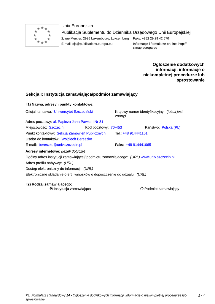 Unia Europejska Publikacja Suplementu do Dziennika Urzędowego Unii Europejskiej 2, rue Mercier, 2985 Luxembourg, Luksemburg Faks: +352 29 29 42 670 E-mail: [email protected] Informacje i formularze on-line: http:// simap.europa.eu Ogłoszenie dodatkowych informacji, informacje o niekompletnej procedurze lub sprostowanie Sekcja I: Instytucja zamawiająca/podmiot zamawiający I.1) Nazwa, adresy i punkty kontaktowe: Oficjalna nazwa: Uniwersytet Szczeciński Krajowy numer identyfikacyjny: (jeżeli jest znany) _____ Adres pocztowy: al. Papieża Jana Pawła II Nr 31 Miejscowość: Szczecin Kod pocztowy: 70-453 Punkt kontaktowy: Sekcja Zamówień Publicznych Państwo: Polska (PL) Tel.: +48 914441151 Osoba do kontaktów: Wojciech Bereszko E-mail: [email protected] Faks: +48 914441065 Adresy internetowe: (jeżeli dotyczy) Ogólny adres instytucji zamawiającej/ podmiotu zamawiającego: (URL) www.univ.szczecin.pl Adres profilu nabywcy: (URL) _____ Dostęp elektroniczny do informacji: (URL) _____ Elektroniczne składanie ofert i wniosków o dopuszczenie do udziału: (URL) _____ I.2) Rodzaj zamawiającego: Instytucja zamawiająca Podmiot zamawiający PL Formularz standardowy 14 - Ogłoszenie dodatkowych informacji, informacje o niekompletnej procedurze lub sprostowanie 1/4 Sekcja II: Przedmiot zamówienia II.1.1) Nazwa nadana zamówieniu: wykonanie instalacji multimedialnej oraz dostawa i montaż sprzętu Audio-Video w 21 salach w ramach przebudowy istniejącego budynku nr 4 wraz z przebudową i rozbudową infrastruktury technicznej i zagospodarowania terenu w Kampusie Uniwersytetu Szczecińskiego przy al. Piastów 40b w Szczecinie II.1.2) Krótki opis zamówienia lub zakupu: (podano w pierwotnym ogłoszeniu) wykonanie instalacji multimedialnej oraz dostawa i montaż sprzętu Audio-Video w 21 salach w ramach przebudowy istniejącego budynku nr 4 wraz z przebudową i rozbudową infrastruktury technicznej i zagospodarowania terenu w Kampusie Uniwersytetu Szczecińskiego przy al. Piastów 40b w Szczecinie II.1.3) Wspólny Słownik Zamówień (CPV) Główny przedmiot Słownik główny 45000000 Słownik uzupełniający (jeżeli dotyczy) PL Formularz standardowy 14 - Ogłoszenie dodatkowych informacji, informacje o niekompletnej procedurze lub sprostowanie 2/4 Sekcja IV: Procedura IV.1)Rodzaj procedury (podano w pierwotnym ogłoszeniu) Otwarta Ograniczona Ograniczona przyspieszona Negocjacyjna Negocjacyjna przyspieszona Dialog konkurencyjny Negocjacyjna z uprzednim ogłoszeniem Negocjacyjna bez uprzedniego ogłoszenia Negocjacyjna z publikacją ogłoszenia o zamówieniu Negocjacyjna bez publikacji ogłoszenia o zamówieniu Udzielenie zamówienia bez uprzedniej publikacji ogłoszenia o zamówieniu w Dzienniku Urzędowym Unii Europejskiej IV.2)Informacje administracyjne IV.2.1)Numer referencyjny: (podano w pierwotnym ogłoszeniu) TP/371/30/16 IV.2.2)Dane referencyjne ogłoszenia w przypadku ogłoszeń przesłanych drogą elektroniczną: Pierwotne ogłoszenie przesłane przez eNotices TED eSender Login: ENOTICES_szczec Dane referencyjne ogłoszenia: 2016-042328 rok i numer dokumentu IV.2.3)Ogłoszenie, którego dotyczy niniejsza publikacja: Numer ogłoszenia w Dz.U.: 2016/S 068-118097 z dnia: 07/04/2016 (dd/mm/rrrr) IV.2.4)Data wysłania pierwotnego ogłoszenia: 05/04/2016 (dd/mm/rrrr) PL Formularz standardowy 14 - Ogłoszenie dodatkowych informacji, informacje o niekompletnej procedurze lub sprostowanie 3/4 Sekcja VI: Informacje uzupełniające VI.1) Ogłoszenie dotyczy: Procedury niepełnej Sprostowania Informacji dodatkowych VI.2) Informacje na temat niepełnej procedury udzielenia zamówienia: Postępowanie o udzielenie zamówienia zostało przerwane Postępowanie o udzielenie zamówienia uznano za nieskuteczne Zamówienia nie udzielono Zamówienie może być przedmiotem ponownej publikacji VI.3) Informacje do poprawienia lub dodania : VI.3.1) Zmiana oryginalnej informacji podanej przez instytucję zamawiającą Publikacja w witrynie TED niezgodna z oryginalną informacją, przekazaną przez instytucję zamawiającą Oba przypadki VI.3.2) W ogłoszeniu pierwotnym W odpowiedniej dokumentacji przetargowej (więcej informacji w odpowiedniej dokumentacji przetargowej) W obu przypadkach (więcej informacji w odpowiedniej dokumentacji przetargowej) VI.3.3) Tekst, który należy poprawić w pierwotnym ogłoszeniu Miejsce, w którym znajduje się Zamiast: zmieniany tekst: Powinno być: VI.3.4) Daty, które należy poprawić w pierwotnym ogłoszeniu Miejsce, w którym znajdują się Zamiast: zmieniane daty: 16/05/2016 Godzina: 11:30 IV.3.4) (dd/mm/rrrr) Powinno być: 30/05/2016 Godzina: 11:30 (dd/mm/rrrr) Miejsce, w którym znajdują się zmieniane daty: IV.3.8) Powinno być: 30/05/2016 Godzina: 12:00 (dd/mm/rrrr) Zamiast: 16/05/2016 Godzina: 12:00 (dd/mm/rrrr) VI.3.5) Adresy i punkty kontaktowe, które należy poprawić VI.3.6) Tekst, który należy dodać do pierwotnego ogłoszenia Miejsce, w którym należy dodać tekst: Tekst do dodania: VI.4) Inne dodatkowe informacje: wyjaśnienia treści SIWZ są w trakcie opracowywania. VI.5) Data wysłania niniejszego ogłoszenia: 04/05/2016 (dd/mm/rrrr) - ID:2016-057638 PL Formularz standardowy 14 - Ogłoszenie dodatkowych informacji, informacje o niekompletnej procedurze lub sprostowanie 4/4