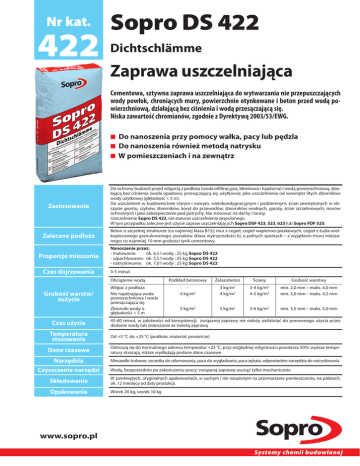 Nr kat. 422 Sopro DS 422 Dichtschlämme Zaprawa uszczelniająca Cementowa, sztywna zaprawa uszczelniająca do wytwarzania nie przepuszczających wody powłok, chroniących mury, powierzchnie otynkowane i beton przed wodą powierzchniową, działającą bez ciśnienia i wodą przesączającą się. Niska zawartość chromianów, zgodnie z Dyrektywą 2003/53/EWG. ■ Do nanoszenia przy pomocy wałka, pacy lub pędzla ■ Do nanoszenia również metodą natrysku ■ W pomieszczeniach i na zewnątrz Zastosowanie Do ochrony budowli przed wilgocią z podłoża (woda infiltracyjna, błonkowa i kapilarna) i wodą powierzchniową, działającą bez ciśnienia (woda opadowa, przesączającą się, użytkowa); jako uszczelnienie od wewnątrz litych zbiorników wody użytkowej (głębokość < 5 m). Do uszczelnień w budownictwie starym i nowym, wielokondygnacyjnym i podziemnym, ścian zewnętrznych w obszarze gruntu, szybów, zbiorników, koryt do przewodów, zbiorników wodnych, garaży, ścian szczelinowych, murów ochronnych i jako zabezpieczenie pod jastrychy. Nie stosować na dachy i tarasy. Uszczelnienie Sopro DS 422, nie stanowi uszczelnienia zespolonego. W tym przypadku zalecane jest użycie zapraw uszczelniających Sopro DSF 423, 523, 623 lub Sopro FDF 525. Zalecane podłoża Beton o szczelnej strukturze (co najmniej klasa B15); mur z cegieł, cegieł wapienno-piaskowych, cegieł z żużla wielkopiecowego granulowanego, pustaków (klasa wytrzymałości 6), o pełnych spoinach – z wyjątkiem muru mieszanego; co najmniej 10 mm grubości tynk cementowy. Proporcje mieszania Czas dojrzewania Nanoszenie przez: - malowanie: ok.6,5 l wody : 25 kg Sopro DS 422 - szpachlowanie: ok.5,5 l wody : 25 kg Sopro DS 422 - natryskiwanie: ok.7,0 l wody : 25 kg Sopro DS 422 3-5 minut Obciążenie wodą Grubość warstw/ zużycie Czas użycia Temperatura stosowania Wilgoć z podłoża Nie napierająca woda powierzchniowa i woda przesączająca się Zbiorniki wody o głębokości < 5 m Podkład betonowy Żelazobeton Ściany Grubość warstwy 4 kg/m2 3 kg/m2 4 kg/m2 3-4 kg/m2 4-5 kg/m2 min. 2,0 mm – maks. 4,0 mm min. 3,0 mm – maks. 4,5 mm 5 kg/m2 5 kg/m2 5-6 kg/m2 min. 3,5 mm – maks. 5,0 mm 45-60 minut, w zależności od konsystencji; związanej zaprawy nie należy uzdatniać do ponownego użycia przez dodanie wody lub zmieszanie ze świeżą zaprawą Od +5 °C do +25 °C (podłoże, materiał, powietrze) Dane czasowe Odnoszą się do normalnego zakresu temperatur +23 °C, przy względnej wilgotności powietrza 50%; wyższe temperatury skracają, niższe wydłużają podane dane czasowe Narzędzia Mieszadło śrubowe, szczotka do szlamowania, paca do wygładzania, paca zębata, odpowiednie narzędzia do natryskiwania Czyszczenie narzędzi Wodą, bezpośrednio po zakończeniu pracy; związaną zaprawę usunąć tylko mechanicznie Składowanie W zamkniętych, oryginalnych opakowaniach, w suchym i nie narażonym na przemarzanie pomieszczeniu, na paletach, ok. 12 miesięcy od daty produkcji. Opakowania Worek 20 kg, worek 10 kg www.sopro.pl Systemy chemii budowlanej Właściwości Zaprawa uszczelniająca Sopro DSF DS 422 jest cementową, mineralną zaprawą drobnoziarnistą do nakładania powłok jako zabezpieczenie przed wodą i wilgocią. Jest odporna na oddziaływanie wody, czynników atmosferycznych i mrozu, a także nie przyspiesza korozji. Przygotowanie podłoża Podłoża muszą być nośne, odporne na odkształcenia oraz pozbawione otwartych pęknięć i substancji zmniejszających przyczepność (np. kurz, olej, wosk, substancje antyadhezyjne, wykwity, warstwy spiekane, pozostałości lakierów i farb, starych klejów podłogowych). Ostre krawędzie ściąć lub zaokrąglić do promieniu co najmniej 4 cm. Pęknięcia w podłożu należy zszyć żywicą Sopro GH 564. Przed nanoszeniem powłoki uszczelniającej Sopro DSF 422, podłoża cementowe należy zwilżyć tak, aby były matowo-wilgotne. Sposób użycia Do czystego pojemnika, w zależności od sposobu nanoszenia, wlać 5,5-7,0 l wody i wymieszać mechanicznie z 25 kg zaprawy Sopro DS 422, aż do uzyskania jednorodnej, pozbawionej grudek masy. Po upływie czasu dojrzewania, 3-5 minutach, jeszcze raz dokładnie wymieszać. Związanej zaprawy nie należy uzdatniać do ponownego użycia przez dodanie wody lub zmieszanie ze świeżą zaprawą. Zaprawa uszczelniająca Sopro DS 422 nanoszona jest na dokładnie zwilżone, matowo-wilgotne podłoże w co najmniej dwóch cyklach pracy, każdorazowo w pełnym pokryciu, przy pomocy szczotki do szlamowania, pacy do wygładzania, pacy zębatej lub narzędzi do natryskiwania. Powłoka w każdym miejscu musi osiągać grubość, określoną dla danego rodzaju obciążenia wodą. Całkowita grubość warstwy nie powinna w żadnym miejscu przekroczyć 5 mm. Należy szczególnie zwrócić uwagę na staranne nałożenie powłoki uszczelniającej, w narożach, na krawędziach i zaokrągleniach. Przed nałożeniem pierwszej warstwy, przy pomocy szczotki, nałożyć zaprawę Sopro DS 422 w odpowiedniej do malowania konsystencji, jako warstwę przyczepną. Następnie nanieść pierwszą powłokę metodą „świeżo na świeżo”. warstwa uszczelnienia nakładana jest, gdy pierwsza warstwa jest jeszcze matowo-wilgotna i nie jest całkowicie wyschnięta. Ewentualnie, w razie potrzeby pierwszą warstwę powłoki należy zwilżyć. Po nałożeniu zaprawy na podłoże przez co najmniej 24 godziny powłokę uszczelniającą należy utrzymywać w stanie wilgotnym, a przez następne 5 dni chronić ją przed ekstremalnymi warunkami atmosferycznymi, jak bezpośrednie oddziaływanie promieni słonecznych, deszcz, mróz itp. Nie prowadzić robót przy niesprzyjających warunkach atmosferycznych. Po wykonaniu każdej warstwy należy przeprowadzić kontrolę ciągłości powłoki. Kolejne etapy prac (warstwy ochronne) mogą być kontynuowane dopiero wtedy, gdy powłoka jest wystarczająco utwardzona (nie wcześniej niż po 3 dniach)