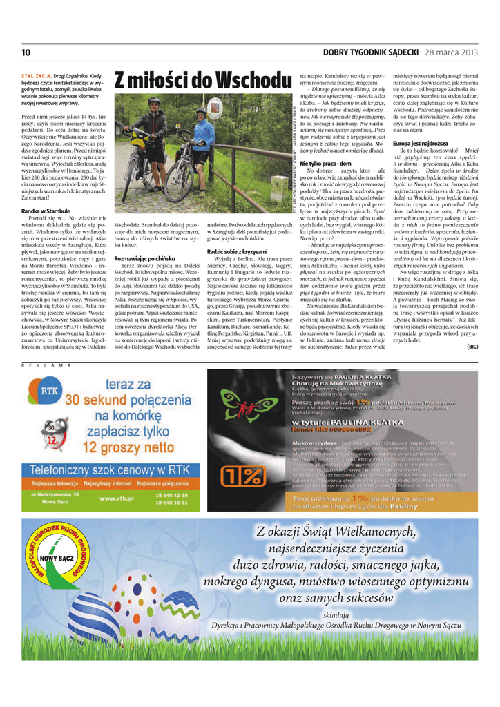 10 DOBRY TYGODNIK SĄDECKI 28 marca 2013 Z miłości do Wschodu FOT. ARCHIWUM PRYWATNE JOANNY I JAKUBA KANDULSKICH S T Y L Ż YC I A . Drogi Czytelniku. Kiedy będziesz czytał ten tekst siedząc w wygodnym fotelu, pomyśl, że Aśka i Kuba właśnie pokonują pierwsze kilometry swojej rowerowej wyprawy. Przed nimi jeszcze jakieś 14 tys. km jazdy, czyli osiem miesięcy kręcenia pedałami. Do celu dotrą na święta. Oczywiście nie Wielkanocne, ale Bożego Narodzenia. Jeśli wszystko pójdzie zgodnie z planem. Przed nimi pół świata drogi, więc terminy są tu sprawą umowną. Wyjechali z Berlina, metę wyznaczyli sobie w Honkongu. To jakieś 250 dni pedałowania, 250 dni życia na rowerowym siodełku w najróżniejszych warunkach klimatycznych. Zatem start! Randka w Stambule Poznali się w… No właśnie nie wiadomo dokładnie gdzie się poznali. Wiadomo tylko, że wydarzyło się to w przestrzeni wirtualnej. Aśka mieszkała wtedy w Szanghaju, Kuba pływał, jako nawigator na statku sejsmicznym, poszukując ropy i gazu na Morzu Barentsa. Wiadomo – internet może więcej. Żeby było jeszcze romantyczniej, to pierwszą randkę wyznaczyli sobie w Stambule. To była trochę randka w ciemno, bo tam się zobaczyli po raz pierwszy. Wcześniej spotykali się tylko w sieci. Aśka nazywała się jeszcze wówczas Wojciechowska, w Nowym Sączu skończyła Liceum Społeczne SPLOT i była świeżo upieczoną absolwentką kulturoznawstwa na Uniwersytecie Jagiellońskim, specjalizującą się w Dalekim R E K L A M Wschodzie. Stambuł do dzisiaj pozostaje dla nich miejscem magicznym, bramą do różnych światów na styku kultur. na dobre. Po dwóch latach spędzonych w Szanghaju dziś potrafi się już posługiwać językiem chińskim. Rozmawiając po chińsku Wyjadą z Berlina. Ale trasa przez Niemcy, Czechy, Słowację, Węgry, Rumunię i Bułgarię to ledwie rozgrzewka do prawdziwej przygody. Najciekawsze zacznie się kilkanaście tygodni później, kiedy pojadą wzdłuż tureckiego wybrzeża Morza Czarnego, przez Gruzję, południowymi zboczami Kaukazu, nad Morzem Kaspijskim, przez Turkmenistan, Pustynię Karakum, Bucharę, Samarkandę, Kotlinę Fergańską, Kirgistan, Pamir… Uff. Mniej wprawni podróżnicy mogą się zmęczyć od samego śledzenia tej trasy Teraz znowu pojadą na Daleki Wschód. To ich wspólna miłość. Wcześniej robili już wypady z plecakami do Azji. Rowerami tak daleko pojadą po raz pierwszy. Najpierw zakochała się Aśka. Jeszcze ucząc się w Splocie, wyjechała na roczne stypendium do USA, gdzie poznani Azjaci skutecznie zainteresowali ją tym regionem świata. Potem ówczesna dyrektorka Alicja Derkowska zorganizowała szkolny wyjazd na konferencję do Japonii i wtedy miłość do Dalekiego Wschodu wybuchła Radzić sobie z kryzysami na mapie. Kandulscy też się w pewnym momencie poczują zmęczeni. – Dlatego postanowiliśmy, że się nigdzie nie spieszymy – mówią Aśka i Kuba. – Jak będziemy mieli kryzys, to zrobimy sobie dłuższy odpoczynek. Jak się naprawdę źle poczujemy, to są pociągi i autobusy. Nie nastawiamy się na wyczyn sportowy. Poza tym radzenie sobie z kryzysami jest jednym z celów tego wyjazdu. Możemy jechać nawet o miesiąc dłużej. Nie tylko praca–dom No dobrze – zapyta ktoś – ale po co właściwie zamykać dom na blisko rok i znosić niewygody rowerowej podróży? Tłuc się przez bezdroża, pustynie, obce miasta na krańcach świata, podjeżdżać z mozołem pod przełęcze w najwyższych górach. Spać w namiocie przy drodze, albo u obcych ludzi, bez wygód, własnego łóżka i pilota od telewizora w zasięgu ręki. No więc po co? – Mówiąc w największym uproszczeniu po to, żeby się wyrwać z rutynowego rytmu praca–dom – przekonują Aśka i Kuba. – Nawet kiedy Kuba pływał na statku po egzotycznych morzach, to jednak rutynowo spędzał tam codziennie wiele godzin przez pięć tygodni w biurze. Tyle, że biuro mieściło się na statku. Najważniejsze dla Kandulskich będzie jednak doświadczenie zmieniających się kultur w krajach, przez które będą przejeżdżać. Kiedy wsiada się do samolotu w Europie i wysiada np. w Pekinie, zmiana kulturowa dzieje się automatycznie. Jadąc przez wiele miesięcy rowerem będą mogli niemal namacalnie doświadczać, jak zmienia się świat – od bogatego Zachodu Europy, przez Stambuł na styku kultur, coraz dalej zagłębiając się w kulturę Wschodu. Podróżując samolotem nie da się tego doświadczyć. Żeby zobaczyć świat i poznać ludzi, trzeba zostać na ziemi. Europa jest najdroższa Ile to będzie kosztowało? – Mniej niż gdybyśmy ten czas spędzili w domu – przekonują Aśka i Kuba Kandulscy. – Dzień życia w drodze do Hongkongu będzie tańszy niż dzień życia w Nowym Sączu. Europa jest najdroższym miejscem do życia. Im dalej na Wschód, tym będzie taniej. Zresztą czego nam potrzeba? Cały dom zabieramy ze sobą. Przy rowerach mamy cztery sakwy, a każda z nich to jedno pomieszczenie w domu: kuchnia, spiżarnia, łazienka i sypialnia. Wytrzymałe polskie rowery firmy Unibike bez problemu to udźwigną, a nad kondycją pracowaliśmy od lat na dłuższych i krótszych rowerowych wypadach. No więc ruszajmy w drogę z Aśką i Kubą Kandulskimi. Śmieją się, że przecież to nic wielkiego, ich trasę przecierały już wcześniej wielbłądy. A poważnie – Roch Maciąg ze swoją towarzyszką przejechał podobną trasę i wszystko opisał w książce „Tysiąc filiżanek herbaty”. Już lektura tej książki obiecuje, że czeka ich wspaniała przygoda wśród przyjaznych ludzi. (BIC) A Z okazji Świąt Wielkanocnych, najserdeczniejsze życzenia dużo zdrowia, radości, smacznego jajka, mokrego dyngusa, mnóstwo wiosennego optymizmu oraz samych sukcesów składają Dyrekcja i Pracownicy Małopolskiego Ośrodka Ruchu Drogowego w Nowym Sączu