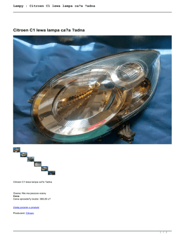 Lampy : Citroen C1 lewa lampa ca?a ?adna Citroen C1 lewa lampa ca?a ?adna Citroen C1 lewa lampa ca?a ?adna Ocena: Nie ma jeszcze oceny Cena Cena sprzeda?y brutto: 380,00 z? Zadaj pytanie o produkt Producent: Citroen 1 / 2 Lampy : Citroen C1 lewa lampa ca?a ?adna Szczegó?y produktu MODEL:Citroen 1 NR MAGAZYNOWY:B2-507 OPIS:Citroen C1 lewa lampa ca?a ?adna CENA:150 SZTUK: 1 DOST?PNO??: TAK Po zakupie Twoja lampa zostanie wys?ana jeszcze tego samego dnia. Ka?da paczka jest dobrze zabezpieczona i nadana PRIORYTETEM, dostarczana za po?rednictwem Poczty Polskiej. Do wysy?ki do??czamy paragon lub na ?yczenie rachunek. Mo?liwy równie? odbiór osobisty. Paczka pocztowa priorytetowa- 25 z? Przesy?ka pobraniowa- 35 z? Magazyn jest stale zaopatrywany w nowe reflektory, dlatego je?li nie wida? na stanie danej lampy- warto zadzwoni? do doradcy i zapyta? o to, co Pa?stwa interesuje. 513-531-967 Jako konsumentowi przys?uguje Ci prawo do zwrotu towaru w ci?gu 10 dni. Nie musisz podawa? przyczyny. Gwarantujemy zwrot pieni?dzy. Jedynych koszty, których nie zwracamy to koszty wysy?ki. Wykonane zdj?cia nie podlegaj? ?adnej obróbce, co przek?ada si? na 100% pewno?ci, ?e zakupiony towar jest zgodny z towarem przedstawionym w ofercie. ZAPRASZAMY 2 / 2 Powered by TCPDF (www.tcpdf.org)
