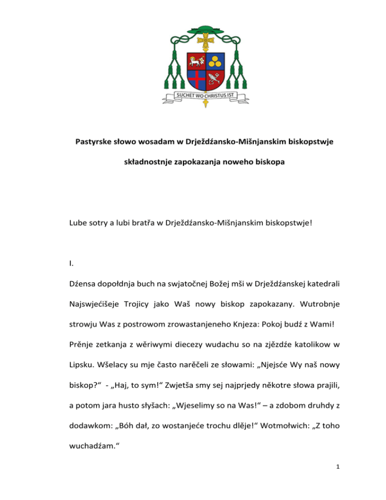 Pastyrske słowo wosadam w Drježdźansko‐Mišnjanskim biskopstwje składnostnje zapokazanja noweho biskopa Lube sotry a lubi bratřa w Drježdźansko‐Mišnjanskim biskopstwje! I. Dźensa dopołdnja buch na swjatočnej Božej mši w Drježdźanskej katedrali Najswjećišeje Trojicy jako Waš nowy biskop zapokazany. Wutrobnje strowju Was z postrowom zrowastanjeneho Knjeza: Pokoj budź z Wami! Prěnje zetkanja z wěriwymi diecezy wudachu so na zjězdźe katolikow w Lipsku. Wšelacy su mje často narěčeli ze słowami: „Njejsće Wy naš nowy biskop?“ ‐ „Haj, to sym!“ Zwjetša smy sej najprjedy někotre słowa prajili, a potom jara husto słyšach: „Wjeselimy so na Was!“ – a zdobom druhdy z dodawkom: „Bóh dał, zo wostanjeće trochu dlěje!“ Wotmołwich: „Z toho wuchadźam.“ 1 Lube sotry a lubi bratřa! Wot něšto tydźenjow steji na mojim personalnym wupokazu adresa Hrodowa 24, 01067 Drježdźany. Chcu tule w biskopstwje nowe korjenje ćěrić dać a pola Was swoje doma namakać. Mi napřećo zwuraznjenemu „wjeselimy so na Was“ chcu dźensa z cyłeje wutroby wotmołwić: „Wjeselu so tež na Was!“ II. Zawěsće mnozy z Was katedralu, Drježdźansku Dwórsku cyrkej, znaja a su ju hižo raz wopytali. Štóž do njeje zastupi, je hnydom wot wulkeho wołtarneho wobraza zajaty, kotryž je Raphael Mengs wokoło 1752 za tutu cyrkej stworił. Chrystus, skřižowany a zrowastanjeny, spěje do njebjes. To je wobraz donjebjesspěća. Na swjedźenju Božeho spěća słyšimy w čitanju wujimk z Lista japoštoła Pawoła Kolosanam: „Jelizo sće z Chrystusom stanyli, pytajće, štož je horjeka, hdźež sedźi Chrystus při Božej prawicy. Štož je horjeka, mějće na mysli, nic to, štož je na zemi.“ Je kaž dobre wjedźenje, zo sym k swojej biskopskej swjećiznje před 15 lětami z tutych bibliskich hronow swoje biskopske hesło wupytał. Wołtarny wobraz Dwórskeje cyrkwje je nam pokazuje. „Pytajće, hdźe je Chrystus!“ „Štož je horjeka, mějće na mysli, nic to, štož je na zemi.“ To njebjeske je Chrystus. Jězus Chrystus, Boži Syn, za nas sčłowječeny, skřižowany, wumrěł a pohrjebany, potom z mortwych stanył, wón wróći so domoj k Wótcej. Přez Ducha, kotrehož je nade wšěm 2 swětom wulinył a njepřestajnje wuliwa, je wón mjez nami. Wo tutoho Jězu Chrysta dźe, wo njeho dźe nam křesćanam, wón je srjedźišćo našeje wěry a našeho žiwjenja. Tež tole zda so mi kaž wulkotne wjedźenje: Biskop Joachim wuzwoli sej za swoje biskopske hesło „Jězus w srjedźišću“; arcybiskop Heiner pak „Wjeselće so wšón čas, Knjez je blisko!“ A ja mam hesło „Pytajće, hdźe je Chrystus!“ Wo njeho dźe. III. Snadź so něchtó praša: „Čehodla měł Chrystusa pytać, što da z toho mam?“ Što z toho mam, je hižo z prěnim hronom čitanja prajene: „Z Chrystusom sće stanyli.“ Štóž je přez křćeńcu z Chrystusom zwjazany, je z nim nowe žiwjenja započał, žiwjenje, kotrež w smjerći njezańdźe. Hišće wjace: Křćeny ma žiwjenje we sebi, kotrež nam dźensa, nětkole, móc a zmužitosć spožča, so wužadanjam žiwjenja stajić. Štóž Jězusa pyta, nańdźe orientaciju za swoje žiwjenje. Štóž Jězusa pyta, nańdźe jasnosć mjez mnohimi poskitkami tutoho swěta za zmysłapołnym žiwjenjom. Štóž Jězusa pyta, nańdźe w nim móc lubosće, kotraž pomha, wšě pačenja přewinyć. Štóž Jězusa pyta, nańdźe w nim tajki pokoj, kotryž swět dać a žadyn čłowjek činić njemóže. Z bamžom Benediktom prajene, „Štóž so na Jězusa nastaji, ničo njezhubi, ale dobudźe.“ – tón dobudźe žiwjensku 3 kwalitu. Kelko křesćankow a křesćanow w našim biskopstwje móže wobswědčić: „To so wudani, Jězusa pytać a so na njeho spušćeć.“ IV. Hdźe tohole Jězusa Chrystusa nańdźemy? Wobraz Božeho spěća w Dwórskej cyrkwi podawa prěnju wotmołwu. Cyrkej je městno Zrowastanjeneho, a to tale naša cyrkej – dźensa –, kotraž dyrbi so stajnje přez ewangelij wobnowić a wožiwić. Tale cyrkej, kotraž wot reformacije dla pačenja ćerpi, tale cyrkej, kotraž móhła druhdy wěryhódnišo lubosć a smilnosć wobswědčeć, tale cyrkej je městno zrowastanjeneho Knjeza. A w tutej cyrkwi je Knjez prezentny w swojim słowje, kotrež so wozjewja a po kotrymž su ludźo žiwi; wón je prezentny w znamjenjomaj chlěba a wina; wón je prezentny w słužbnych zastojnstwach našeje cyrkwje. Wón je přitomny, hdyž so w jeho mjenje zhromadźimy. Wy, lube sotry a lubi bratřa, sće so w zašłych lětach z dopóznawanskim procesom na puć nastajili. Dźe wo to, za pućemi pytać, zo bychu po móžnosći mnozy ludźo w Sakskej a wuchodnej Durinskej Chrystusa zeznali a jeho zetkali. Z tutym dopóznawanskim procesom budu so nětko tež ja bliže zaběrać a chcu – tak spěšnje kaž móžno – zwjazki zhromadneje zamołwitosće wopytać a zeznać. Póńdu ze zakładnym přeswědčenjom do dopóznawanskeho procesa, zo je cyrkej městno Zrowastanjeneho, fara je 4 městno Zrowastanjeneho, wosada, kotraž so zhromadźuje, je městno Zrowastanjeneho. A potom, lube sotry a lubi bratřa, stanu so tež w tutym dopóznawanskim procesu załožene zwjazki zhromadneje zamołwitosće městna Zrowastanjeneho. Při wšěch prašenjach a při wšěm pytanju, z rozestajenjemi, wujasnjenjemi a rozsudami, kotrež su za nowu strukturu w dušepastyrstwje trěbne, a prócujo so wo to, być žiwa a přeprošowaca cyrkej, mamy předewšěm wzajomnje zamołwitosć za to, zo dóstanje Zrowastanjeny mjez nami městno. Kak móžeš to nazhonić? Wot abta we wulkej rjadniskej kongregaciji sym zhonił, zo je so na wizitacijach we wšelakich klóštrach komunity rady za dwěmaj naležnosćomaj prašał a přez to do rozmołwy přišoł. Prěnje prašenje: „Sće wy w pokoju Zrowastanjeneho?“ Druhe prašenje: „Maće duchowne powołanja?“ Lube sotry a lubi bratřa, přeprošuju Was, zo so tutymaj prašenjomaj 