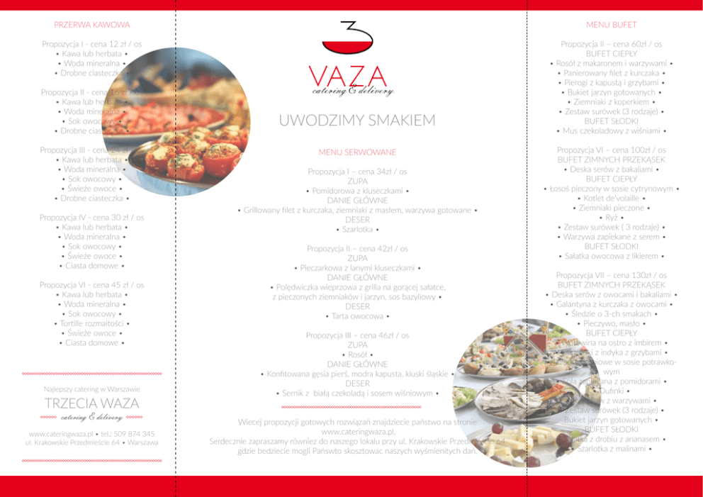 PRZERWA KAWOWA MENU BUFET Propozycja I - cena 12 zł / os • Kawa lub herbata • • Woda mineralna • • Drobne ciasteczka • Propozycja II – cena 60zł / os BUFET CIEPŁY • Rosół z makaronem i warzywami • • Panierowany filet z kurczaka • • Pierogi z kapustą i grzybami • • Bukiet jarzyn gotowanych • • Ziemniaki z koperkiem • • Zestaw surówek (3 rodzaje) • BUFET SŁODKI • Mus czekoladowy z wiśniami • Propozycja II - cena 16 zł / os • Kawa lub herbata • • Woda mineralna • • Sok owocowy • • Drobne ciasteczka • Propozycja III - cena 24 zł / os • Kawa lub herbata • • Woda mineralna • • Sok owocowy • • Świeże owoce • • Drobne ciasteczka • Propozycja IV - cena 30 zł / os • Kawa lub herbata • • Woda mineralna • • Sok owocowy • • Świeże owoce • • Ciasta domowe • Propozycja VI - cena 45 zł / os • Kawa lub herbata • • Woda mineralna • • Sok owocowy • • Tortille rozmaitości • • Świeże owoce • • Ciasta domowe • Najlepszy catering w Warszawie TRZECIA WAZA catering & delivery www.cateringwaza.pl • tel.: 509 874 345 ul. Krakowskie Przedmieście 64 • Warszawa UWODZIMY SMAKIEM MENU SERWOWANE Propozycja I – cena 34zł / os ZUPA • Pomidorowa z kluseczkami • DANIE GŁÓWNE • Grillowany filet z kurczaka, ziemniaki z masłem, warzywa gotowane • DESER • Szarlotka • Propozycja II – cena 42zł / os ZUPA • Pieczarkowa z lanymi kluseczkami • DANIE GŁÓWNE • Polędwiczka wieprzowa z grilla na gorącej sałatce, z pieczonych ziemniaków i jarzyn, sos bazyliowy • DESER • Tarta owocowa • Propozycja III – cena 46zł / os ZUPA • Rosół • DANIE GŁÓWNE • Konfitowana gęsia pierś, modra kapusta, kluski śląskie • DESER • Sernik z białą czekoladą i sosem wiśniowym • Wiecej propozycji gotowych rozwiązań znajdziecie państwo na stronie www.cateringwaza.pl. Serdecznie zapraszamy równiez do naszego lokalu przy ul. Krakowskie Przedmieście 64 gdzie bedziecie mogli Pańswto skosztowac naszych wyśmienitych dań. Propozycja VI – cena 100zł / os BUFET ZIMNYCH PRZEKĄSEK • Deska serów z bakaliami • BUFET CIEPŁY • Łosoś pieczony w sosie cytrynowym • • Kotlet de’volaille • • Ziemniaki pieczone • • Ryż • • Zestaw surówek ( 3 rodzaje) • • Warzywa zapiekane z serem • BUFET SŁODKI • Sałatka owocowa z likierem • Propozycja VII – cena 130zł / os BUFET ZIMNYCH PRZEKĄSEK • Deska serów z owocami i bakaliami • • Galantyna z kurczaka z owocami • • Śledzie o 3-ch smakach • • Pieczywo, masło • BUFET CIEPŁY • Wołowina na ostro z imbirem • • Eskalopki z indyka z grzybami • • Pulpety drobiowe w sosie potrawkowym • Sola zapiekana z pomidorami • • Dufinki • • Ryż pilaw z warzywami • • Zestaw surówek (3 rodzaje) • Bukiet jarzyn gotowanych • BUFET SŁODKI • Sałatka z drobiu z ananasem • • Szarlotka z malinami • ZORGANIZUJEMY profesjonalny catering posiłki dla firm, instytucji oraz klientów indywidualnych IMPREZY RODZINNE I TOWARZYSKIE Przygotowując spotkania rodzinne i towarzyskie nie zapominamy o tym jak ważne jest odpowiednie podejście do gości. Dlatego powierzając nam przygotowanie spotkania mogą być Państwo spokojni, że oferta którą zaproponujemy będzie dostosowana do indywidualnych potrzeb i specyfiki imprezy. Oferta Trzeciej Wazy to nie tylko bogate menu, ale również wiele sposobów na ich podanie, czym potrafimy pozytywnie zaskakiwać. Zapewniamy obsługę cateringową dla całego szeregu uroczystości rodzinnych, a w szczególności: • przyjęć chrzcielnych, • przyjęć komunijnych • przyjęć urodzinowych i imieninowych zarówno dla dzieci jak i dorosłych • poczęstunków po pogrzebie, • innych w zależności od potrzeb klienta. PRZYJĘCIA WESELNE Wesele to jedyny taki dzień w życiu dlatego rozumiemy, że chwila ta wymaga wyjątkowego przygotowania. Kuchnia Trzeciej Wazy to połączenie polskich smaków oraz różnych ciekawych dodatków dlatego w wyjątkowy sposób podkreśli charakter każdego przyjęcia. Nasze menu dobieramy do indywidualnych potrzeb klienta. Zdajemy sobie sprawę z tego, że w tym wyjątkowym dniu każda para chce być przekonana, że wszystko przebiegnie zgodnie z planem a przyjęcie na długo pozostanie w pamięci gości dlatego zapraszamy do kontaktu z naszym menadżerem, który pomoże w dobrze oryginalnej i w pełni dopasowanej do Państwa potrzeb oferty. Poza cateringiem podczas przyjęć weselnych w swojej ofercie posiadamy organizacje przyjęcia weselnego w salach i ogrodach Domu Polonii. Najlepszy catering w Warszawie TRZECIA WAZA catering & delivery www.cateringwaza.pl • tel.: 509 874 345 ul. Krakowskie Przedmieście 64 • Warszawa SPOTKANIA FIRMOWE Każde biznesowe spotkanie czy szkolenie wymaga starannego przygotowania dlatego w ofercie Trzeciej Wazy znajdą państwo szeroką propozycje cateringu, przerw kawowych oraz lunch przeznaczonych na tego typu imprezy. Dodatkowo specjalizujemy się w organizacji spotkań firmowych. Sami kiedyś pracowaliśmy w korporacjach stąd doświadczenie zawodowe w połączeniu z znakomita kuchnią gwarantują udany wieczór. 100% dobrego smaku 200% satysfakcji