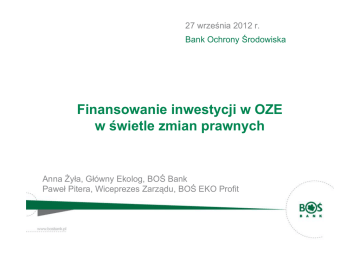 27 września 2012 r. Bank Ochrony Środowiska Finansowanie inwestycji w OZE w świetle zmian prawnych Anna Żyła, Główny Ekolog, BOŚ Bank Paweł Pitera, Wiceprezes Zarządu, BOŚ EKO Profit Projekt ustawy o OZE w świetle procesów inwestycyjnych Kluczowe fakty (1/2) Pierwszy projekt ustawy spowodował zamrożenie lub spowolnienie wielu procesów inwestycyjnych z powodu zawieszenia finansowania przez większość banków – spadek cen projektów w stanie deweloperskim i gotowych obiektów. Zmiany w projekcie ustawy spowodowały ożywienie na rynku od połowy br. roku i powrót na szybką ścieżkę rozwoju, głównie dzięki projektom wiatrowym. Nowe, korzystne zapisy współczynników korygujących dla fotowoltaiki spowodowały masowe zainteresowanie nową dziedziną OZE przez inwestorów, producentów, dystrybutorów i kooperantów. Kluczowe fakty (2/2) Otwarcie furtki dla rozwoju rynku prosumentów może spowodować, iż po raz pierwszy beneficjentem energetyki odnawialnej może stać się szeroki krąg inwestorów. Podstawowe ryzyka związane z procesem legislacyjnym: trzymanie/zmiana już przyjętych parametrów dla poszczególnych OZE brak wiedzy na temat daty wejścia w życie ustawy Finansowanie inwestycji Finansowanie inwestycji – doświadczenie BOŚ Bank jest jedynym spośród około 50 banków komercyjnych w Polsce, którego misją jest finansowa obsługa przedsięwzięć służących ochronie środowiska Nasi klienci to samorządy, przedsiębiorcy, osoby prywatne W latach 1991 – 2011 BOŚ Bank udzielił kredytów proekologicznych w łącznej kwocie przekraczającej 10 mld zł Łączna wartość inwestycji proekologicznych powstałych w okresie 1991 –2011 przy udziale kredytów BOŚ Banku wynosi 37 mld zł 6 Efekty ekologiczne zrealizowanych zadań (w okresie 1991r. – 2011r.) Redukcja emisji zanieczyszczeń: Pył 138 tys. Mg/a Dwutlenek siarki 476 tys. Mg/a Tlenki azotu 43 tys. Mg/a Dwutlenek węgla 1 560 tys. Mg/a Przepustowość oczyszczalni ścieków 2,6 mln m3/d Długość sieci kanalizacyjnej 8,4 tys. km Unieszkodliwiane odpady i odzyskane surowce wtórne 6,3 mln Mg/a Produkcja en. w OZE i oszczędność en. elektrycznej 629 GWh/a Finansowanie OZE przez BOŚ S.A. (1991 – 2011) Liczba [szt.] Kwota [tys. zł] Elektrownie wiatrowe 78 852 280 Kotły opalane biomasą 856 134 578 Kolektory słoneczne 4 525 106 011 Pompy ciepła 1 039 77 506 Produkcja biopaliw 21 53 278 Biogaz 10 37 495 Małe elektrownie wodne 73 35 757 Inne 5 7 116 6 607 1 304 022 Łącznie 8 Instrumenty bankowe dla ekologii Kredyty preferencyjne i montaże finansowe w ramach współpracy z donatorami środków: kredyty ze środków donatorów kredyty ze środków Banku z dopłatami do odsetek lub kapitału kredyty ze środków łączonych Finansowanie inwestycji na warunkach wynikających z zasad Funduszu Kredyty komercyjne na przedsięwzięcia współfinansowane środkami UE we współpracy z zagranicznymi instytucjami finansowymi standardowe kredyty inwestycyjne Inne instrumenty finansowe Obligacje komunalne Wykup wierzytelności Gwarancje bankowe 9 Kredyty proekologiczne Kredyty preferencyjne – system finansowania ochrony środowiska Kredyty udzielane w ramach współpracy z NFOŚiGW oraz WFOŚiGW Kredyty ze środków BOŚ S.A. z dopłatami do kapitału lub odsetek Kredyty ze środków donatorów Kredyty ze środków łączonych ! Preferencje po stronie cenowej – obniżone oprocentowanie kredytu w stosunku do standardowej oferty banku Preferencje po stronie nakładów na inwestycję – możliwość uzyskania dotacji ze środków Funduszu 11 Kredyty we współpracy z instytucjami zagranicznymi KfW Bankengruppe – Kredyt z Klimatem Program Modernizacji Kotłów, dla przedsiębiorstw komunalnych, przedsiębiorstw (także działających w formie spółdzielni) Program Efektywności Energetycznej w Budynkach, dla samorządów, spółdzielni i wspólnot mieszkaniowych, przedsiębiorstw (także działających w formie spółdzielni), przedsiębiorstw komunalnych Nordic Investment Bank (NIB) Finansowanie przedsięwzięć proekologicznych, dla małych, średnich i dużych przedsiębiorstw, spółdzielni mieszkaniowych, samorządów, przedsiębiorstw komunalnych ! Preferencje po stronie ceny i konstrukcji finansowania – obniżone marże i prowizje w stosunku do standardowej oferty banku, – możliwość skorzystania z 2-letniej karencji w spłacie kapitału. 12 Kredyty we współpracy z instytucjami zagranicznymi (c.d.) Europejski Bank Inwestycyjny (EIB) Finansowanie projektów inwestycyjnych m.in. w sektorze ochrony środowiska i racjonalnego użycia energii, dla samorządów i przedsiębiorstw komunalnych, Projekty inwestycyjne związane z rozwojem i utrzymaniem infrastruktury, dla mikro-, małych i średnich przedsiębiorstw Bank Rozwoju Rady Europy (CEB) Finansowanie przedsięwzięć infrastrukturalnych, w tym dotyczących ochrony środowiska, dla samorządów i przedsiębiorstw komunalnych ! Preferencje po stronie ceny i konstrukcji finansowania – obniżone marże i prowizje w stosunku do standardowej oferty banku, – możliwość skorzystania z 2-letniej karencji w spłacie kapitału – możliwość sfinansowania do 100% inwestycji przy połączeniu środków EIB i CEB 13 Kredyt z Dobrą Energią Przedmiot kredytowania: odnawialne źródła energii o mocy powyżej 200 kW (dla farm wiatrowych 500 kW) Instalacje biogazowni Farmy wiatrowe Instalacje energetycznego wykorzystania biomasy Elektrownie wodne inne inwestycje w OZE oraz pokrycie zobowiązań podatkowych z tytułu podatku VAT związanego z Projektem, sfinansowanie zapotrzebowania na kapitał obrotowy Projektu 14 Kredyt z Dobrą Energią Kwota kredytu: do wysokości 80% kosztu netto inwestycji. W przypadku gdy jednym ze źródeł finansowania Projektu są środki dotacji UE, możliwe jest sfinansowanie kredytem do 90% kosztów netto inwestycji, Okres kredytowania: wynikający z z pozytywnie zweryfikowanych przez Bank założeń 