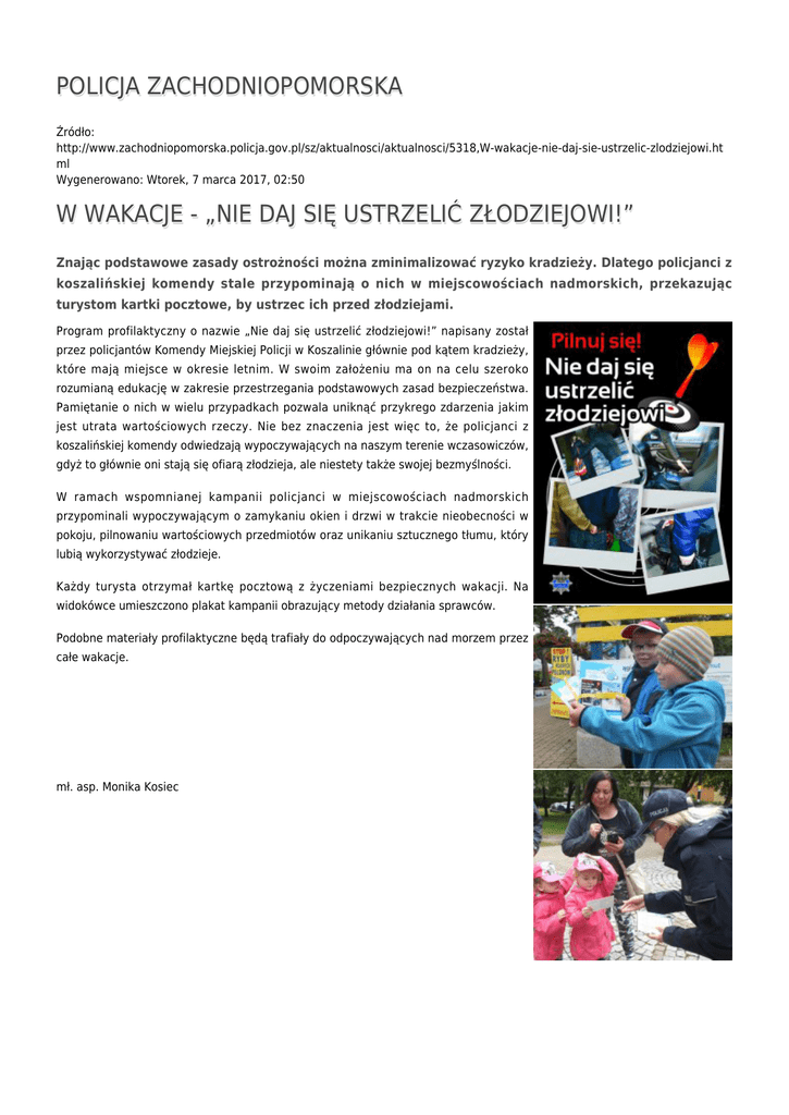 POLICJA ZACHODNIOPOMORSKA Źródło: http://www.zachodniopomorska.policja.gov.pl/sz/aktualnosci/aktualnosci/5318,W-wakacje-nie-daj-sie-ustrzelic-zlodziejowi.ht ml Wygenerowano: Wtorek, 7 marca 2017, 02:50 W WAKACJE - „NIE DAJ SIĘ USTRZELIĆ ZŁODZIEJOWI!” Znając podstawowe zasady ostrożności można zminimalizować ryzyko kradzieży. Dlatego policjanci z koszalińskiej komendy stale przypominają o nich w miejscowościach nadmorskich, przekazując turystom kartki pocztowe, by ustrzec ich przed złodziejami. Program profilaktyczny o nazwie „Nie daj się ustrzelić złodziejowi!” napisany został przez policjantów Komendy Miejskiej Policji w Koszalinie głównie pod kątem kradzieży, które mają miejsce w okresie letnim. W swoim założeniu ma on na celu szeroko rozumianą edukację w zakresie przestrzegania podstawowych zasad bezpieczeństwa. Pamiętanie o nich w wielu przypadkach pozwala uniknąć przykrego zdarzenia jakim jest utrata wartościowych rzeczy. Nie bez znaczenia jest więc to, że policjanci z koszalińskiej komendy odwiedzają wypoczywających na naszym terenie wczasowiczów, gdyż to głównie oni stają się ofiarą złodzieja, ale niestety także swojej bezmyślności. W ramach wspomnianej kampanii policjanci w miejscowościach nadmorskich przypominali wypoczywającym o zamykaniu okien i drzwi w trakcie nieobecności w pokoju, pilnowaniu wartościowych przedmiotów oraz unikaniu sztucznego tłumu, który lubią wykorzystywać złodzieje. Każdy turysta otrzymał kartkę pocztową z życzeniami bezpiecznych wakacji. Na widokówce umieszczono plakat kampanii obrazujący metody działania sprawców. Podobne materiały profilaktyczne będą trafiały do odpoczywających nad morzem przez całe wakacje. mł. asp. Monika Kosiec Ocena: 5/5 (1) Tweetnij