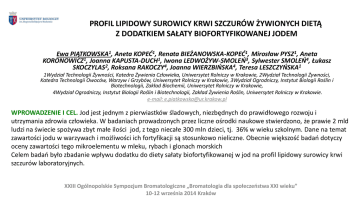 PROFIL LIPIDOWY SUROWICY KRWI SZCZURÓW ŻYWIONYCH DIETĄ Z DODATKIEM SAŁATY BIOFORTYFIKOWANEJ JODEM Ewa PIĄTKOWSKA1, Aneta KOPEĆ1, Renata BIEŻANOWSKA-KOPEĆ1, Mirosław PYSZ1, Aneta KORONOWICZ1, Joanna KAPUSTA-DUCH1, Iwona LEDWOŻYW-SMOLEŃ3, Sylwester SMOLEŃ4, Łukasz SKOCZYLAS2, Roksana RAKOCZY4, Joanna WIERZBIŃSKA4, Teresa LESZCZYŃSKA1 1Wydział Technologii Żywności, Katedra Żywienia Człowieka, Uniwersytet Rolniczy w Krakowie, 2Wydział Technologii Żywności, Katedra Technologii Owoców, Warzyw i Grzybów, Uniwersytet Rolniczy w Krakowie, 3Wydział Ogrodniczy, Instytut Biologii Roślin i Biotechnologii, Zakład Biochemii, Uniwersytet Rolniczy w Krakowie, 4Wydział Ogrodniczy, Instytut Biologii Roślin i Biotechnologii, Zakład Żywienia Roślin, Uniwersytet Rolniczy w Krakowie. e-mail: [email protected] WPROWADZENIE I CEL. Jod jest jednym z pierwiastków śladowych, niezbędnych do prawidłowego rozwoju i utrzymania zdrowia człowieka. W badaniach prowadzonych przez liczne ośrodki naukowe stwierdzono, że prawie 2 mld ludzi na świecie spożywa zbyt małe ilości jod, z tego niecałe 300 mln dzieci, tj. 36% w wieku szkolnym. Dane na temat zawartości jodu w warzywach i możliwości ich fortyfikacji są stosunkowo nieliczne. Obecnie większość badań dotyczy oceny zawartości tego mikroelementu w mleku, rybach i glonach morskich Celem badań było zbadanie wpływu dodatku do diety sałaty biofortyfikowanej w jod na profil lipidowy surowicy krwi szczurów laboratoryjnych. XXIII Ogólnopolskie Sympozjum Bromatologiczne „Bromatologia dla społeczeństwa XXI wieku” 10-12 września 2014 Kraków PROFIL LIPIDOWY SUROWICY KRWI SZCZURÓW ŻYWIONYCH DIETĄ Z DODATKIEM SAŁATY BIOFORTYFIKOWANEJ JODEM Ewa PIĄTKOWSKA, Aneta KOPEĆ, Renata BIEŻANOWSKA-KOPEĆ, Mirosław PYSZ, Aneta KORONOWICZ, Joanna KAPUSTA-DUCH, Iwona LEDWOŻYW-SMOLEŃ, Sylwester SMOLEŃ, Łukasz SKOCZYLAS, Roksana RAKOCZY, Joanna WIERZBIŃSKA, Teresa LESZCZYŃSKA MATERIAŁY I METODY. Doświadczenia żywieniowe przeprowadzono z udziałem rosnących albinotycznych szczurów szczepu Wistar płci męskiej (n=32) o średniej masie ciała 120 g. Po 7 dniowym okresie adaptacyjnym zwierzęta zostały podzielone na IV grupy doświadczalne: grupa I – kontrolna (AIN-93G), grupa II (AIN-93G z ilością jodu; w formie KJ; taką samą jak w biofortyfikowanej sałacie), grupa III (dieta AIN-93G bez jodu z dodatkiem biofortyfikowanej sałaty, w ilości takiej aby ilość jodu w sałacie była równa ilości jodu w diecie kontrolnej), grupa IV (dieta AIN-93G bez jodu z dodatkiem sałaty niebiofortyfikowanej w takiej ilości jak w grupie III). Podczas doświadczenia gryzonie przebywały w indywidualnych klatkach strawnościowych, w pomieszczeniu o stałej temperaturze i wilgotności, z zachowaniem 12 godzinnego cyklu dnia i nocy. Po 4 tygodniach doświadczenia zwierzęta zostały poddane narkozie i bezpośrednio z serca pobrano krew, którą odwirowano (10 min. przy obrotach 4000 g) w celu uzyskania surowicy. Oznaczenie cholesterolu całkowitego (TC), cholesterolu frakcji HDL i triacylogliceroli wykonano metodą enzymatyczno–kolorymetryczną wykorzystującą zestaw diagnostyczny Liquick Cor-CHOL firmy CORMAY. Poziom cholesterolu LDL obliczono z różnicy TC – HDL. Uzyskane wyniki poddano analizie statystycznej w programie komputerowym STATISTICA 10.0, przy użyciu jednoczynnikowej analizy wariancji (ANOVA). Istotność różnic pomiędzy średnimi wartościami zbadano za pomocą testu Duncana przy P0,05. XXIII Ogólnopolskie Sympozjum Bromatologiczne „Bromatologia dla społeczeństwa XXI wieku” 10-12 września 2014 Kraków PROFIL LIPIDOWY SUROWICY KRWI SZCZURÓW ŻYWIONYCH DIETĄ Z DODATKIEM SAŁATY BIOFORTYFIKOWANEJ JODEM Ewa PIĄTKOWSKA, Aneta KOPEĆ, Renata BIEŻANOWSKA-KOPEĆ, Mirosław PYSZ, Aneta KORONOWICZ, Joanna KAPUSTA-DUCH, Iwona LEDWOŻYW-SMOLEŃ, Sylwester SMOLEŃ, Łukasz SKOCZYLAS, Roksana RAKOCZY, Joanna WIERZBIŃSKA, Teresa LESZCZYŃSKA WYNIKI Badania zostały sfinansowane ze środków Narodowego Centrum Nauki przyznanych na podstawie decyzji numer DEC-2011/03/D/NZ9/05560 Parametr/ grupa Cholesterol ogółem [mmol/l] HDL [mmol/l] LDL+VLDL [mmol/l] TAG [mmol/l] Grupa I AIN-93 Grupa II AIN z ilością jodu taką sama jak w sałacie biofortyfikowanej Grupa III sałata biofortyfikowana Grupa IV sałata kontrolna 1.44±0.26a 1.49±0.30ab 1.64±0.24b 1.77±0.38b 0.92±0.28a 0.96±0.24a 1.10±0.13a 1.04±0.17a 0,43±0.17a 0.46±0.16a 0.73±0.29b 0.80±0.36b 0.65±0.14b 0.40±0.08a 0.48±0.09a 0.48±0.17a Wartości w wierszach oznaczone różnymi literami różnią się istotnie statystycznie przy p0.05. Poziom cholesterolu całkowitego i frakcji LDL zwiększył się istotnie statystycznie w surowicy krwi szczurów z grupy III i IV. Zawartość cholesterolu frakcji HDL nie różniła się istotnie statystycznie. Ilość triacylogliceroli istotnie wzrosła w surowicy krwi szczurów żywionych dietą AIN-93G z dodatkiem jodu w takiej samej ilości jaką wprowadzono do diety wraz z sałatą biofortyfikowaną, w porównaniu do surowicy krwi szczurów z pozostałych grup.