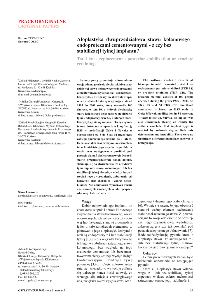 PRACE ORYGINALNE ORIGINAL PAPERS Bartosz TRYBULEC1 Edward GOLEC2,3 Aloplastyka dwuprzedziałowa stawu kolanowego endoprotezami cementowanymi - z czy bez stabilizacji tylnej implantu? Total knee replacement - posterior stabilization or cruciate retaining? 1 Zakład Fizjoterapii, Wydział Nauk o Zdrowiu, Uniwersytet Jagielloński Collegium Medium, ul. Medyczna 9, 30-688 Kraków. Kierownik Zakładu: (p.o.): dr n. med. Joanna Zyznawska 2 Klinika Chirurgii Urazowej i Ortopedii, 5 Wojskowy Szpital Kliniczny z Polikliniką SPZOZ, ul. Wrocławska 1-3, 30-901 Kraków. Kierownik Kliniki: dr hab. n.med. Edward Golec prof.nadzw. 3 Zakład Rehabilitacji w Ortopedii, Katedra Rehabilitacji Klinicznej, Wydział Rehabilitacji Ruchowej, Akademia Wychowania Fizycznego im. Bronisława Czecha, Aleja Jana Pawła II 78, 31-571 Kraków. Kierownik Zakładu: dr hab. n.med. Edward Golec prof. nadzw. Słowa kluczowe: aloplastyka stawu kolanowego, stabilizacja tylna Key words: total knee replacement, posterior stabilization Adres do korespondencji: Edward Golec, Klinika Chirurgii Urazowej i Ortopedii 5 Wojskowego Szpitala Klinicznego z Polikliniką SPZOZ, ul. Wrocławska 1-3, 30-901 Kraków Telefon kontaktowy (służbowy): 12, 63-08-202, 203 Fax: 12/ 632-53-01 e-mail: [email protected] OSTRY DYŻUR 2013 . tom 6 . numer 2 Autorzy pracy prezentują własne obserwacje odnoszące się do aloplastyki dwuprzedziałowej stawu kolanowego endoprotezami cementowanymi wykonanej z – lub bez stabilizacji tylnej. Cel pracy zrealizowali w oparciu o materiał kliniczny obejmujący lata od 1995 do 2009 roku, który stanowiło 100 chorych, w tym 50, u których aloplastykę stawu kolanowego wykonano ze stabilizacją tylną endoprotezy oraz 50, u których stabilizacji tylnej nie wykonano. Ocenę czynnościową dokonano w oparciu o klasyfikację HSS w modyfikacji Golca i Nowaka w okresie czasu od 5 do 8 lat od przebytego zabiegu operacyjnego średnio po 7 latach. Oceniano także czas przeżywalności implantu w kontekście jego aspetycznego obluzowania oraz występowania powikłań pod postacią złamań okołoprotezowych. Na podstawie przeprowadzonych badań autorzy skłaniają się do stwierdzenia, że o wyborze typu implantu stawu kolanowego z lub bez stabilizacji tylnej decyduje między innymi stopień jego zwyrodnienia, zaburzenia osi kończyny oraz charakter i zakres niestabilności. Nie odnotowali wyraźnych różnic analizowanych zmiennych w obu grupach włączonych do badania. The authors evaluate results of bicompartmental cemented total knee replacements posterior stabilised (TKR PS) or cruciate retaining (TKR CR). The research material consists of 100 people operated during the years 1995 – 2009, 50 TKR PS and 50 TKR CR. Functional assessment is based on HSS scale in Golec&Nowak modification in 5-8 (average 7) years follow up. Survival of implant was also considered. Basing on results the authors conclude that implant type is selected by arthrosis degree, limb axis deformation and instability. There were no significant differences in implant survival in both groups. Wstęp Dobór odpowiedniego implantu do charakteru, stopnia i obrazu klinicznego zwyrodnienia stawu kolanowego, wieku operowanych, ich aktywności zawodowej lub fizycznej, stanowi z pewnością jeden z najważniejszych elementów w planowaniu jego aloplastyki. Jednymi z nich są endoprotezy z i bez stabilizacji tylnej [1,2]. Rola więzadła krzyżowego tylnego w stabilizacji sztucznego stawu kolanowego, bez względu na jego osadzenie cementowe lub bezcementowe w macierzy kostnej, wydaje się być kontrowersyjna i budząca żywą polemikę [3,4,5]. Część autorów sugeruje, że więzadło to wywołuje cofanie się dalszego końca kości udowej, co wzmaga siłę mięśnia czworogłowego uda, zwiększa zakres zgięcia stawu oraz zapobiega tylnemu jego podwichnięciu [6]. Wydaje się zatem, że jego obecność stanowi ważny element zachowania stabilności sztucznego stawu. Z pewnością ma to swoje odniesienie do późniejszej jego czynnościowej wydolności, zakresu zgięcia czy też powikłań pod postacią aseptycznego obluzowania [7]. Rodzi także dyskusję i pytanie: która z aloplastyk stawu kolanowego tzn. z – lub bez stabilizacji tylnej stanowi korzystniejsze rozwiązanie operacyjne? Cel pracy Celem prezentowanych badań było udzielenie odpowiedzi na następujące pytania: 1. Która z aloplastyk stawu kolanowego, z – lub bez stabilizacji tylnej zapewnia większy zakres ruchomości sztucznego stawu, jego stabilność i 32 skutkuje w obserwacji odległej korzystniejszymi wynikami czynnościowymi? 2. Która z wymienionych aloplastyk stawu kolanowego endoprotezami cementowanymi, wykazuje dłuższą mechaniczną przeżywalność wkładki dystansowej implantu? 3. Która z wymienionych aloplastyk stawu kolanowego endoprotezami cementowanymi, w większym stopniu zagrożona jest powikłaniami pod postacią aseptycznego obluzowania implantu oraz złamań okołoprotezowych? 4. Czy chorzy poddani aloplastyce dwuprzedziałowej stawu kolanowego endoprotezami cementowanymi z – lub bez stabilizacji tylnej wymagają odrębnych programów rehabilitacji? Materiał kliniczny Cel pracy zrealizowano w oparciu o materiał kliniczny pochodzący z Kliniki Chirurgii Urazowej i Ortopedii 5 Wojskowego Szpitala Klinicznego z Polikliniką SPZOZ w Krakowie, a obejmujący lata od 1995 do 2009 roku. Stanowi go 100 chorych, którzy przebyli aloplastykę dwuprzedziałową stawu kolanowego endoprotezami cementowanymi. U 50 z nich zastosowano stabilizację tylną implantu, co stanowi 50% grupy badanej, a u pozostałych 50, czyli także u 50% stabilizacji tylnej nie zastosowano. W grupie chorych, którzy przebyli aloplastykę dwuprzedziałową stawu kolanowego endoprotezami cementowanymi ze stabilizacją tylną (Grupa I) było 27 kobiet, co stanowi 54% analizowanej grupy i 27% wszystkich chorych włączonych do badania oraz 23 mężczyzn, co daje 46% analizowanej grupy oraz 23% wszy
