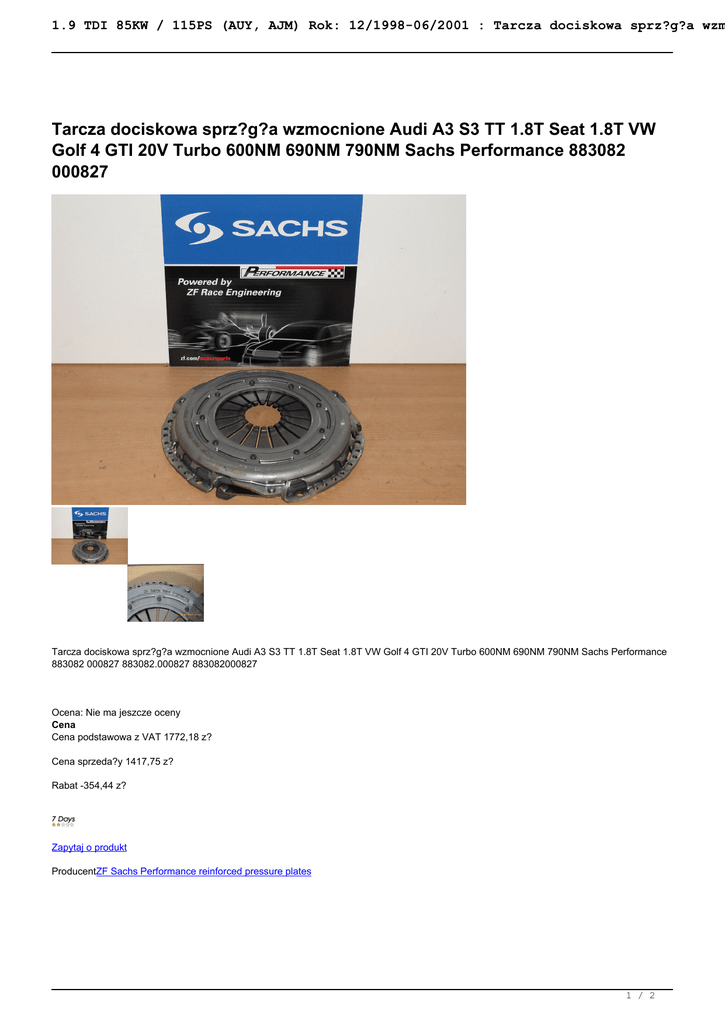 1.9 TDI 85KW / 115PS (AUY, AJM) Rok: 12/1998-06/2001 : Tarcza dociskowa sprz?g?a wzm Tarcza dociskowa sprz?g?a wzmocnione Audi A3 S3 TT 1.8T Seat 1.8T VW Golf 4 GTI 20V Turbo 600NM 690NM 790NM Sachs Performance 883082 000827 Tarcza dociskowa sprz?g?a wzmocnione Audi A3 S3 TT 1.8T Seat 1.8T VW Golf 4 GTI 20V Turbo 600NM 690NM 790NM Sachs Performance 883082 000827 883082.000827 883082000827 Ocena: Nie ma jeszcze oceny Cena Cena podstawowa z VAT 1772,18 z? Cena sprzeda?y 1417,75 z? Rabat -354,44 z? Zapytaj o produkt ProducentZF Sachs Performance reinforced pressure plates 1 / 2 1.9 TDI 85KW / 115PS (AUY, AJM) Rok: 12/1998-06/2001 : Tarcza dociskowa sprz?g?a wzm Opis Tarcza dociskowa sprz?g?a wzmocnione Audi A3 S3 TT 1.8T Seat 1.8T VW Golf 4 GTI 20V Turbo 600NM 690NM 790NM Sachs Performance 883082.000827 (dodatkowo wzmocnione p?yty nale?y wybra?) do 540 nm + / 400lb / ft + z organicznej tarczy sprz?g?a do 630 nm + / 465lb / ft + z 4PAD spieku (na etapie wzbogacania Extrem1 & 2, p?yty drukarskie s? wzmocnione przez nas) 2 / 2 Powered by TCPDF (www.tcpdf.org)