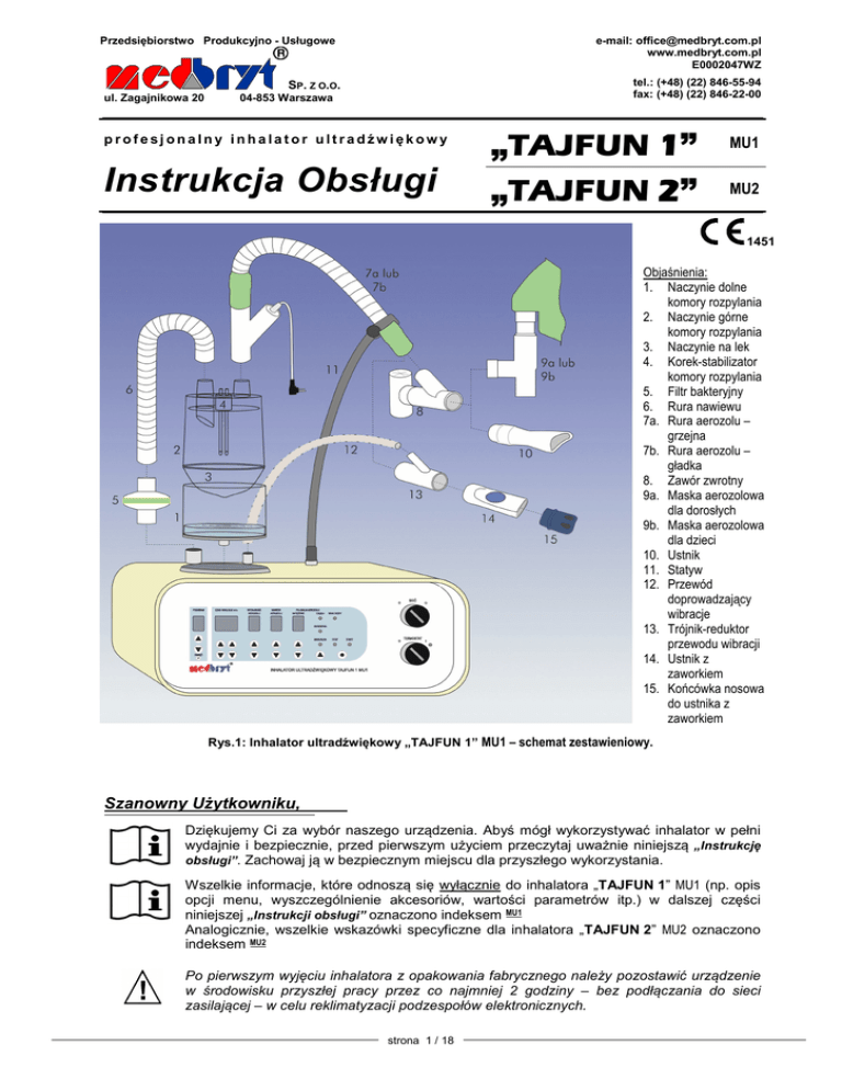 Przedsiębiorstwo Produkcyjno - Usługowe e-mail: [email protected] www.medbryt.com.pl E0002047WZ tel.: (+48) (22) 846-55-94 fax: (+48) (22) 846-22-00 SP. Z O.O. ul. Zagajnikowa 20 04-853 Warszawa profesjonalny inhalator ultradźwiękowy Instrukcja Obsługi „TAJFUN 1” „TAJFUN 2” MU1 MU2 1451 Objaśnienia: 1. Naczynie dolne komory rozpylania 2. Naczynie górne komory rozpylania 3. Naczynie na lek 4. Korek-stabilizator komory rozpylania 5. Filtr bakteryjny 6. Rura nawiewu 7a. Rura aerozolu – grzejna 7b. Rura aerozolu – gładka 8. Zawór zwrotny 9a. Maska aerozolowa dla dorosłych 9b. Maska aerozolowa dla dzieci 10. Ustnik 11. Statyw 12. Przewód doprowadzający wibracje 13. Trójnik-reduktor przewodu wibracji 14. Ustnik z zaworkiem 15. Końcówka nosowa do ustnika z zaworkiem Rys.1: Inhalator ultradźwiękowy „TAJFUN 1” MU1 – schemat zestawieniowy. Szanowny Użytkowniku, Dziękujemy Ci za wybór naszego urządzenia. Abyś mógł wykorzystywać inhalator w pełni wydajnie i bezpiecznie, przed pierwszym użyciem przeczytaj uważnie niniejszą „Instrukcję obsługi”. Zachowaj ją w bezpiecznym miejscu dla przyszłego wykorzystania. Wszelkie informacje, które odnoszą się wyłącznie do inhalatora „TAJFUN 1” MU1 (np. opis opcji menu, wyszczególnienie akcesoriów, wartości parametrów itp.) w dalszej części niniejszej „Instrukcji obsługi” oznaczono indeksem MU1 Analogicznie, wszelkie wskazówki specyficzne dla inhalatora „TAJFUN 2” MU2 oznaczono indeksem MU2 Po pierwszym wyjęciu inhalatora z opakowania fabrycznego należy pozostawić urządzenie w środowisku przyszłej pracy przez co najmniej 2 godziny – bez podłączania do sieci zasilającej – w celu reklimatyzacji podzespołów elektronicznych. strona 1 / 18 MU1/MU2 profesjonalny inhalator ultradźwiękowy - instrukcja obsługi - Spis treści I. Wyposażenie ............................................................................................................................ 2 II. Stosowane symbole ................................................................................................................. 3 III. Zalecenia dotyczące bezpieczeństwa .................................................................................... 4 IV. Przeznaczenie urządzenia ....................................................................................................... 7 V. Charakterystyka wyrobu i dane techniczne .......................................................................... 8 VI. Opis menu ................................................................................................................................ 9 VII. Ustawianie i zapamiętywanie programów ............................................................................. 11 VIII. Przeprowadzanie zabiegu inhalacyjnego .............................................................................. 13 IX. Bezpieczeństwo higieniczne i biologiczne ............................................................................ 15 X. Przechowywanie i konserwacja .............................................................................................. 16 XI. Serwis ........................................................................................................................................ 17 XII. Rozwiązywane problemów ...................................................................................................... 18 XIII. Dane producenta ...................................................................................................................... 18 I. Wyposażenie Wraz z urządzeniem, w opakowaniu fabrycznym inhalatora znajduje się przewód zasilający oraz: Elemety wielokrotnego użytku:* Naczynie dolne komory rozpylania (kompletne) Naczynie górne komory rozpylania Korek-stabilizator komory rozpylania Zawór zwrotny Rura aerozolu - grzejna Przewód doprowadzający wibracje MU1 Trójnik-reduktor przewodu wibracji MU1 Ustnik z zaworkiem MU1 Końcówka nosowa do ustnika z zaworkiem MU1 Elementy jednorazowego użytku:* Rura nawiewu Rura aerozolu - gładka Maska aerozolowa dla dorosłych Maska aerozolowa dla dzieci Ustnik Naczynie na lek Filtr bakteryjny Elemety wyposażenia dodatkowego: * ** Statyw Wciągacz do grzałki Filtr powietrza – wkłady zapasowe Gumka do oznaczania – kolor czerwony Gumka do oznaczania – kolor zielony Pozycja Rys. nr 1 Kod Zalecany okres eksploatacji** szt. 1 2 4 8 7a 12 13 14 15 1N016 1K050 1K034 1Z001 1R608 1R653 1T805 1H024 1H035 5 lat 5 lat 6 miesięcy 1 rok 2 lata 6 miesięcy 1 rok 6 miesięcy 6 miesięcy 1 1 1 1 2 1 1 2 2 Pozycja Rys. nr 1 Kod - szt. 6 7b 9a 9b 10 3 5 1R012 1R604 1M009 1M010 1U004 1N011 1F406 - 2 2 2 1 10 20 3 Pozycja Rys. nr 1 - - szt. 11 - 1W656 1F001 - - 1 1 3 5 5 Wymienione elementy są niezbędne do prawidłowego działania urządzenia. Ich zgodność z wymaganiami normy EN 13544-1 została potwierdzona przez niezależne jednostki badawcze. Przy założeniu około 20 zabiegów inhalacyjnych dziennie, jednak nie dłużej niż zaleca producent akcesoriów – należy zapoznać się z załączonymi ulotkami. Więcej informacji n/t wyposażenia inhalatora otrzymają Państwo pod numerem (+48)(22) 846-55-94 lub znajdą w internecie: www.medbryt.com.pl - serdecznie zapraszamy do odwiedzenia naszej witryny! strona 2 / 18 profesjonalny inhalator ultradźwiękowy - instrukcja obsługi - MU1/MU2 II. Stosowane symbole Przed pierwszym uruchomieniem inhalatora należy dokładnie zapoznać się z niniejszą „Instrukcją obsługi”. Zalecenia szczególnie istotne dla bezpieczeństwa użytkowania. Wykorzystywanie inhalatora niezgodnie z przeznaczeniem może spowodować jego awarię i/lub prowadzić do częściowej utraty zdrowia pacjenta! Prąd zmienny (AC). Napięcie niebezpieczne – podzespoły inhalatora zasilane są prądem zmiennym o napięciu 230V i częstotliwości 50Hz. Zabrania się otwierania obudowy przez personel nieupoważnion