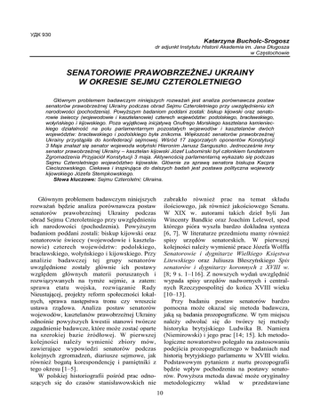 Історичний архів УДК 930 Katarzyna Bucholc-Srogosz dr adjunkt Instytutu Historii Akademia im. Jana Długosza w Częstochowie SENATOROWIE PRAWOBRZEŻNEJ UKRAINY W OKRESIE SEJMU CZTEROLETNIEGO Głównym problemem badawczym niniejszych rozważań jest analiza porównawcza postaw senatorów prawobrzeżnej Ukrainy podczas obrad Sejmu Czteroletniego przy uwzględnieniu ich narodowości (pochodzenia). Powyższym badaniom poddani zostali: biskup kijowski oraz senatorowie świeccy (wojewodowie i kasztelanowie) czterech województw: podolskiego, bracławskiego, wołyńskiego i kijowskiego. Poza wyjątkową inicjatywą Onufrego Morskiego kasztelana kamienieckiego działalność na polu parlamentarnym pozostałych wojewodów i kasztelanów dwóch województw: bracławskiego i podolskiego była znikoma. Większość senatorów prawobrzeżnej Ukrainy przystąpiła do konfederacji sejmowej. Wśród 17 zagorzałych oponentów Konstytucji 3 Maja znalazł się senator wojewoda wołyński Hieronim Janusz Sanguszko. Jednocześnie inny senator prawobrzeżnej Ukrainy – kasztelan kijowski Józef Lubomirski był członkiem fundatorem Zgromadzenia Przyjaciół Konstytucji 3 maja. Aktywnością parlamentarną wykazało się podczas Sejmu Czteroletniego województwo kijowskie. Głównie za sprawą senatora biskupa Kacpra Cieciszowskiego. Ciekawa i inspirująca do dalszych badań jest postawa polityczna wojewody kijowskiego Józefa Stempkowskiego. Słowa kluczowe: Sejmu Czteroletni; Ukrainа. Głównym problemem badawczym niniejszych rozważań będzie analiza porównawcza postaw senatorów prawobrzeżnej Ukrainy podczas obrad Sejmu Czteroletniego przy uwzględnieniu ich narodowości (pochodzenia). Powyższym badaniom poddani zostali: biskup kijowski oraz senatorowie świeccy (wojewodowie i kasztelanowie) czterech województw: podolskiego, bracławskiego, wołyńskiego i kijowskiego. Przy analizie badawczej tej grupy senatorów uwzględnione zostały głównie ich postawy względem głównych materii poruszanych i rozwiązywanych na tymże sejmie, a zatem: sprawa etatu wojska, rozwiązanie Rady Nieustającej, projekty reform społeczności lokalnych, sprawa następstwa tronu czy wreszcie ustawa rządowa. Analiza postaw senatorów wojewodów, kasztelanów prawobrzeżnej Ukrainy odnośnie powyższych kwestii stanowi twórcze zagadnienie badawcze, które może zostać oparte na szerokiej bazie źródłowej. W pierwszej kolejności należy wymienić zbiory mów, zawierające wypowiedzi senatorów podczas kolejnych zgromadzeń, diariusze sejmowe, jak również bogatą korespondencję i pamiętniki z tego okresu [1–5]. W polskiej historiografii pośród prac odnoszących się do czasów stanisławowskich nie zabrakło również prac na temat składu ilościowego, jak również jakościowego Senatu. W XIX w. autorami takich dzieł byli Jan Wincenty Bandkie oraz Joachim Lelewel, spod którego pióra wyszła bardzo dokładna synteza [6, 7]. W literaturze przedmiotu mamy również spisy urzędów senatorskich. W pierwszej kolejności należy wymienić prace Józefa Wolffa Senatorowie i dygnitarze Wielkiego Księstwa Litewskiego oraz Juliusza Błeszyńskiego Spis senatorów i dygnitarzy koronnych z XVIII w. [8; 9 s. 1–116]. Z nowszych wydań uwzględnić wypada spisy urzędów nadwornych i centralnych Rzeczypospolitej do końca XVIII wieku [10–13]. Przy badaniu postaw senatorów bardzo pomocna może okazać się metoda badawcza, jaką są badania prozopograficzne. W tym miejscu należy odwołać się do twórcy tej metody historyka brytyjskiego Ludwika B. Namiera (Niemirowski) i jego prac [14; 15]. Ich metodologiczne nowatorstwo polegało na zastosowaniu podejścia prozopograficznego w badaniach nad historią brytyjskiego parlamentu w XVIII wieku. Podstawowym pytaniem z nurtu prozopografii będzie wpływ pochodzenia na postawy senatorów. Powyższa metoda dawać może oryginalny metodologiczny wkład w przedstawiane 10 Випуск 16 badania. Ze względu na zakrojony zakres niniejszych rozważań analizie badawczej poddani zostali wybrani przedstawiciele z danej grupy senatorów, tj. wojewodów i kasztelanów prawobrzeżnej Ukrainy. Głównym kryterium wyboru było pochodzenie, ale również przy analizie badawczej brane mogą być pod uwagę kwestie zamożności i wykształcenia senatora. Poważne zmiany ilościowe zaszły w Senacie po unii realnej polsko-litewskiej z 1569 r. i związanej z nią inkorporacji ziem do Korony. Według wyliczeń Stanisława Kutrzeby w 1768 r. w izbie zasiadało 153 dostojników; po pierwszym rozbiorze w 1775 r. – 154 (13 biskupów, 35 wojewodów ze starostą żmudzkim, 90 kasztelanów i 16 ministrów), natomiast w 1790 r. stan senatorów wynosił 155 (121 senatorów koronnych i 34 senatorów litewskich; w tym 14 biskupów: 10 koronnych i 4 litewskich; 35 wojewodów: 24 koronnych i 11 litewskich; 90 kasztelanów: 79 koronnych i 11 litewskich; 16 ministrów: 8 koronnych i 8 litewskich) [16; s. 78]. Senat w czasach rządów króla Stanisława Augusta funkcjonował w ramach sejmów skonfederowanych, delegacyjnych oraz tzw. «wolnych». Zawiązywana konfederacja przed sejmem miała służyć jako zapora przed jednomyślnością, liberum veto. Sposób zastosowania konfederacji w czasach sejmów stanisławowskich znacznie został poszerzony. Stanisław Kutrzeba pisał o dwóch praktykach (...) Albo sejm – jak to dawniej się zdarzało – zbierał się w czasie, kiedy w kraju zawiązana była konfederacja generalna i z tej racji za skonfederowany był uważany, a więc jako decydujący większością głosów (…) Albo też – i to była już zupełna nowość – sam sejm się wiązał w konfederację; w taki sposób skonfederowanymi stały się sejmy z lat 1773– 1775, 1776 i 1778-1792 (…) [16 s. 167–168]. Biorąc pod uwagę, iż w 1773 r. najpierw powstała konfederacja Ponińskiego, to tylko w 1788 r. sejm zawiązał konfederację. W przypadku sejmów z lat 177
