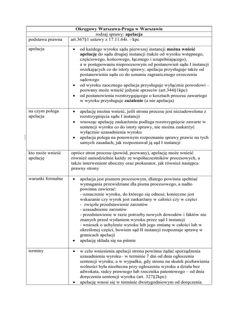 podstawa prawna apelacja Okręgowy Warszawa-Praga w Warszawie rodzaj sprawy: apelacja art.367§1 ustawy z 17.11.64r. - kpc na czym polega apelacja kto może wnieść apelację warunki formalne apelację można wnieść, jeśli strona procesu jest niezadowolona z rozstrzygnięcia sądu I instancji wnosząc apelację zaskarżeniu podlega rozstrzygnięcie zawarte w sentencji wyroku co do istoty sprawy, nie można zaskarżyć wyłącznie uzasadnienia wyroku apelacja polega na ponownym rozpoznaniu sprawy prawie na tych samych zasadach, jak rozpoznawał ją sąd I instancji oprócz stron procesu (powód, pozwany), apelację może wnieść również samodzielnie każdy ze współuczestników procesowych, a także interwenient uboczny oraz prokurator, jak również następca prawny strony terminy od każdego wyroku sądu pierwszej instancji można wnieść apelację do sądu drugiej instancji (także od wyroku wstępnego, częściowego, końcowego, łącznego i uzupełniającego), a w postępowaniu nieprocesowym od postanowień sądu I instancji orzekających co do istoty sprawy; apelacja przysługuje także od postanowienia sądu co do uznania zagranicznego orzeczenia sądowego od wyroku zaocznego apelacja przysługuje wyłącznie powodowi – pozwany może wnieść jedynie sprzeciw (art.344§1kpc) od postanowienia rozstrzygającego o kosztach procesu zawartego w wyroku przysługuje zażalenie (a nie apelacja) apelacja jest pismem procesowym, dlatego powinna spełniać wymagania przewidziane dla pisma procesowego, a nadto powinna zawierać: - oznaczenie wyroku, do którego się odnosi; konieczne jest wskazanie czy wyrok jest zaskarżany w całości czy w części - zwięzłe przedstawienie zarzutów - uzasadnienie zarzutów - przedstawienie w razie potrzeby nowych dowodów i faktów nie znanych przed wydaniem wyroku przez sąd I instancji - wniosek o uchylenie wyroku lub jego zmianę w całości lub w określonej części, bowiem sąd II instancji rozpoznaje sprawę w granicach apelacji apelację składa się na piśmie w celu wniesienia apelacji strona powinna żądać sporządzenia uzasadnienia wyroku– w terminie 7 dni od dnia ogłoszenia sentencji wyroku, a w wypadku, gdy strona na skutek pozbawienia wolności była nieobecna przy ogłoszeniu wyroku a działa bez adwokata, radcy prawnego lub rzecznika patentowego – od dnia doręczenia sentencji wyroku (art. 327§2kpc) apelację wnosi się w terminie dwutygodniowym od doręczenia przywrócenie terminu opłata odpowiedź na apelację cofnięcie apelacji dodatkowe informacje stronie skarżącej wyroku z uzasadnieniem strona, która nie żądała uzasadnienia wyroku w terminie tygodniowym od ogłoszenia sentencji, termin do wniesienia apelacji biegnie od dnia, w którym upłynął termin żądania uzasadnienia terminu do wniesienia apelacji sąd nie może skrócić ani przedłużyć, może natomiast go przywrócić w razie jego uchybienia we wniosku o przywrócenie terminu do wniesienia apelacji należy uprawdopodobnić, że uchybienie terminowi nastąpiło bez winy wnioskującego oraz dopełnić czynności, której nie dokonano w terminie wniosek należy złożyć w ciągu tygodnia od ustania przyczyny uchybienia terminowi; po upływie roku od daty uchybienia jego przywrócenie jest dopuszczalne tylko w wyjątkowych wypadkach zgłoszenie wniosku o przywrócenie terminu nie wstrzymuje postępowania ani wykonania orzeczenia, dlatego w kwestii wstrzymania należy zgłosić stosowny wniosek z wyjątkiem sytuacji wyraźnie uregulowanych apelacja podlega opłacie sądowej w takiej wysokości jak pozew – wyjątkiem są sprawy o stwierdzenie nabycia spadku (wniosek – opłata 50 zł, apelacja od postanowienia – 100 zł) strona przeciwna (nie wnosząca apelacji), w ciągu 2 tygodni od dnia doręczenia jej apelacji może (ale nie musi, jest to bowiem jej uprawnienie) złożyć odpowiedź na apelację wprost do sądu II instancji 2 tygodniowy termin jest terminem ustawowym i nie podlega przedłużeniu przez sąd nie jest również możliwe przywrócenie tego terminu, bowiem nie wniesienie odpowiedzi na apelację nie rodzi ujemnych skutków procesowych odpowiedź na apelację nie podlega opłacie sądowej odpowiedź na apelację jest pismem procesowym i musi spełniać wymogi pisma procesowego (m.in. oznaczenie sądu, dane stron, rodzaj pisma, podpis strony itd.) strona może cofnąć apelację, którą wniosła w terminie – powinna zrobić to na piśmie (bez ponoszenia dodatkowych opłat); w przypadku cofnięcia apelacji sąd II instancji umarza postępowanie apelacyjne i orzeka o kosztach, stosując odpowiednio przepisy o cofnięciu pozwu; apelację można wycofać i wnieść ponownie, pod warunkiem, że nie upłynął jeszcze termin do jej złożenia apelację adresuje się do sądu II instancji, ale wnosi się do sądu, który wydała zaskarżony wyrok (za jego pośrednictwem), można ją również wnieść bezpośrednio do sądu II instancji, co jednak przedłuży postępowanie apelację od wyroku sądu rejonowego rozpoznaje sąd okręgowy, a od wyroku sądu okręgowego jako pierwszej instancji - sąd apelacyjny rozpoznanie sprawy następuje w składzie trzech sędziów zawodowych , z wyjątkiem spraw rozpoznawanych w postępowaniu uproszczonym, w którym apelację rozpoznaje sąd w składzie jednego sędziego; postanowienia dotyczące postępowania dowodowego na posiedzeniu niejawnym wydaje sąd w składzie jednego sędziego