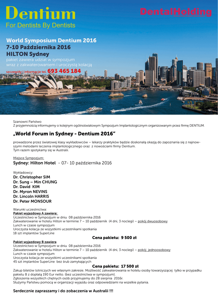 Szanowni Państwo Z przyjemnością informujemy o kolejnym ogólnoświatowym Sympozjum Implantologicznym organizowanym przez firmę DENTIUM. „World Forum in Sydney - Dentium 2016” prowadzone przez światowej klasy wykładowców – lekarzy praktyków będzie doskonałą okazją do zapoznania się z najnowszymi metodami leczenia implantologicznego oraz z nowościami firmy Dentium. Tym razem spotykamy się w Australii. Miejsce Sympozjum: Sydney: Hilton Hotel - 07- 10 października 2016 Wykładowcy: Dr. Christopher SIM Dr. Sung – Min CHUNG Dr. David KIM Dr. Myron NEVINS Dr. Lincoln HARRIS Dr. Peter MONSOUR Warunki uczestnictwa: Pakiet wyjazdowy A zawiera: Uczestnictwo w Sympozjum w dniu 08 października 2016 Zakwaterowanie w hotelu Hilton w terminie 7 – 10 październik (4 dni, 3 noclegi) – pokój dwuosobowy Lunch w czasie sympozjum Uroczysta kolacja ze wszystkimi uczestnikami spotkania 18 szt implantów SuperLine Cena pakietu: 9 500 zł Pakiet wyjazdowy B zawiera Uczestnictwo w Sympozjum w dniu 08 października 2016 Zakwaterowanie w hotelu Hilton w terminie 7 – 10 październik (4 dni, 3 noclegi) – pokój jednoosobowy Lunch w czasie sympozjum Uroczysta kolacja ze wszystkimi uczestnikami spotkania 45 szt implantów SuperLine bez śrub zamykających Cena pakietu: 17 500 zł Zakup biletów lotniczych we własnym zakresie. Możliwość zakwaterowania w hotelu osoby towarzyszącej tylko w przypadku pakietu B z dopłatą 190 Eur netto. (bez uczestnictwa w sympozjum). Zgłoszenia wszystkich chętnych osób przyjmujemy do 28 sierpnia 2016r. Służymy Państwu pomocą w organizacji wyjazdu oraz odpowiedziami na wszelkie pytania. Serdecznie zapraszamy i do zobaczenia w Australii !!!