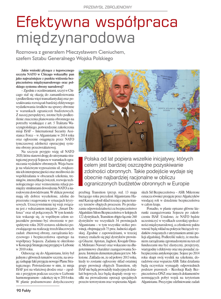 PRZEMYSŁ ZBROJENIOWY Efektywna współpraca międzynarodowa Rozmowa z generałem Mieczysławem Cieniuchem, szefem Sztabu Generalnego Wojska Polskiego Jakie wnioski płynące z tegorocznego szczytu NATO w Chicago wskazałby pan jako najważniejsze z punktu widzenia bezpieczeństwa międzynarodowego oraz polskiego systemu obrony narodowej? – Zgodnie z oczekiwaniami, szczyt w Chicago stał się okazją do zamanifestowania i podkreślenia więzi transatlantyckiej oraz poszukiwania rozwiązań bardziej efektywnego wydatkowania środków na sprawy obronne w warunkach ograniczeń budżetowych. Z naszej perspektywy, istotne było podkreślenie znaczenia planowania obronnego na potrzeby wynikające z art. 5 Traktatu Waszyngtońskiego, potwierdzenie zakończenia misji ISAF – International Security Assistance Force – w Afganistanie w 2014 roku oraz ogłoszenie osiągnięcia przez NATO tymczasowej zdolności operacyjnej systemu obrony przeciwrakietowej. Na szczycie przyjęto wizję sił NATO 2020, która stanowi drogę do utrzymania strategicznej pozycji Sojuszu w warunkach ograniczania wydatków obronnych. Wizja bazuje na właściwym wyposażeniu sił, zwiększeniu ich interoperacyjności oraz możliwości do współdziałania w obszarach szkolenia, treningów, intensyfikacji ćwiczeń, rozwoju technologicznego oraz wzmocnienia relacji pomiędzy strukturami dowodzenia NATO a narodowymi dowództwami. W efekcie powstać mają siły dobrze wyszkolone, zdolne do przerzutu i reagowania w sytuacjach kryzysowych. Urzeczywistnienie tej wizji związane jest z wdrażaniem inicjatyw „Smart Defence” oraz sił połączonych. W tym kontekście wskazuje się, że wspólnym celem sojuszników powinno być stworzenie w perspektywie roku 2020 zestawu zdolności pozwalającego na realizację trzech kluczowych zadań: zbiorowej obrony, zarządzania kryzysowego i bezpieczeństwa opartego na współpracy Sojuszu. Zadania te określono w Koncepcji Strategicznej przyjętej w Lizbonie w 2010 roku. Odnosząc się do Afganistanu, który był jednym z głównych tematów szczytu, na uwagę zasługuje fakt przyjęcia nowego Planu Strategicznego. Potwierdzono w nim, że misja ISAF jest na właściwej drodze oraz – zgodnie z przyjętym podczas szczytu w Lizbonie harmonogramem – zakończy się w 2014 roku. W planie podsumowano dotychczasowy 90 Fakty Polska od lat popiera wszelkie inicjatywy, których celem jest bardziej oszczędne pozyskiwanie zdolności obronnych. Takie podejście wydaje się obecnie najbardziej racjonalne w obliczu ograniczonych budżetów obronnych w Europie przebieg Transition (przyp. red. 13 maja bieżącego roku prezydent Afganistanu Hamid Karzaj ogłosił skład trzeciej z pięciu transzy terenów objętych procesem. Po przekazaniu odpowiedzialności za bezpieczeństwo Afgańskim Siłom Bezpieczeństwa w kolejnych 122 dystryktach, Transition objęto łącznie 260 dystryktów we wszystkich 34 prowincjach Afganistanu – w tym wszystkie stolice prowincji, obejmujących 75 proc. ludności afgańskiej. Zgodnie z zapowiedziami, w trzeciej transzy znalazło się pięć dystryktów prowincji Ghazni: Ajristan, Jaghori, Kwajah Omari, Melistan i Nawur) oraz wskazano na długoterminowy charakter zaangażowania Sojuszu. Istotnym elementem planu jest tzw. Milestone. Zakłada on, że od połowy 2013 roku, kiedy to zostanie ogłoszony skład ostatniej grupy prowincji objętych Transition, siły ISAF nie będą prowadziły tradycyjnych działań bojowych, lecz będą skupiały swoje wysiłki na prowadzeniu operacji specjalnych przeciw terrorystom oraz wspieraniu Afgań- skich Sił Bezpieczeństwa – ASB. Milestone oznacza również przejęcie przez Afgańczyków wiodącej roli w dziedzinie bezpieczeństwa w całym kraju. Ponadto, w planie opisano główne kierunki zaangażowania Sojuszu po zakończeniu ISAF. Ustalono, że NATO będzie uczestniczyć w wysiłkach szerokiej społeczności międzynarodowej, a członkowie paktu wnosić będą wkład na pokrycie bieżących wydatków związanych z utrzymaniem armii i policji afgańskiej. Podkreślić należy, że mechanizm zarządzania zgromadzonymi na ten cel funduszami ma być elastyczny, przejrzysty, wiarygodny i efektywny oraz ma posiadać zabezpieczenia antykorupcyjne. Sojusz po 2014 roku skupi swój wysiłek na szkoleniu, doradztwie oraz wsparciu ASB. Takie działania będą oczywiście wymagały odpowiednich podstaw prawnych – Rezolucji Rady Bezpieczeństwa ONZ oraz innych dokumentów normujących pobyt wojsk na terytorium Afganistanu. Precyzyjne zdefiniowanie zadań PRZEMYSŁ ZBROJENIOWY nowej misji stanowić będzie warunek do podjęcia decyzji o naszym ewentualnym uczestnictwie oraz skali zaangażowania. Odnosząc się do kwestii obrony przeciwrakietowej – OP, to ważne, że w Chicago ogłoszono tymczasową zdolność operacyjną systemu. Jest to wprawdzie tylko pierwszy krok, ale oznacza również, że obrona przeciwrakietowa pozostaje ważną składową całego systemu zapewnienia bezpieczeństwa państw Sojuszu. Kwestie OP mają także szczególne znaczenie dla Polski z racji planowanego ulokowania u nas elementów tarczy antyrakietowej w ramach kolejnych faz realizacji projektu. Jakie aspekty rozwoju narodowych sił zbrojnych najpełniej wpisują się w założenia i plany działań strategicznych NATO? Jakie wyzwania sojuszu warunkują zmiany i kierunki rozwoju w strukturach wojska polskiego oraz udział w tworzeniu systemu obronności w skali międzynarodowej? – Priorytetowym zadaniem spoczywającym na Siłach Zbrojnych RP pozostaje utrzymanie i wzmacnianie zdolności operacyjnych gwarantujących nienaruszalność granic oraz integralność terytorialną państwa. Jednocześnie, w trosce o naszą sojuszniczą wiarygodność, pozostajemy w gotowości do udziału w operacjach zarządzania kryzysowego NATO prowadzonych poza granicami państwa. Chcę podkreślić, że założenia dotyczące rozwoju Sił Zbrojnych RP na lata 2013–2022 wpisują