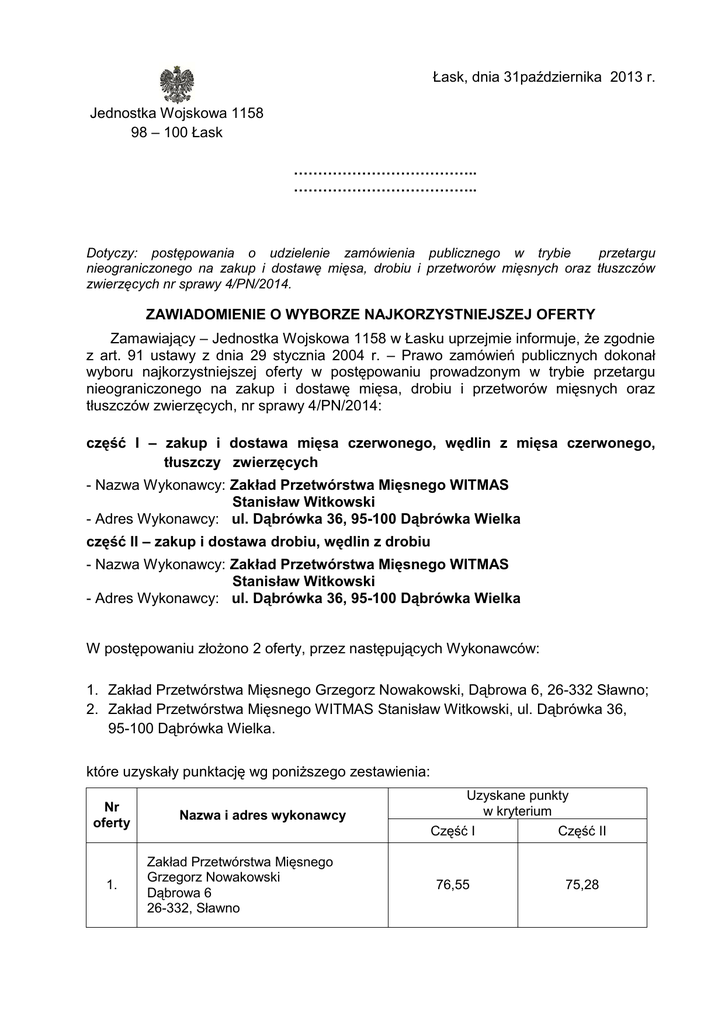Łask, dnia 31października 2013 r. Jednostka Wojskowa 1158 98 – 100 Łask ……………………………….. ……………………………….. Dotyczy: postępowania o udzielenie zamówienia publicznego w trybie przetargu nieograniczonego na zakup i dostawę mięsa, drobiu i przetworów mięsnych oraz tłuszczów zwierzęcych nr sprawy 4/PN/2014. ZAWIADOMIENIE O WYBORZE NAJKORZYSTNIEJSZEJ OFERTY Zamawiający – Jednostka Wojskowa 1158 w Łasku uprzejmie informuje, że zgodnie z art. 91 ustawy z dnia 29 stycznia 2004 r. – Prawo zamówień publicznych dokonał wyboru najkorzystniejszej oferty w postępowaniu prowadzonym w trybie przetargu nieograniczonego na zakup i dostawę mięsa, drobiu i przetworów mięsnych oraz tłuszczów zwierzęcych, nr sprawy 4/PN/2014: część I – zakup i dostawa mięsa czerwonego, wędlin z mięsa czerwonego, tłuszczy zwierzęcych - Nazwa Wykonawcy: Zakład Przetwórstwa Mięsnego WITMAS Stanisław Witkowski - Adres Wykonawcy: ul. Dąbrówka 36, 95-100 Dąbrówka Wielka część II – zakup i dostawa drobiu, wędlin z drobiu - Nazwa Wykonawcy: Zakład Przetwórstwa Mięsnego WITMAS Stanisław Witkowski - Adres Wykonawcy: ul. Dąbrówka 36, 95-100 Dąbrówka Wielka W postępowaniu złożono 2 oferty, przez następujących Wykonawców: 1. Zakład Przetwórstwa Mięsnego Grzegorz Nowakowski, Dąbrowa 6, 26-332 Sławno; 2. Zakład Przetwórstwa Mięsnego WITMAS Stanisław Witkowski, ul. Dąbrówka 36, 95-100 Dąbrówka Wielka. które uzyskały punktację wg poniższego zestawienia: Nr oferty 1. Nazwa i adres wykonawcy Zakład Przetwórstwa Mięsnego Grzegorz Nowakowski Dąbrowa 6 26-332, Sławno Uzyskane punkty w kryterium Część I Część II 76,55 75,28 Nr oferty 2. Nazwa i adres wykonawcy Zakład Przetwórstwa Mięsnego WITMAS Stanisław Witkowski ul. Dąbrowska 36 95-100, Dąbrówka Wielka Uzyskane punkty w kryterium Część I Część II 100 100 Jednocześnie Zamawiający informuje, że zgodnie z wyborem najkorzystniejszej oferty zawrze umowę z Wykonawcą, którego oferta była najkorzystniejsza w poszczególnych częściach postępowania o udzielenie zamówienia publicznego na zakup i dostawę mięsa, drobiu i przetworów mięsnych oraz tłuszczów zwierzęcych, nr sprawy 4/PN/2014. Zgodnie z art. 94 ust. 1 termin po upływie którego umowa w sprawie zamówienia publicznego może być zawarta to: 05.11.2013 r. DOWÓDCA (-) zu. ppłk mgr inż. Zbigniew ROSIAK