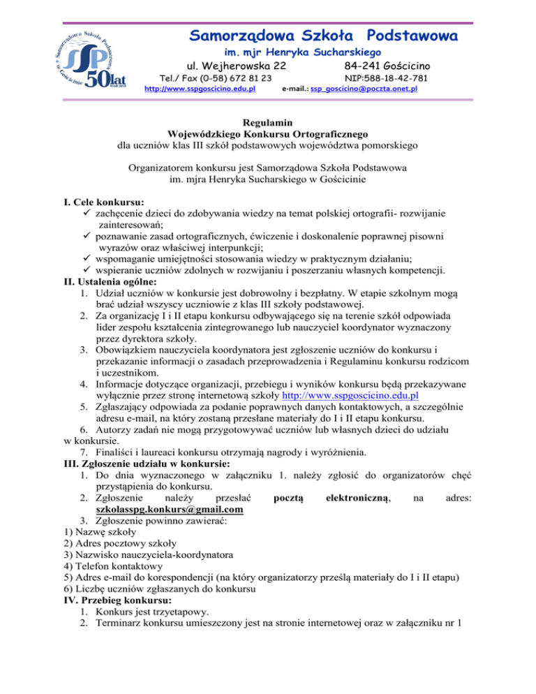 Samorządowa Szkoła Podstawowa im. mjr Henryka Sucharskiego ul. Wejherowska 22 84-241 GoŚcicino Tel./ Fax (0-58) 672 81 23 http://www.sspgoscicino.edu.pl NIP:588-18-42-781 e-mail.: [email protected] Regulamin Wojewódzkiego Konkursu Ortograficznego dla uczniów klas III szkół podstawowych województwa pomorskiego Organizatorem konkursu jest Samorządowa Szkoła Podstawowa im. mjra Henryka Sucharskiego w Gościcinie I. Cele konkursu: zachęcenie dzieci do zdobywania wiedzy na temat polskiej ortografii- rozwijanie zainteresowań; poznawanie zasad ortograficznych, ćwiczenie i doskonalenie poprawnej pisowni wyrazów oraz właściwej interpunkcji; wspomaganie umiejętności stosowania wiedzy w praktycznym działaniu; wspieranie uczniów zdolnych w rozwijaniu i poszerzaniu własnych kompetencji. II. Ustalenia ogólne: 1. Udział uczniów w konkursie jest dobrowolny i bezpłatny. W etapie szkolnym mogą brać udział wszyscy uczniowie z klas III szkoły podstawowej. 2. Za organizację I i II etapu konkursu odbywającego się na terenie szkół odpowiada lider zespołu kształcenia zintegrowanego lub nauczyciel koordynator wyznaczony przez dyrektora szkoły. 3. Obowiązkiem nauczyciela koordynatora jest zgłoszenie uczniów do konkursu i przekazanie informacji o zasadach przeprowadzenia i Regulaminu konkursu rodzicom i uczestnikom. 4. Informacje dotyczące organizacji, przebiegu i wyników konkursu będą przekazywane wyłącznie przez stronę internetową szkoły http://www.sspgoscicino.edu.pl 5. Zgłaszający odpowiada za podanie poprawnych danych kontaktowych, a szczególnie adresu e-mail, na który zostaną przesłane materiały do I i II etapu konkursu. 6. Autorzy zadań nie mogą przygotowywać uczniów lub własnych dzieci do udziału w konkursie. 7. Finaliści i laureaci konkursu otrzymają nagrody i wyróżnienia. III. Zgłoszenie udziału w konkursie: 1. Do dnia wyznaczonego w załączniku 1. należy zgłosić do organizatorów chęć przystąpienia do konkursu. 2. Zgłoszenie należy przesłać pocztą elektroniczną, na adres: [email protected] 3. Zgłoszenie powinno zawierać: 1) Nazwę szkoły 2) Adres pocztowy szkoły 3) Nazwisko nauczyciela-koordynatora 4) Telefon kontaktowy 5) Adres e-mail do korespondencji (na który organizatorzy prześlą materiały do I i II etapu) 6) Liczbę uczniów zgłaszanych do konkursu IV. Przebieg konkursu: 1. Konkurs jest trzyetapowy. 2. Terminarz konkursu umieszczony jest na stronie internetowej oraz w załączniku nr 1 do niniejszego Regulaminu. 3. Konkurs na wszystkich etapach ma formę pisemną i zawiera dyktando. Uczniowie powinni wykazać się zarówno znajomością podstawowych zasad ortograficznych jak i praktycznym ich stosowaniem. 4. Dyktando uczniowie powinni zapisywać piórem lub długopisem. 5. Podczas konkursu nie wolno używać korektorów, a wszelkie poprawki powinny być wykonywane w określony sposób: przekreślenie błędu jedną linią poziomą, estetyczne i wyraźne, poprawne napisanie całego wyrazu nad lub obok skreślenia, poprawki nieczytelne i niejednoznaczne uznane zostaną za błąd. 6. Etap pierwszy i drugi (eliminacje) uczniowie będą pisali na terenie swoich szkół. Składa się on z dyktanda. 7. Dyktanda eliminacyjne muszą być przeprowadzone w wyznaczonym w terminarzu dniu, o tej samej godzinie dla wszystkich uczniów w szkole przystępujących do konkursu. 8. Testy eliminacyjne sprawdza komisja szkolna pod przewodnictwem nauczyciela koordynatora. 9. Zadaniem komisji jest wyłonienie uczniów, którzy w eliminacjach osiągnęli 95 lub więcej procent poprawności. Nazwiska tych uczniów wraz z wynikami należy wpisać do protokołu (wg załącznika nr3) i przesłać do organizatorów. 10. Nauczyciel koordynator jest zobowiązany do uzyskania od Rodziców uczniów zgody na przetwarzanie danych osobowych na potrzeby Konkursu (wg wzoru w załączniku nr 2).Wypełnione druki przechowuje nauczyciel koordynator. Uwaga: Osiągnięcie wyniku powyżej 95% nie jest równoznaczne z zakwalifikowaniem się do kolejnego etapu. 11. Protokół komisji (wg załącznika nr 3), należy jak najszybciej, nie później niż w dniu podanym w terminarzu, przesłać do organizatorów faksem, na numer 586728123 12. Organizatorzy, po zapoznaniu się z wynikami z I i II etapu, wyłonią 15. uczniów, którzy wezmą udział w kolejnym etapie. 13. Lista uczniów zakwalifikowanych do III etapu opublikowana zostanie na stronie internetowej konkursu. 14. Dyktanda etapu I i II uczniów, którzy zakwalifikowani zostali do kolejnego etapu, należy dostarczyć organizatorom w dniu przeprowadzania etapu III. 15. Podczas etapu III uczniowie wykażą się umiejętnością pisania ze słuchu. 16. Trzeci etap odbędzie się w miejscu wyznaczonym przez Organizatorów. 17. Uczniowie powinni przynieść własne przybory do pisania i legitymację szkolną. 18. W III etapie konkursu weźmie udział 15. uczniów, którzy uzyskają najwyższą sumę punktów z etapów I i II, a także ci uczestnicy, którzy zdobyli identyczną liczbę punktów, jaką uzyskał 15. uczestnik. 19. Tytuł laureata konkursu otrzymuje 8 uczniów, którzy uzyskali najwyższą liczbę punktów w etapie III, a także ci uczestnicy, którzy zdobyli identyczną liczbę punktów, jaką uzyskał ósmy laureat. 20. Prace konkursowe pod względem poprawności ortograficznej i interpunkcyjnej sprawdzi komisja składająca się z organizatorów konkursu oraz nauczycieli SSP w Gościcinie. 21. Dyktanda III etapu - finału konkursu, po napisaniu ich przez uczniów, pozostają do dyspozycji jury i organizatorów. 22. Decyzja jurorów dotycząca wyników konkursu jest ostateczna i nie podlega zmianie. 23. Organizatorzy zapewniają uczestnikom słodki poczęstunek. V. Zasady oceniania prac konkursowych 1. Komisje konkursowe oceniają poprawność ortograficzną zgodnie z następującymi kryteriami: Za błędy popełnione podczas pisania ze słuchu punkty są odejmowane od określonej maksymaln