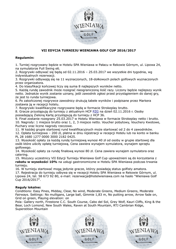 VII EDYCJA TURNIEJU WIENIAWA GOLF CUP 2016/2017 Regulamin: 1. Turniej rozgrywany będzie w Hotelu SPA Wieniawa w Pałacu w Rekowie Górnym, ul. Lipowa 24, na symulatorze Full Swing e6. 2. Rozgrywki odbywać się będą od 02.11.2016 – 25.03.2017 we wszystkie dni tygodnia, wg indywidualnych rezerwacji. 3. Rozgrywki odbywają się na 11 wyznaczonych, 18-dołkowych polach golfowych wyznaczonych przez organizatora. 4. Do klasyfikacji końcowej liczy się suma 8 najlepszych wyników netto. 5. Każdą rundę zawodnik może rozegrać nieograniczoną ilość razy. Liczony będzie najlepszy wynik netto. Jednakże wynik zostanie uznany, jeśli zawodnik zgłosi przed przystąpieniem do danej gry, że jest to runda turniejowa. 6. Po zakończonej rozgrywce zawodnicy drukują tabele wyników i podpisane przez Markera zostawia ją w recepcji hotelu. 7. Rozgrywki kwalifikacyjne rozgrywane będą w formacie Strokeplay brutto. 8. Gracze przystępują do turnieju z aktualnym HCP PZG na dzień 02.11.2016 r. Osoby posiadającą Zieloną Kartę przystępują do turnieju z HCP 36. 9. Finał zostanie rozegrany 25.03.2017 w Hotelu Wieniawa w formacie Strokeplay netto i brutto. 10. Nagrody: 1 miejsce brutto oraz 1, 2, 3 miejsce netto. Voucher pobytowy, Vouchery Kwotowe, Puchary oraz liczne nagrody rzeczowe. 11. W każdej grupie startowej rund kwalifikacyjnych może startować od 2 do 4 zawodników. 12. Opłata turniejowa – 200 zł, płatna w dniu rejestracji w recepcji Hotelu lub na konto w banku PL 28 1680 1277 0000 3000 2182 0425. 13. Wysokość opłaty za każdą rundę turniejową wynosi 40 zł od osoby w grupie startowej dla osób które uiściły opłatę turniejową. Cena zawiera wynajem symulatora, wynajem sprzętu golfowego. 14. Wysokość opłaty za rundę finałową wynosi 80 zł. Cena zawiera wynajem symulatora oraz catering. 15. Wszyscy uczestnicy VII Edycji Turnieju Wieniawa Golf Cup upoważnieni są do korzystania z rabatu w wysokości 10% na usługi gastronomiczne w Hotelu SPA Wieniawa podczas trwania turnieju. 16. W turnieju startować mogą jedynie gracze, którzy posiadają status golfisty amatora. 17. Rejestracja do turnieju odbywa się w recepcji Hotelu SPA Wieniawa w Rekowie Górnym, ul. Lipowa 24, tel. 58 673 92 80, e-mail: [email protected] na hasło "Wieniawa Golf Cup 2016/2017". Reguły lokalne: Conditions: Easy Pines, Midday, Clear, No wind, Moderate Greens, Medium Greens, Moderate Fairways. Settings: No mulligans, Large ball, Gimmie 1,83 m, No putting arrow, Arrow fade on, Grid on green, Playing elevation: on Pola: Gallery north, Firestone C.C. South Course, Cabo del Sol, Grey Wolf, Kauri Cliffs, King & the Bear, Loch Lomond, New South Wales, Raven at South Mountain, RTJ Cambrian Ridge, Superstition Mountain