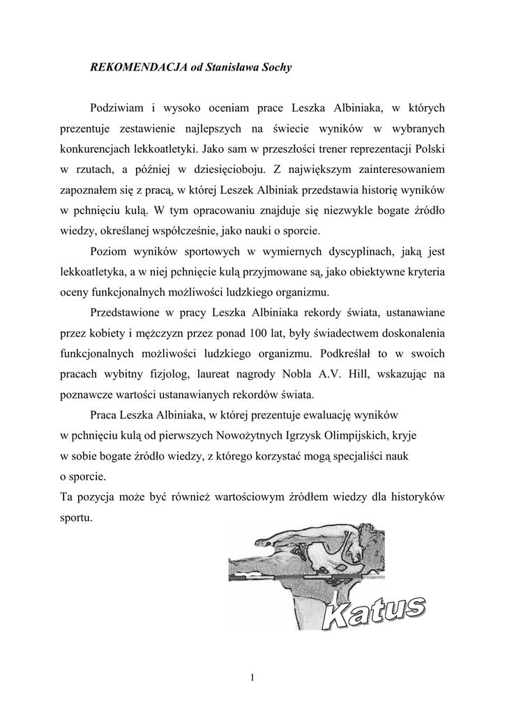 REKOMENDACJA od Stanisława Sochy Podziwiam i wysoko oceniam prace Leszka Albiniaka, w których prezentuje zestawienie najlepszych na świecie wyników w wybranych konkurencjach lekkoatletyki. Jako sam w przeszłości trener reprezentacji Polski w rzutach, a później w dziesięcioboju. Z największym zainteresowaniem zapoznałem się z pracą, w której Leszek Albiniak przedstawia historię wyników w pchnięciu kulą. W tym opracowaniu znajduje się niezwykle bogate źródło wiedzy, określanej współcześnie, jako nauki o sporcie. Poziom wyników sportowych w wymiernych dyscyplinach, jaką jest lekkoatletyka, a w niej pchnięcie kulą przyjmowane są, jako obiektywne kryteria oceny funkcjonalnych możliwości ludzkiego organizmu. Przedstawione w pracy Leszka Albiniaka rekordy świata, ustanawiane przez kobiety i mężczyzn przez ponad 100 lat, były świadectwem doskonalenia funkcjonalnych możliwości ludzkiego organizmu. Podkreślał to w swoich pracach wybitny fizjolog, laureat nagrody Nobla A.V. Hill, wskazując na poznawcze wartości ustanawianych rekordów świata. Praca Leszka Albiniaka, w której prezentuje ewaluację wyników w pchnięciu kulą od pierwszych Nowożytnych Igrzysk Olimpijskich, kryje w sobie bogate źródło wiedzy, z którego korzystać mogą specjaliści nauk o sporcie. Ta pozycja może być również wartościowym źródłem wiedzy dla historyków sportu. 1 Stanisław Socha prof. dr hab. Listopad, 2013 Urodzony 1.05.1932r. Absolwent obecnego Państwowego Uniwersytetu Kultury Fizycznej, Sportu i Zdrowia im. Piotra Lesgafta w Sankt – Petersburgu oraz Wydziału Filozoficzno – Historycznego Uniwersytetu we Wrocławiu. W 1966 roku uzyskał stopień naukowy doktora, w 1976 roku doktora habilitowanego, a w 1986 roku tytuł profesora nauk kultury fizycznej. W latach 1955 do 1970 pracował w Akademii Wychowania Fizycznego we Wrocławiu. Od 1970 roku do nadal pracuje w Akademii Wychowania Fizycznego im. Jerzego Kukuczki w Katowicach. W latach 1984-90 był Rektorem AWF w Katowicach i pełnił funkcję Przewodniczącego Kolegium Rektorów Uczelni Śląskich. W latach 1990-93 był członkiem Prezydium Rady Głównej Szkolnictwa Wyższego. Przez ponad 30 lat pracę w szkolnictwie wyższym łączył z pracą trenera lekkoatletyki, początkowo w rzutach a od 1969 roku w dziesięcioboju. W charakterze trenera kadry olimpijskiej dwukrotnie uczestniczył w Igrzyskach Olimpijskich - w Monachium i Montrealu. W tym okresie reprezentacja Polski zdobyła pierwszy i dotąd jedyny medal olimpijski w dziesięcioboju, a reprezentant Polski został Mistrzem Europy w 1974 roku. Stanisław Socha jest także cenionym teoretykiem sportu. Opublikował ponad 150 pozycji naukowych i popularno – naukowych, w tym także w języku rosyjskim i angielskim. 2 RECOMMENDATION from Stanisław Socha I admire and appreciate the work of Leszek Albiniak, in which he presents a list of the world's best results in selected disciplines of athletics. He was in the past a coach of the Polish representation in throwing, and later in the decathlon. With the greatest interest I have read the study, in which Leszek Albiniak presents the story of the results in the shot put. In this study there is an extremely rich source of knowledge, known today as the science of sport. The level of athletic performance in measurable disciplines, which is athletics, and the shot put are accepted as objective criteria for evaluating the functional capabilities of the human body. The study of Leszek Albiniak presents world records established by men and women for over 100 years, which were a testimony of improving the functional capabilities of the human body. Stressed in his work outstanding physiologist, Nobel laureate AV Hill, pointing the cognitive values of world records. Leszek Albiniak in his work presents the evaluation of results in the shot put from the first Modern Olympic Games, which is a rich source of knowledge, that can be used by specialists in sports sciences. This item can also be a valuable source of information for historians of sport. 3 Stanisław Socha prof. dr hab. November, 2013 He was born on 01.05.1932. Graduate of the current State University of Physical Culture, Sport and Health them. Piotr Lesgaft in Saint - Petersburg and the Faculty of Philosophy History of the University in Wrocław. In 1966 he obtained a PhD degree, in 1976 the doctor habilitated in 1986 the title of professor of physical culture. Between 1955 and 1970 he worked at the Academy of Physical Education in Wroclaw. From 1970 he is working at the Academy of Physical Education them. Jerzy Kukuczka in Katowice. From 1984 to 1990 he was the Rector of the Academy of Physical Education in Katowice and has been President of the College of Rectors of the Universities of Silesian. From 1990-1993 he was a member of the Presidium of the Council of Higher Education. For more than 30 years working in higher education he combined it with work as athletics coach, initially in the throwing and since 1969 in the decathlon. As a coach the Olympic team twice participated in the Olympic Games – in Munich and Montreal. During this period, the Polish team won the first and so far only Olympic medal in the decathlon, and Polish representative was European Champion in 1974. Stanislaw Socha is also a respected theorist of sport. He has published more than 150 scientific publications and popular - science, including in Russian and English. 4 RECOMENDACIÓN escrita por Stanisław Socha Admiro y aprecio el trabajo de Leszek Albiniak, que presenta una estadística de los mejores resultados del mundoen las disciplinas de atletismo, anteriormente seleccionadas. Yo, como exentrenador de la representación de Polonia en lanzamientos y posteriormente en el decatlón con el mayor interés me familiaricé con el análisis, en el cual Leszek Albiniak presenta la historia de los resultados del lanzamiento de peso. En este estudio hay una importante fuente de conoci
