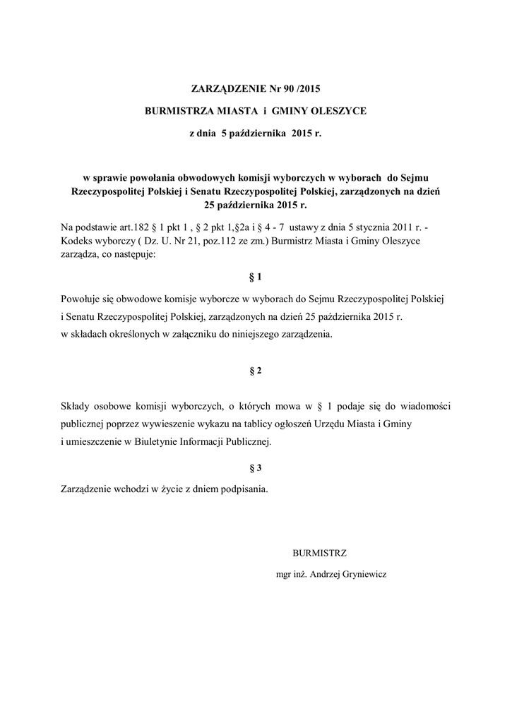 ZARZĄDZENIE Nr 90 /2015 BURMISTRZA MIASTA i GMINY OLESZYCE z dnia 5 października 2015 r. w sprawie powołania obwodowych komisji wyborczych w wyborach do Sejmu Rzeczypospolitej Polskiej i Senatu Rzeczypospolitej Polskiej, zarządzonych na dzień 25 października 2015 r. Na podstawie art.182 § 1 pkt 1 , § 2 pkt 1,§2a i § 4 - 7 ustawy z dnia 5 stycznia 2011 r. Kodeks wyborczy ( Dz. U. Nr 21, poz.112 ze zm.) Burmistrz Miasta i Gminy Oleszyce zarządza, co następuje: §1 Powołuje się obwodowe komisje wyborcze w wyborach do Sejmu Rzeczypospolitej Polskiej i Senatu Rzeczypospolitej Polskiej, zarządzonych na dzień 25 października 2015 r. w składach określonych w załączniku do niniejszego zarządzenia. §2 Składy osobowe komisji wyborczych, o których mowa w § 1 podaje się do wiadomości publicznej poprzez wywieszenie wykazu na tablicy ogłoszeń Urzędu Miasta i Gminy i umieszczenie w Biuletynie Informacji Publicznej. §3 Zarządzenie wchodzi w życie z dniem podpisania. BURMISTRZ mgr inż. Andrzej Gryniewicz Załącznik do Zarządzenia Nr 90/2015 Burmistrza Miasta i Gminy Oleszyce z dnia 5 października 2015 r. SKŁADY OSOBOWE OBWODOWYCH KOMISJI WYBORCZYCH Obwodowa Komisja Wyborcza Nr 1 w Futorach Siedziba Obwodowej Komisji Wyborczej - świetlica wiejska w Futorach. Lp. Imiona Nazwisko Miejsce zamieszkania Podmiot zgłaszający 1 Katarzyna Obirek Oleszyce KW Korwin 2 Paweł Zając Futory KWW „Kukiz 15” 3 Patrycja Cybulska Oleszyce KWW Zjednoczona Lewica SLD +TR+ PPS+ UP+ Zieloni 4 Renata Butyńska Stare Oleszyce KW Prawo i Sprawiedliwość 5 Stanisław Gacek Futory KW Polskie Stronnictwo Ludowe 6 Ewelina Krystyna Kuszaj Futory KW Platforma Obywatelska RP 7 Teresa Purgal Oleszyce KW Nowoczesna Ryszard Petru 8 Jolanta Cisek Futory KWW Grzegorza Brauna „Szczęść Boże” 9. Elżbieta Szczebiwilk Zapałów Pracownik samorządowy wskazany przez Burmistrza Obwodowa Komisja Wyborcza Nr 2 w Nowej Grobli Siedziba Obwodowej Komisji Wyborczej - Sala gimnastyczna Domu Dziecka w Nowej Grobli. Lp. Imiona Nazwisko Miejsce zamieszkania Podmiot zgłaszający 1 Bartłomiej Piotr Borysowicz Oleszyce KW Korwin 2 Mariola Alicja Karwan Oleszyce KWW „ Kukiz 15” 3 Małgorzata Linek Zalesie KW Prawo i Sprawiedliwość 4 Joanna Presz Nowa Grobla KW Polskie Stronnictwo Ludowe 5 Damian Kuszaj Futory KW Platforma Obywatelska RP 6 Justyna Filipowicz Borchów KW Nowoczesna Ryszard Petru 7 Urszula Kryla Stare Sioło KWW JOW BEZPARTYJNI 8 Józef Stefanko Nowa Grobla KWW Grzegorza Brauna „ Szczęść Boże” 9 Adolf Kalmuk Oleszyce Pracownik samorządowy wskazany przez Burmistrza Obwodowa Komisja Wyborcza Nr 3 w Oleszycach Siedziba Obwodowej Komisji Wyborczej - Sala gimnastyczna Szkoły Podstawowej w Oleszycach Lp. Imiona Nazwisko Miejsce zamieszkania Podmiot zgłaszający 1 Waldemar Józef Lis Oleszyce KW Korwin 2 Joanna Erceg Oleszyce KWW „ Kukiz 15” 3 Wanda Zofia Wójcik Oleszyce KWW Zjednoczona Lewica SLD +TR+ PPS+ UP+ Zieloni 4 Łucja Woroniak Oleszyce KW Prawo i Sprawiedliwość 5 Bartłomiej Sopel Oleszyce KW Polskie Stronnictwo Ludowe 6 Łukasz Kaczmarczyk Oleszyce KW Nowoczesna Ryszard Petru 7 Ewa Sagan Oleszyce KWW JOW BEZPARTYJNI 8 Katarzyna Maria Puka Oleszyce KWW Grzegorza Brauna „Szczęść Boże” 9 Maria Nieckarz Oleszyce Pracownik samorządowy wskazany przez Burmistrza Obwodowa Komisja Wyborcza Nr 4 w Oleszycach Siedziba Obwodowej Komisji Wyborczej - Zespół Szkół w Oleszycach Lp. Imiona Nazwisko Miejsce zamieszkania Podmiot zgłaszający 1 Rafał Piotr Morawski Oleszyce KW Korwin 2 Fryderyk Dec Oleszyce KWW „ Kukiz 15” 3 Krystyna Argasińska Oleszyce KWW Zjednoczona Lewica SLD +TR+ PPS+ UP+ Zieloni 4 Czesław Jarmuziewicz Oleszyce KW Prawo i Sprawiedliwość 5 Agnieszka Małgorzata Borysowicz Futory KW Platforma Obywatelska RP 6 Krzysztof Michał Purgal Oleszyce KW Nowoczesna Ryszard Petru 7 Joanna Zwierzyńska Stare Oleszyce KWW JOW BEZPARTYJNI 8 Marek Bobecki Oleszyce KWW Grzegorza Brauna „Szczęść Boże” 9 Zdzisława Spryńska Oleszyce Pracownik samorządowy wskazany przez Burmistrza Obwodowa Komisja Wyborcza Nr 5 w Starych Oleszycach Siedziba Obwodowej Komisji Wyborczej – Remiza Strażacka w Starych Oleszycach Lp. Imiona Nazwisko Miejsce zamieszkania Podmiot zgłaszający 1 Kamila Magdalena Żulewicz Stare Oleszyce KW Korwin 2 Jagoda Bednarz Oleszyce KWW „ Kukiz 15” 3 Wiesław Klojzy Oleszyce KWW Zjednoczona Lewica SLD +TR +PPS +UP +Zieloni 4 Justyna Hromyk Stare Oleszyce KW Prawo i Sprawiedliwość 5 Diana Karolina Puk Stare Oleszyce KW Polskie Stronnictwo Ludowe 6 Janusz Wojciech Horeczy Oleszyce KW Nowoczesna Ryszard Petru 7 Maria Mozol Stare Oleszyce KWW JOW BEZPARTYJNI 8 Marzena Witkowska Uszkowce KWW Grzegorza Brauna „Szczęść Boże” 9 Janusz Kuras Stare Sioło Pracownik samorządowy wskazany przez Burmistrza Obwodowa Komisja Wyborcza Nr 6 w Starym Siole Siedziba Obwodowej Komisji Wyborczej - Dom Strażaka w Starym Siole Lp. Imiona Nazwisko Miejsce zamieszkania Podmiot zgłaszający 1 Łukasz Cezary Pizun Oleszyce KW Korwin 2 Anna Pelc Stare Sioło KWW „ Kukiz 15” 3 Daniel Ciupa Oleszyce KWW Zjednoczona Lewica SLD +TR +PPS +UP +Zieloni 4 Hubert Ważny Stare Oleszyce KW Prawo i Sprawiedliwość 5 Mariola Justyna Kołcz Stare Sioło KW Polskie Stronnictwo Ludowe 6 Justyna Wiesława Hanasiewicz Oleszyce KW Platforma Obywatelska RP 7 Maciej Jan Kalmuk Oleszyce KW Nowoczesna Ryszard Petru 8 Halina Zaniewicz Stare Sioło KWW JOW BEZPARTYJNI 9 Tomasz Janusz Oleszyce Pracownik samorządowy wskazany przez Burmistrza Obwodowa Komisja Wyborcza Nr 7 w Zalesiu Siedziba Obwodowej Komisji Wyborczej - Świetlica wiejska w Zalesiu Lp. Imiona Nazwisko Miejsce zamieszkania Podmiot zgłaszający 1 Martyna Pizun Oleszyce KW Korwin 2 Magdalena Pukas Zalesie KWW „ Kukiz 15” 3 Sylwia Wójcik Oleszyce KWW Zjednoczona Lewica SLD +TR +PPS +UP +Zieloni 4 Monika Rozwód Zalesie KW Prawo i Sprawiedliwość 5 Paweł Rydzik Zalesie KW Polskie Stronnictwo Lud