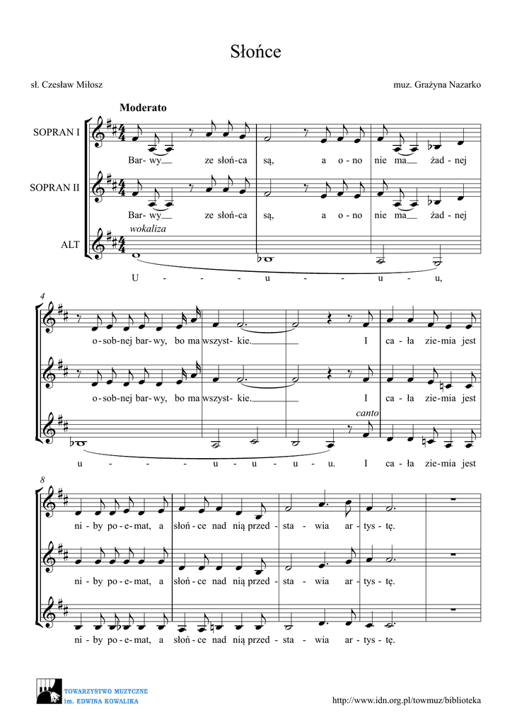 Słońce sł. Czesław Miłosz muz. Grażyna Nazarko ° ## 4 j j j ‰ œ œ œj ˙ & 4œ j œ œ Moderato SOPRAN I ze słoń - ca są, Bar- wy wokaliza ze słoń - ca są, #4 j j j ‰ œ œ œj ˙ & #4 œ j œ œ SOPRAN II ALT Bar- wy ‰ j œj j œj j œ œ œ œ bœ œ ¢ ## 4 & 4 w a o - no nie ma żad - nej a o - no nie ma żad - nej ‰ j œj j œj j œ œ œ œ bœ œ bw U - - - u - ˙ - u - ˙ u, ° ## r j j r ‰ j j œ œ & œ œ œ œ œ œ ˙™ ˙ j Œ ‰ œj œ œ œj œ œ # r & # ‰ œj œj œj œj œ œr œ œ ˙™ ˙ Œ ‰ œj œ œ j œ n œ œj ˙ ‰ œj j j œ œ n œ œ œ œ 4 o - sob- nej bar - wy, bo ma wszyst - kie. ## & ¢ o - sob- nej bar - wy, bo ma wszyst - kie. bw u - - - ˙ u ˙ - u ° ## & œ œj œj œj œ œj œ œj œ œ j œ - u 8 ni - by po - e- mat, a ¢ ## & ni - by po - e- mat, a - u. I ca - ła zie - mia jest zie - mia jest zie - mia jest ˙ œ™ œ œ ˙™ J ∑ ˙ j œ ˙™ œ ™ œ ∑ ˙ j œ™ œ œ ˙ ™ ∑ słoń - ce nad nią przed - sta - wia j j j j j j œ œ œbœ œ œ œ œ nœ œ œ ca - ła I ca - ła canto słoń - ce nad nią przed - sta - wia ## j j j j & œ œ œ œ œ œ œ œj œ œ j œ ni - by po - e- mat, a I słoń - ce nad nią przed - sta - wia ar - tys - tę. ar - tys - tę. ar - tys - tę. http://www.idn.org.pl/towmuz/biblioteka ° ## j j j j r j j j j j r ‰ ‰ ‰ j œœ œ ˙ & œ j œ œ œ œ j bœ œ œ œ œ œ œ œ œ œ œ œ 2 13 Kto chce ma - lo - wać świat w barw- nej po - sta - ci, niech nie pa- trzy nig - dy pro - sto Kto chce wokaliza ma - lo - wać świat w barw- nej po - sta - ci, niech nie pa- trzy nig - dy pro - sto ## j j j j r j j j j j r ‰ ‰ ‰ j œœ œ ˙ & œ j œ œ œ œ j bœ œ œ œ œ œ œ œ œ œ œ œ ¢ ## & w U - ° ## & œ ˙™ 17 w słoń - ce, ## & œ ˙™ w słoń - ce, ¢ ## & ˙ ° ## & ˙ 22 ## & ¢ - u ˙ - bo ˙ bo ˙ ˙ œ œ™ œ J ‰ œj bo œ ˙™ - u - u, pa- mięć rze - czy, któ - re wi - dział, stra- ci, łzy tyl - ko w o- czach zo- j œ œ n œ œ œr œr œ œ b œj œ œj œ œj n œ œ œj pa- mięć rze - czy, któ - re wi - dział, stra- ci, łzy tyl - ko w o- czach zo- ∑ ∑ pie - ką - ce. j œ™ œ œ ˙ ™ sta - ną u bw pa- mięć rze - czy, któ - re wi - dział, stra- ci, łzy tyl - ko w o- czach zo- pie - ką - ce. j œ ˙™ œ œ™ sta - ną - ˙ j j j j ˙ Œ ‰ œ œ œ œ n œ œr œr œ œ œ œ œ œ œj œ œ j œ u - u - u, sta - ną - ˙ j j r r j j j œ Ó ‰œ œ œ œ œ œ œ œ œ œ œ œ œ œ œ œ j œ canto u ## & bw pie - ką - ce. ∑ j j j j ‰ œ œ œ ˙ œ j œ œ Nie- chaj przy - klęk - nie, twarz Nie- chaj wokaliza przy - klęk - nie, twarz ‰ j œj j œ œ ku tra - wie j j j j ‰ œ œ œ ˙ œ j œ œ w U - - - bw u ‰ j œj j œ œ ku tra - wie - - http://www.idn.org.pl/towmuz/biblioteka ° ## j & œ 3 27 j œ œ bœ œ schy - li ## j & œ ¢ ## & i schy - li i ˙ pa - trzy znaj œ znaj œ znaj ˙ - 31 ¢ u œ - dzie œ - dzie œ - dzie bw - Œ ˙ ‰ œj Tam j œ œ œ wszyst - ko, i zmierz j j j œ œ œ œ ró - że, j œ i ˙ zmierz j j j œ œ nœ œ j œ ˙ gwiaz - dy gwiaz - dy i i ró - że, i œ coś - my po r r œ œ œ coś - my ró - że, i po r r œ œ nœ j nœ œ coś - my wszyst - ko, # &# œ r r œ œ j œ gwiaz - dy œ u wszyst - ko, j œ ˙ ˙ u, j j j œ œ œ œ 33 ¢ œ ˙™ ‰ œj Tam w pro - mień od zie - mi od - bi - ty. ° ## & œ # &# j j j j œ œ œ œ œ œ Œ ˙ ‰ œj canto ° ## rit. & œ ## & œ ˙™ w pro - mień od zie - mi od - bi - ty. j œ œ bœ œ u ## & pa - trzy j j j j œ œ œ œ œ œ ˙ zmierz - - - po œ œ chy, i œ œ chy, i œ œ chy, i - - u - œ rzu œ - rzu - œ œ rzu j œ ci j œ - ci - j bœ ci - u. - U œ™ - li: - U œ™ U œ™ li: ˙™ U w ˙™ świ - ty. Tam li: ˙™ świ - ty. œ u œ U w świ - ty. œ - ˙ U w http://www.idn.org.pl/towmuz/biblioteka