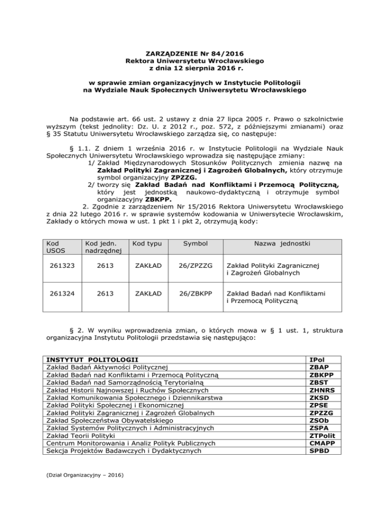 ZARZĄDZENIE Nr 84/2016 Rektora Uniwersytetu Wrocławskiego z dnia 12 sierpnia 2016 r. w sprawie zmian organizacyjnych w Instytucie Politologii na Wydziale Nauk Społecznych Uniwersytetu Wrocławskiego Na podstawie art. 66 ust. 2 ustawy z dnia 27 lipca 2005 r. Prawo o szkolnictwie wyższym (tekst jednolity: Dz. U. z 2012 r., poz. 572, z późniejszymi zmianami) oraz § 35 Statutu Uniwersytetu Wrocławskiego zarządza się, co następuje: § 1.1. Z dniem 1 września 2016 r. w Instytucie Politologii na Wydziale Nauk Społecznych Uniwersytetu Wrocławskiego wprowadza się następujące zmiany: 1/ Zakład Międzynarodowych Stosunków Politycznych zmienia nazwę na Zakład Polityki Zagranicznej i Zagrożeń Globalnych, który otrzymuje symbol organizacyjny ZPZZG. 2/ tworzy się Zakład Badań nad Konfliktami i Przemocą Polityczną, który jest jednostką naukowo-dydaktyczną i otrzymuje symbol organizacyjny ZBKPP. 2. Zgodnie z zarządzeniem Nr 15/2016 Rektora Uniwersytetu Wrocławskiego z dnia 22 lutego 2016 r. w sprawie systemów kodowania w Uniwersytecie Wrocławskim, Zakłady o których mowa w ust. 1 pkt 1 i pkt 2, otrzymują kody: Kod USOS Kod jedn. nadrzędnej Kod typu Symbol Nazwa jednostki 261323 2613 ZAKŁAD 26/ZPZZG Zakład Polityki Zagranicznej i Zagrożeń Globalnych 261324 2613 ZAKŁAD 26/ZBKPP Zakład Badań nad Konfliktami i Przemocą Polityczną § 2. W wyniku wprowadzenia zmian, o których mowa w § 1 ust. 1, struktura organizacyjna Instytutu Politologii przedstawia się następująco: INSTYTUT POLITOLOGII Zakład Badań Aktywności Politycznej Zakład Badań nad Konfliktami i Przemocą Polityczną Zakład Badań nad Samorządnością Terytorialną Zakład Historii Najnowszej i Ruchów Społecznych Zakład Komunikowania Społecznego i Dziennikarstwa Zakład Polityki Społecznej i Ekonomicznej Zakład Polityki Zagranicznej i Zagrożeń Globalnych Zakład Społeczeństwa Obywatelskiego Zakład Systemów Politycznych i Administracyjnych Zakład Teorii Polityki Centrum Monitorowania i Analiz Polityk Publicznych Sekcja Projektów Badawczych i Dydaktycznych (Dział Organizacyjny – 2016) IPol ZBAP ZBKPP ZBST ZHNRS ZKSD ZPSE ZPZZG ZSOb ZSPA ZTPolit CMAPP SPBD § 3. Zobowiązuje się Dziekana Wydziału Nauk Społecznych do naniesienia zmian wprowadzonych niniejszym zarządzeniem w Regulaminie Organizacyjnym Instytutu Politologii. § 4. Nadzór nad wykonaniem niniejszego zarządzenia powierza się Prorektorowi do spraw Badań Naukowych i Współpracy z Zagranicą. § 5. Zarządzenie wchodzi w życie z dniem podpisania. REKTOR (Dział Organizacyjny – 2016)