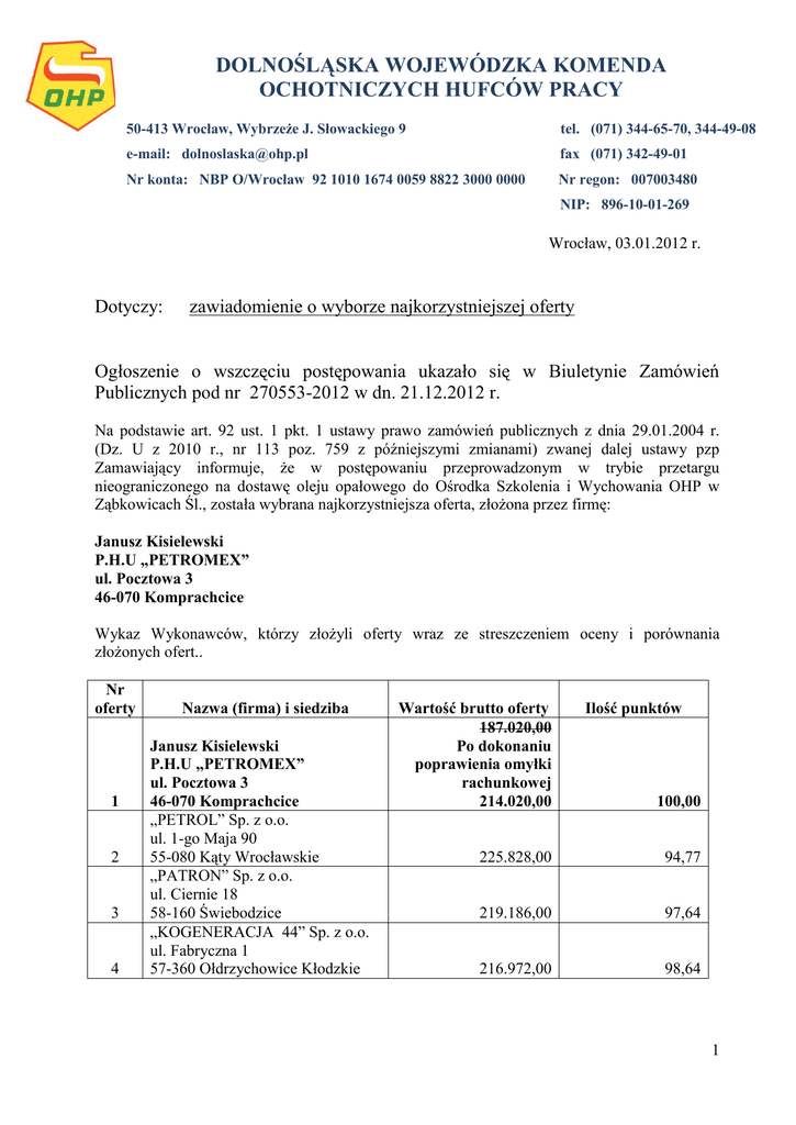 DOLNOŚLĄSKA WOJEWÓDZKA KOMENDA OCHOTNICZYCH HUFCÓW PRACY 50-413 Wrocław, Wybrzeże J. Słowackiego 9 tel. (071) 344-65-70, 344-49-08 e-mail: [email protected] fax (071) 342-49-01 Nr konta: NBP O/Wrocław 92 1010 1674 0059 8822 3000 0000 Nr regon: 007003480 NIP: 896-10-01-269 Wrocław, 03.01.2012 r. Dotyczy: zawiadomienie o wyborze najkorzystniejszej oferty Ogłoszenie o wszczęciu postępowania ukazało się w Biuletynie Zamówień Publicznych pod nr 270553-2012 w dn. 21.12.2012 r. Na podstawie art. 92 ust. 1 pkt. 1 ustawy prawo zamówień publicznych z dnia 29.01.2004 r. (Dz. U z 2010 r., nr 113 poz. 759 z późniejszymi zmianami) zwanej dalej ustawy pzp Zamawiający informuje, że w postępowaniu przeprowadzonym w trybie przetargu nieograniczonego na dostawę oleju opałowego do Ośrodka Szkolenia i Wychowania OHP w Ząbkowicach Śl., została wybrana najkorzystniejsza oferta, złożona przez firmę: Janusz Kisielewski P.H.U „PETROMEX” ul. Pocztowa 3 46-070 Komprachcice Wykaz Wykonawców, którzy złożyli oferty wraz ze streszczeniem oceny i porównania złożonych ofert.. Nr oferty 1 2 3 4 Nazwa (firma) i siedziba Janusz Kisielewski P.H.U „PETROMEX” ul. Pocztowa 3 46-070 Komprachcice „PETROL” Sp. z o.o. ul. 1-go Maja 90 55-080 Kąty Wrocławskie „PATRON” Sp. z o.o. ul. Ciernie 18 58-160 Świebodzice „KOGENERACJA 44” Sp. z o.o. ul. Fabryczna 1 57-360 Ołdrzychowice Kłodzkie Wartość brutto oferty 187.020,00 Po dokonaniu poprawienia omyłki rachunkowej 214.020,00 Ilość punktów 100,00 225.828,00 94,77 219.186,00 97,64 216.972,00 98,64 1 Uzasadnienie wyboru najkorzystniejszej oferty: Jedynym kryterium oceny ofert była cena: 100%. W wyznaczonym terminie do składania ofert wpłynęły dwie oferty. Oferta firmy otrzymała najwyższą ilość punktów tj. 100, Wykonawca ten spełnia warunki udziału w postępowaniu, a złożona przez niego oferta jest zgodna z ustawą prawo zamówień publicznych, oraz Specyfikacją Istotnych Warunków Zamówienia i dlatego też oferta tego Wykonawcy została wybrana jako najkorzystniejsza. Informacja o poprawieniu omyłek w ofertach Zamawiający dokonał na podstawie art. 87 ust. 2 pkt. 2 ustawy prawo zamówień publicznych poprawienia oczywistej omyłki rachunkowej, z uwzględnieniem konsekwencji rachunkowych dokonanych poprawek w ofercie nr 1 złożonej przez P.H.U „PETROMEX” Janusz Kisielewski. W formularzu ofertowym (załącznik nr 1) zostało błędnie przeprowadzone działanie arytmetyczne polegające na mnożeniu ceny jednostkowej netto za 1 litr i ilości 60.000 litrów. W „ofercie” przedstawiono, że 2,90 zł. netto za 1 litr x 60.000 litrów = 147.000,00 zł. netto, a powinno być 174.000,00 zł. netto. Błędnie wyliczona wartość oferty netto spowodowało, że błędnie została wyliczona całkowita wartość zamówienia brutto. Konsekwencją tej zmiany będzie zmiana ogólnej wartości oferty która ulegnie zmianie z kwoty 187.020,00 zł., na kwotę 214.020,00 zł. brutto. Informacja o wykonawcach którzy zostali wykluczeni oraz o ofertach odrzuconych Żaden Wykonawca nie został wykluczony, oraz wszystkie oferty były ważne, nie podlegające odrzuceniu. Informacja o terminie podpisania umowy Na podstawie art. 94 ust. 2 pkt. 3, ustawy pzp. w przypadku gdy nie odrzucono żadnej oferty i nie wykluczono żadnego Wykonawcy, Zamawiający może zawrzeć umowę w terminie krótszym niż 5 dni od dnia przesłania zawiadomienia o wyborze najkorzystniejszej oferty faksem lub mailem. Wypełniając warunek zawarty w art. 92 ust. 1 pkt. 4 ustawy pzp., Dolnośląska Wojewódzka Komenda OHP wyznacza termin podpisania umowy na dzień 07.01.2013 r. 2