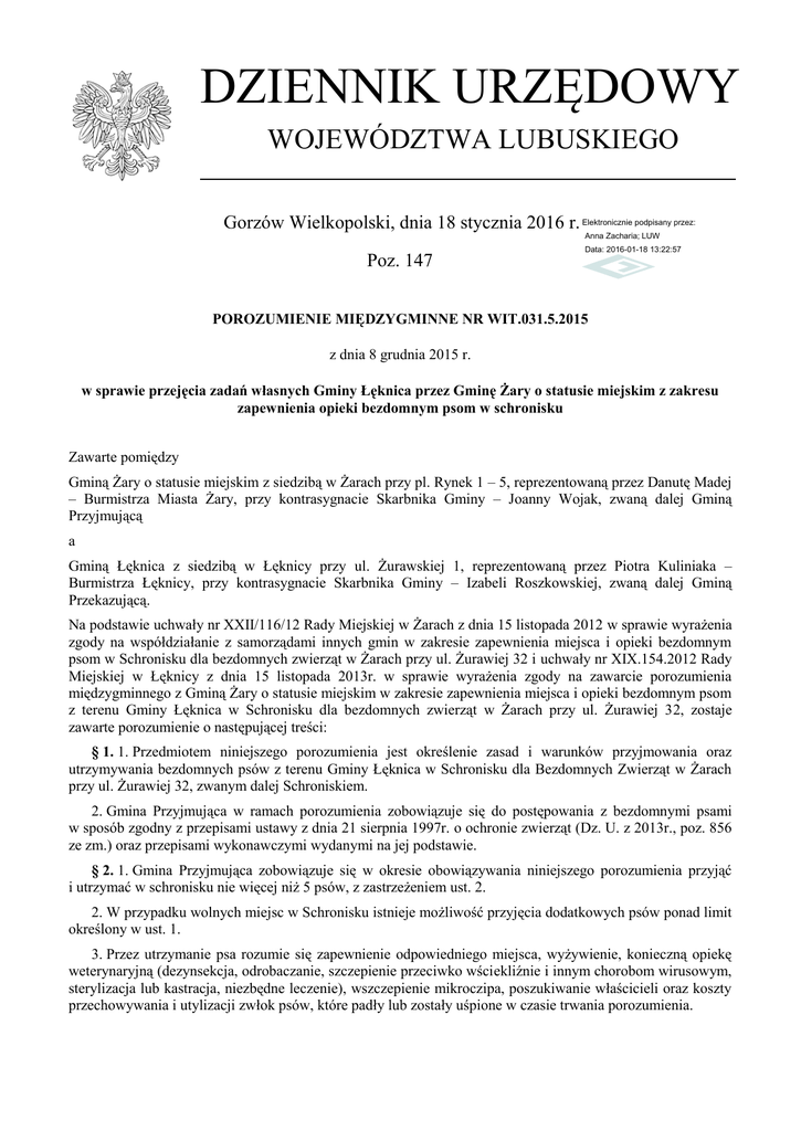 DZIENNIK URZĘDOWY WOJEWÓDZTWA LUBUSKIEGO Gorzów Wielkopolski, dnia 18 stycznia 2016 r. Elektronicznie podpisany przez: Anna Zacharia; LUW Poz. 147 Data: 2016-01-18 13:22:57 POROZUMIENIE MIĘDZYGMINNE NR WIT.031.5.2015 z dnia 8 grudnia 2015 r. w sprawie przejęcia zadań własnych Gminy Łęknica przez Gminę Żary o statusie miejskim z zakresu zapewnienia opieki bezdomnym psom w schronisku Zawarte pomiędzy Gminą Żary o statusie miejskim z siedzibą w Żarach przy pl. Rynek 1 – 5, reprezentowaną przez Danutę Madej – Burmistrza Miasta Żary, przy kontrasygnacie Skarbnika Gminy – Joanny Wojak, zwaną dalej Gminą Przyjmującą a Gminą Łęknica z siedzibą w Łęknicy przy ul. Żurawskiej 1, reprezentowaną przez Piotra Kuliniaka – Burmistrza Łęknicy, przy kontrasygnacie Skarbnika Gminy – Izabeli Roszkowskiej, zwaną dalej Gminą Przekazującą. Na podstawie uchwały nr XXII/116/12 Rady Miejskiej w Żarach z dnia 15 listopada 2012 w sprawie wyrażenia zgody na współdziałanie z samorządami innych gmin w zakresie zapewnienia miejsca i opieki bezdomnym psom w Schronisku dla bezdomnych zwierząt w Żarach przy ul. Żurawiej 32 i uchwały nr XIX.154.2012 Rady Miejskiej w Łęknicy z dnia 15 listopada 2013r. w sprawie wyrażenia zgody na zawarcie porozumienia międzygminnego z Gminą Żary o statusie miejskim w zakresie zapewnienia miejsca i opieki bezdomnym psom z terenu Gminy Łęknica w Schronisku dla bezdomnych zwierząt w Żarach przy ul. Żurawiej 32, zostaje zawarte porozumienie o następującej treści: § 1. 1. Przedmiotem niniejszego porozumienia jest określenie zasad i warunków przyjmowania oraz utrzymywania bezdomnych psów z terenu Gminy Łęknica w Schronisku dla Bezdomnych Zwierząt w Żarach przy ul. Żurawiej 32, zwanym dalej Schroniskiem. 2. Gmina Przyjmująca w ramach porozumienia zobowiązuje się do postępowania z bezdomnymi psami w sposób zgodny z przepisami ustawy z dnia 21 sierpnia 1997r. o ochronie zwierząt (Dz. U. z 2013r., poz. 856 ze zm.) oraz przepisami wykonawczymi wydanymi na jej podstawie. § 2. 1. Gmina Przyjmująca zobowiązuje się w okresie obowiązywania niniejszego porozumienia przyjąć i utrzymać w schronisku nie więcej niż 5 psów, z zastrzeżeniem ust. 2. 2. W przypadku wolnych miejsc w Schronisku istnieje możliwość przyjęcia dodatkowych psów ponad limit określony w ust. 1. 3. Przez utrzymanie psa rozumie się zapewnienie odpowiedniego miejsca, wyżywienie, konieczną opiekę weterynaryjną (dezynsekcja, odrobaczanie, szczepienie przeciwko wściekliźnie i innym chorobom wirusowym, sterylizacja lub kastracja, niezbędne leczenie), wszczepienie mikroczipa, poszukiwanie właścicieli oraz koszty przechowywania i utylizacji zwłok psów, które padły lub zostały uśpione w czasie trwania porozumienia. Dziennik Urzędowy Województwa Lubuskiego –2– Poz. 147 4. Zwierzęta będą dowożone do Schroniska we własnym zakresie przez Gminę Przekazującą i przekazywane pracownikom Administratora Schroniska przez osobę posiadającą stosowne upoważnienie Burmistrza Łęknicy, z zastrzeżeniem ust. 5. 5. Istnieje możliwość zgłoszenia Administratorowi schroniska konieczności transportu psa z terenu Gminy Przekazującej do schroniska pod warunkiem, iż powrót z psem do Schroniska nastąpi do godziny 14.00. 6. Gmina Przekazująca wyraża zgodę na zwrócenie psów właścicielom, na ich adopcję przez nowych właścicieli oraz na ich leczenie, łącznie z wykonaniem niezbędnych zbiegów weterynaryjnych. 7. Jeżeli w trakcie trwania porozumienia zwierzęta pochodzące od Gminy Przekazującej zostaną zwrócone właścicielom, oddane do adopcji, padną lub zostaną uśpione, Gmina Przekazująca może umieścić w Schronisku kolejne zwierzęta, do wysokości limitu ustalonego w ust. 1. 8. Gminie Przekazującej przysługuje prawo do kontroli warunków utrzymywania bezdomnych psów z terenu Gminy Łęknica w Schronisku, po wcześniejszym powiadomieniu Administratora schroniska. § 3. W imieniu Gminy Przyjmującej zadania, o których mowa w § 2, realizowane będą przez Administratora Schroniska, którym jest Zakład Gospodarki Mieszkaniowej Sp. z o.o. z siedzibą w Żarach przy ul. Zakopiańskiej 7. § 4. 1. Gmina Przekazująca, na podstawie noty księgowej wystawionej przez Gminę Przyjmującą, zobowiązuje się do zapłaty kosztów za świadczone usługi wymienione w § 2 według stawek określonych w Zarządzeniu Burmistrza Miasta Żary w sprawie ustalenia cennika usług oraz stawek opłat za adopcję zwierząt oraz opłat związanych z pobytem zwierząt w schronisku dla bezdomnych zwierząt przy ul. Żurawiej 32 w Żarach. Normatywna treść Zarządzenia dotycząca cennika i stawek opłat dla gmin stanowi integralną część Porozumienia jako załącznik. 2. Gmina Przekazująca zobowiązuje się do wniesienia jednorazowej stałej opłaty za gotowość przyjęcia psów do schroniska w wysokości określonej w Zarządzeniu, o którym mowa w ust. 1, na rachunek bankowy Gminy Żary o statusie miejskim w PKO BP SA o numerze: 21 10205402 0000 0302 0313 9037, w ciągu 14 dni od daty otrzymania noty obciążeniowej sporządzonej przez Gminę Przyjmującą. 3. Rozliczenie kosztów przyjęcia i utrzymania psów z terenu Gminy Przekazującej sporządzi dla Gminy Przyjmującej Administrator Schroniska z częstotliwością raz na trzy miesiące. 4. Gmina Przekazująca będzie regulować należność za świadczone usługi, w terminie 14 dni od dnia otrzymania noty obciążeniowej, sporządzonej przez Gminę Przyjmującą na podstawie rozliczenia, o którym mowa w ust. 3, na rachunek bankowy podany w ust. 2. 5. Od nieterminowych wpłat należności naliczone zostaną odsetki ustawowe. § 5. 1. W przypadku nieuregulowania przez Gminę Przekazującą wpłat należności określonych w § 4 ust. 2 i ust. 4 w terminie 30 dni od dnia ich wymagalności, Gmina Przyjmująca ma prawo wypowiedzieć porozumienie w trybie natychmiastowym. 