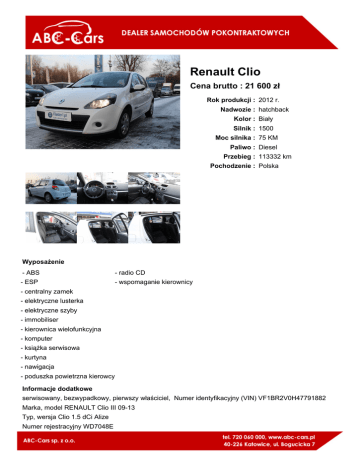 Renault Clio Cena brutto : 21 600 zł Rok produkcji : 2012 r. Nadwozie : hatchback Kolor : Biały Silnik : 1500 Moc silnika : 75 KM Paliwo : Diesel Przebieg : 113332 km Pochodzenie : Polska Wyposażenie - ABS - radio CD - ESP - wspomaganie kierownicy - centralny zamek - elektryczne lusterka - elektryczne szyby - immobiliser - kierownica wielofunkcyjna - komputer - książka serwisowa - kurtyna - nawigacja - poduszka powietrzna kierowcy Informacje dodatkowe serwisowany, bezwypadkowy, pierwszy właściciel, Numer identyfikacyjny (VIN) VF1BR2V0H47791882 Marka, model RENAULT Clio III 09-13 Typ, wersja Clio 1.5 dCi Alize Numer rejestracyjny WD7048E Silnik (rodz./poj./moc) diesel/1461 ccm/55 kW Stan licznika 113 332 km Data 1. rej./rok prod. 22-11-2012 /2012 Data nast. bad. techn. 18-11-2017 Wszelkich informacji na temat pojazdu udzielą handlowcy pod numerem telefonu: ( 720 060 000 ) Zapraszamy do jazdy próbnej i sprawdzenia auta na serwisie. Wszystkie oferowane przez Nas auta, - pochodzą z krajowej sieci dealerskiej, - są serwisowane w autoryzowanych stacjach obsługi, - w bieżącej ofercie handlowej oferujemy ponad 100 używanych samochodów o udokumentowanej historii napraw i przeglądów, - w stałej ofercie posiadamy pełny wybór aut, zarówno pod względem marek, modeli, jak i przebiegów, - z możliwością zakupu za gotówkę lub w leasing, - z możliwością finansowania z Pakietem serwisowo-gwarancyjnym - z możliwością odliczenia VAT ( pełna faktura VAT). Firma ABC-CARS Sp. z o.o., to prężnie rozwijający się, dealer samochodów używanych na terenie Górnego Śląska. Zapraszamy do odwiedzenia Naszej strony internetowej Master1.otomoto.pl. Jesteśmy tak pewni naszych samochodów, że naszym klientom gwarantujemy ich ponowne nabycie jeśli zdecydują się ponownie skorzystać z naszych usług. Co oznacza, że posiadamy centrum samochodowe? U nas można nie tylko kupić samochód. Oferujemy pomoc w kredycie, leasingu i ubezpieczeniu, doposażenie auta w interesujące ich akcesoria już w momencie zakupu, bieżącą obsługę serwisową oraz likwidowanie szkód komunikacyjnych. Zapraszamy do naszego centrum samochodowego w Katowicach na ulicy Bogucickiej 7. Niniejsze ogłoszenie jest wyłącznie informacją handlową i nie stanowi oferty w myśl art. 66, § 1. Kodeksu Cywilnego. Sprzedający nie odpowiada za ewentualne błędy lub nieaktualność ogłoszenia.