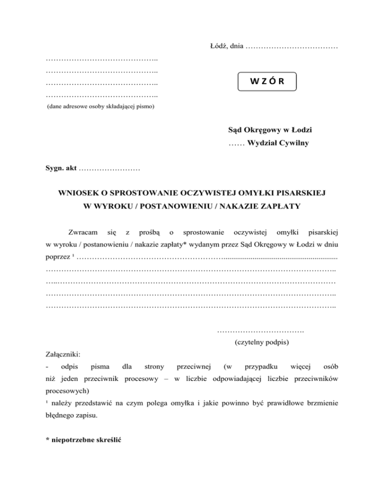 Łódź, dnia ……………………………… …………………………………….. …………………………………….. WZÓR …………………………………….. …………………………………….. (dane adresowe osoby składającej pismo) Sąd Okręgowy w Łodzi …… Wydział Cywilny Sygn. akt …………………… WNIOSEK O SPROSTOWANIE OCZYWISTEJ OMYŁKI PISARSKIEJ W WYROKU / POSTANOWIENIU / NAKAZIE ZAPŁATY Zwracam się z prośbą o sprostowanie oczywistej omyłki pisarskiej w wyroku / postanowieniu / nakazie zapłaty* wydanym przez Sąd Okręgowy w Łodzi w dniu poprzez ¹ …………………………………………………........................................................... ………………………………………………………………………………………………….. …..……………………………………………………………………………………………… ………………………………………………………………………………………………….. ………………………………………………………………………………………………….. ……………………………. (czytelny podpis) Załączniki: - odpis pisma dla strony przeciwnej (w przypadku więcej osób niŜ jeden przeciwnik procesowy – w liczbie odpowiadającej liczbie przeciwników procesowych) ¹ naleŜy przedstawić na czym polega omyłka i jakie powinno być prawidłowe brzmienie błędnego zapisu. * niepotrzebne skreślić