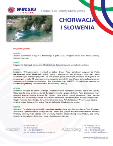 CHORWACJA I SŁOWENIA Program wycieczki: DZIEŃ 1 Zbiórka uczestników i wyjazd z Kołobrzegu o godz. 21:00. Przejazd nocny przez Polskę, Czechy, Austrię, Słowenię. DZIEŃ 2 Przyjazd do Chorwacji wieczorem. Obiadokolacja. Zakwaterowanie na nocleg tranzytowy. DZIEŃ 3 Śniadanie. Wykwaterowanie i wyjazd w dalszą drogę. Przed południem przyjazd do Parku Narodowego Jezior Plitwickich. Spacer jedną z widokowych tras wiodących przez park pełen oszałamiających widoków przyrody - 16 turkusowych jezior położonych tarasowo na długości 8 km połączonych ze sobą 72 wodospadami w otoczeniu wzniesień i lasu. Obszar parku zaliczany jest do światowego dziedzictwa naturalnego i jest chroniony przez UNESCO. Po zwiedzaniu przejazd na Kasztelańską Riwierę. Zakwaterowanie, obiadokolacja i nocleg. DZIEŃ 4 Śniadanie. Przejazd do Splitu – jednego z większych miast wybrzeża Chorwacji, słynie ono z portu, który jest dla kraju oknem na świat. Zwiedzanie miasta z przewodnikiem: Pałac Dioklecjana, mury obronne, Brązowa Brama, Katedra Św. Dujama, Złota Brama, pomnik Grzegorza z Ninu, Kwartał Wenecki, Riva – nabrzeże palmowe. Po południu zwiedzanie z przewodnikiem malowniczego miasta Trogir: Twierdza Kamerlengo z XV w., Brama Morska, Stary Port, Katedra św. Wawrzyńca, plac Jana Pawła II, Loggia Sądowa. Czas wolny. Powrót do hotelu. Obiadokolacja, nocleg. DZIEŃ 5 Śniadanie. Po śniadaniu wyjazd w kierunku Dubrownika miasta określanego mianem Perły Adriatyku. Zwiedzanie z przewodnikiem Starego Miasta - Brama Pile, gotycki klasztor Franciszkanów, kolumna Orlando, katedra, Pałac Sponza z XVI w., mury miejskie, spacer słynną ulicą Stradun, czas wolny. Powrót na Kasztelańską Rivierę do hotelu. Obiadokolacja. Nocleg. DZIEŃ 6 Śniadanie. Przejazd do Szybenika, miasta o czysto chorwackim rodowodzie, zbudowanego przez chorwackich królów tysiąc lat temu. Zwiedzanie miasta z przewodnikiem, m. in.: XV-wieczna katedra Św. Jakuba wpisana na Listę Światowego Dziedzictwa Kulturowego UNESCO, spacer przez ogrody miejskie, przejście przez starówkę, trasa wiedzie klimatycznymi, wąskimi i krętymi uliczkami. Po zwiedzaniu chwila czasu wolnego. Przejazd do Parku Narodowego Wodospadów rzeki Krka. Spacer malowniczą trasą krajoznawczą wśród rozlewisk, jezior i wodospadów rzeki Krka. Powrót do hotelu. Obiadokolacja i nocleg. DZIEŃ 7 Wczesne śniadanie. Wykwaterowanie i wyjazd w kierunku Słowenii. Przyjazd do miejscowości Postojna. Zwiedzanie jaskini, trasa wiedzie przez kilka sal i grot ozdobionych naturalną szatą naciekową. Zobaczymy m.in. Salę Spaghetti, 5-cio metrowy stalagmit ”Brylant”, osobliwe stworzenie zamieszkujące jaskinię – Odmieniec Jaskiniowy. Przejazd na nocleg tranzytowy. Obiadokolacja. Zakwaterowanie, nocleg. DZIEŃ 8 Wczesne śniadanie i całodzienny przejazd w kierunku Polski. Powrót do Kołobrzegu w nocy ok. 03:00. Program imprezy jest ramowy, kolejność zwiedzania może ulec zmianie. LICZBA UCZESTNIKÓW CENA ZA OSOBĘ 49 1488 ZŁ 45 1539 ZŁ 40 1605 ZŁ Świadczenia zawarte w cenie: transport komfortowym autokarem (klimatyzacja, DVD, barek, WC); 6 noclegów w hotelach** w pokojach 2-osobowych z łazienką; wyżywienie: 6 śniadań i 6 obiadokolacji; opieka pilota; ubezpieczenie KL i NNW. Cena nie zawiera: biletów wstępu do zwiedzanych obiektów, usług miejscowych przewodników, taksy klimatycznej w Chorwacji, opłaty wjazdowej do Dubrownika; koszt pakietu 50 EUR płatny obowiązkowo u pilota grupy; napojów do obiadokolacji, płatne indywidualnie.