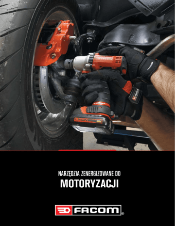 NARZĘDZIA ZENERGIZOWANE DO MOTORYZACJI Kompletne RO narzędziowe 95 lat innowacji Od samego początku celem firmy FACOM był kontakt z profesjonalistami, aby umożliwić produkcję narzędzi, które przekroczą ich oczekiwania, wyposażonych równocześnie w funkcje powodujące, że codzienne zadania staną się łatwiejsze i bezpieczniejsze. Ta podstawowa filozofia stanowi główną siłę napędową marki Facom. Obecnie firma FACOM jest wiodącą europejską marką narzędzi z asortymentem ponad 9000 produktów, obejmujących przechowywanie (wózki, szafy, stoły warsztatowe, przechowywanie przenośne), narzędzia standardowe (klucze, wkrętaki, szczypce, młotki, narzędzia pneumatyczne) oraz narzędzia specjalistyczne (samochodowe, elektryczne, lotnicze) spełniające potrzeby wszystkich profesjonalnych użytkowników narzędzi. 2 95 lat projektowania i produkcji Firma FACOM jest miedzynarodową marką projektującą i produkującą narzędzia uznawane za najlepsze w swojej branży. Produkujemy zgodnie z najwyższymi standardami jakości, prawdziwie profesjonalne narzędzia ręczne oraz zenergizowane dużywane przez profesjonalistów na całym świecie. W celu zapewnienia najwyższej jakości usług, w naszych zespołach projektowych i dziale badawczorozwojowym pracuje ponad 250 inżynierów, działających w 10 odrębnych biurach wyznaczonych do rozwijania produktów Facom. Wszystkie prace i wysiłki w dziedzinie badań i rozwoju nad coraz wydajnieszymi produktami o coraz wyższej jakości przenoszone są do 12 zakładów produkcyjnych w Europie, aby dostarczyć produkt idealny. OZWIĄZANIA www.facom.com 3 Gama produkt zenergizowan Szeroki asortyment produktów wraz z akcesoriami AKUMULATORY ZAMIENNE Dewalt® Dzięki ponad 95-letniemu doświadczeniu w branży motoryzacyjnej i przemysłowej, firma FACOM rozwinęła bogaty asortyment narzędzi z napędem, spełniających szeroki zakres wymagań dla różnych prac, obejmujących: • ogólną naprawę samochodów, • wymianę opon, • naprawy blacharskie, • konserwację samochodów ciężarowych, autobusów i sprzętu rolniczego, • pomoc techniczną z dojazdem (usuwanie awarii). 4 Nasze narzędzia bezprzewodowe wykorzystują obecnie nową platformę akumulatorów litowo-jonowych najwyższej jakości. Platforma ta wykorzystuje technologię naszej siostrzanej firmy DeWALT®. Oznacza to, że w przypadku posiadania już narzędzi DeWALT® wykorzystujących ten format akumulatorów, można zamieniać akumulatory między nimi, pod warunkiem zgodności napięcia. tów nych KOMPLETNY PAKIET USŁUG INSTRUKCJE OBSŁUGI I CZĘŚCI ZAMIENNYCH ONLINE Firma FACOM standardowo udziela 2-letniej gwarancji na wszystkie narzędzia pneumatyczne. Elektronarzędzia są objęte gwarancją 3-letnią (konieczna rejestracja online). Akumulatory i ładowarki są objęte gwarancją roczną. Gwarancja ta odzwierciedla nasze zobowiązanie do dostarczania użytkownikom produktów wysokiej jakości. Firma FACOM oferuje również rozbudowaną paneuropejską sieć warsztatów naprawczych – aby uzyskać więcej informacji, prosimy o kontakt ze sprzedawcą. www.facom.com Instrukcje obsługi można znaleźć na stronie internetowej www.facom.com. Znajdują się na niej również szczegółowe rysunki i opisy części zamiennych dostępnych dla narzędzi FACOM. Te podstawowe zasoby referencyjne można znaleźć na stronie internetowej www.facom.com/support. 5 SPIS TREŚCI Klucze udarowe . . . . . . . 9 Grzechotki . . . . . . . . . . . 22 Dokrętarki Szlifierki . . . . . . . . . . . 26 . . . . . . . . . . . . . 28 Polerki . . . . . . . . . . . . . . . 33 Wiertarki . . . . . . . . . . . . 39 Piły . . . . . . . . . . . . . . . . . . 41 Narzędzia specjalistyczne NARZEDZIA ZENERGIZOWANE DO . . . . . . MOTORYZACJI 43 Akcesoria . . . . . . . . . . . . 47 KOMPLETNY KATALOG FACOM ZAWSZE POD RĘKĄ Aby uzyskać dostęp do szerszych informacji o produkcie i filmów pokazowych, za pomocą smartfona zeskanuj kody QR na stronach niniejszego katalogu. 6 ODKRYWAJ NOWE PRODUKTY NA KADEJ STRONIE... PRZEGLĄDAJ I SZUKAJ INTUICYJNIE... SZYBKI DOSTĘP WSZĘDZIE GDZIE JESTEŚ... Kluc Klucze ze udarowe uda ro we www.facom.com 7 KLUCZE UDAROWE KLUCZE UDAROWE SĄ JEDNYMI Z NAJLEPSZYCH I NAJSKUTECZNIEJSZYCH NARZĘDZI NA RYNKU DO SZYBKIEGO ODKRĘCANIA/DOKRĘCANIA NAKRĘTEK I ŚRUB I SĄ WYKORZYSTYWANE RÓWNIE DO LICZNYCH INNYCH ZASTOSOWAŃ. SILNIEJSZE NIŻ TRADYCYJNE NARZĘDZIA RĘCZNE, TAKIE JAK KLUCZE, CZY GRZECHOTKI, KLUCZE UDAROWE SĄ PRZEZNACZONE DO LUZOWANIA NAKRĘTEK ZA POMOCĄ SYSTEMU BIJAKÓW. FIRMA FACOM WYKORZYSTUJE 3 NASTĘPUJĄCE RODZAJE MECHANIZMÓW UDAROWYCH W ZALEŻNOŚCI OD ZASTOSOWANIA I SPOSOBU UŻYWANIA KLUCZA: TWIN HAMMER (MŁOTEK PODWÓJNY) • Silny i bardzo niezawodny system udarowy. JUMBO • Trwały mechanizm udarowy wymagający mniej konserwacji niż mechanizm “Twin Hammer”, ale generujący niższy moment dokręcania. DOUBLE HAMMER (MŁOTEK PODWÓJNY) • Dwa młotki obudowane silną klatką, zapewniające wysoką prędkość. • Doskonały do zastosowań z niskim momentem dokręcania. MOC KLUCZA UDAROWEGO MOŻE SIĘ ZMIENIAĆ W ZALEŻNOŚCI OD 3 PONIŻSZYCH CZYNNIKÓW: Sposób mocowania • Moc może spadać nawet o 50% przy mocowaniu sprężystym. System zasilania • Ciśnienie, wydatek powietrza, średnica przewodu zasilającego mogą spowodować spadek mocy o 50%. - Ciśnienie powietrza: min. 6,2 bar na wlocie powietrza do narzędzia, przy narzędziu pracującym z pełną prędkością. - Wydatek powietrza: wyższy niż wydatek narzędzia -> moc narzędzia. - Średnica wewnętrzna złącza (np. 6,5 mm dla narzędzi 1/2”). - Wylot powietrza: moc narzędzia, prędkość narzędzia. Akcesoria • Przedłużacze, złącza uniwersalne i inne akcesoria mogą prowadzić do spadku mocy przekraczającej 50%. Przewodnik doboru kluczy udarowych M5 Model / nazwa NJ.1400F2 NJ.1300F2 NJ.A1700F2 NS.A1700F2 CL3.C10J CL3.C10S NJ.2000F2 NJ.3000F NS.1500F2 NS.2000F CL3