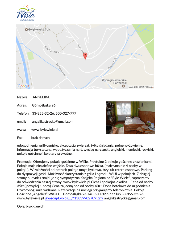 Nazwa: ANGELIKA Adres: Górnośląska 26 Telefon: 33-855-32-26, 500-327-777 email: [email protected] www: www.bylewiele.pl Fax: brak danych udogodnienia: grill/ognisko, akceptacja zwierząt, tylko śniadania, pełne wyżywienie, informacja turystyczna, wypożyczalnia nart, wyciąg narciarski, angielski, niemiecki, rosyjski, pokoje gościnne i kwatery prywatne. Promocje: Oferujemy pokoje gościnne w Wiśle. Przytulne 2 pokoje gościnne z łazienkami. Pokoje mają niezależne wejście. Dwa dwuosobowe łóżka, (maksymalnie 4 osoby w pokoju). W zależności od potrzeb pokoje mogą być dwu, trzy lub cztero osobowe. Parking do dyspozycji gości. Możliwość skorzystania z grilla i ogrodu. Wi-fi w pokojach. Z drugiej strony budynku znajduje się sympatyczna Knajpka Regionalna "Byle Wiele", zapraszamy do odwiedzenia naszej strony: www.bylewiele.pl Cicha i spokojna okolica. Cena od osoby 35zł ( powyżej 1 nocy) Cena za jedną noc od osoby 40zł. Doba hotelowa do uzgodnienia. Czworonogi mile widziane. Rezerwacje na noclegi przyjmujemy telefonicznie. Pokoje Gościnne „Angelika” Wisła Ul. Górnośląska 26 +48-500-327-777 lub 33-855-32-26 www.bylewiele.pl javascript:void(0);/*1383990270952*/ [email protected] Opis: brak danych