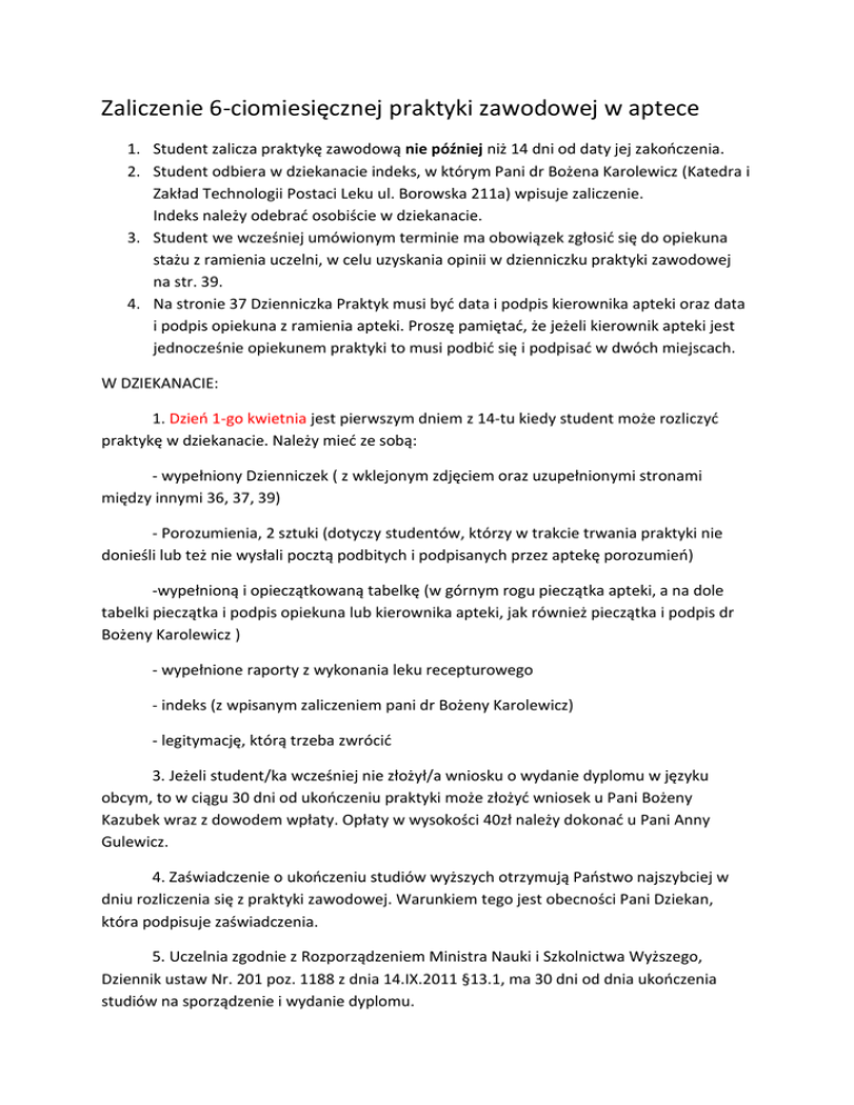 Zaliczenie 6-ciomiesięcznej praktyki zawodowej w aptece 1. Student zalicza praktykę zawodową nie później niż 14 dni od daty jej zakończenia. 2. Student odbiera w dziekanacie indeks, w którym Pani dr Bożena Karolewicz (Katedra i Zakład Technologii Postaci Leku ul. Borowska 211a) wpisuje zaliczenie. Indeks należy odebrać osobiście w dziekanacie. 3. Student we wcześniej umówionym terminie ma obowiązek zgłosić się do opiekuna stażu z ramienia uczelni, w celu uzyskania opinii w dzienniczku praktyki zawodowej na str. 39. 4. Na stronie 37 Dzienniczka Praktyk musi być data i podpis kierownika apteki oraz data i podpis opiekuna z ramienia apteki. Proszę pamiętać, że jeżeli kierownik apteki jest jednocześnie opiekunem praktyki to musi podbić się i podpisać w dwóch miejscach. W DZIEKANACIE: 1. Dzień 1-go kwietnia jest pierwszym dniem z 14-tu kiedy student może rozliczyć praktykę w dziekanacie. Należy mieć ze sobą: - wypełniony Dzienniczek ( z wklejonym zdjęciem oraz uzupełnionymi stronami między innymi 36, 37, 39) - Porozumienia, 2 sztuki (dotyczy studentów, którzy w trakcie trwania praktyki nie donieśli lub też nie wysłali pocztą podbitych i podpisanych przez aptekę porozumień) -wypełnioną i opieczątkowaną tabelkę (w górnym rogu pieczątka apteki, a na dole tabelki pieczątka i podpis opiekuna lub kierownika apteki, jak również pieczątka i podpis dr Bożeny Karolewicz ) - wypełnione raporty z wykonania leku recepturowego - indeks (z wpisanym zaliczeniem pani dr Bożeny Karolewicz) - legitymację, którą trzeba zwrócić 3. Jeżeli student/ka wcześniej nie złożył/a wniosku o wydanie dyplomu w języku obcym, to w ciągu 30 dni od ukończeniu praktyki może złożyć wniosek u Pani Bożeny Kazubek wraz z dowodem wpłaty. Opłaty w wysokości 40zł należy dokonać u Pani Anny Gulewicz. 4. Zaświadczenie o ukończeniu studiów wyższych otrzymują Państwo najszybciej w dniu rozliczenia się z praktyki zawodowej. Warunkiem tego jest obecności Pani Dziekan, która podpisuje zaświadczenia. 5. Uczelnia zgodnie z Rozporządzeniem Ministra Nauki i Szkolnictwa Wyższego, Dziennik ustaw Nr. 201 poz. 1188 z dnia 14.IX.2011 §13.1, ma 30 dni od dnia ukończenia studiów na sporządzenie i wydanie dyplomu.